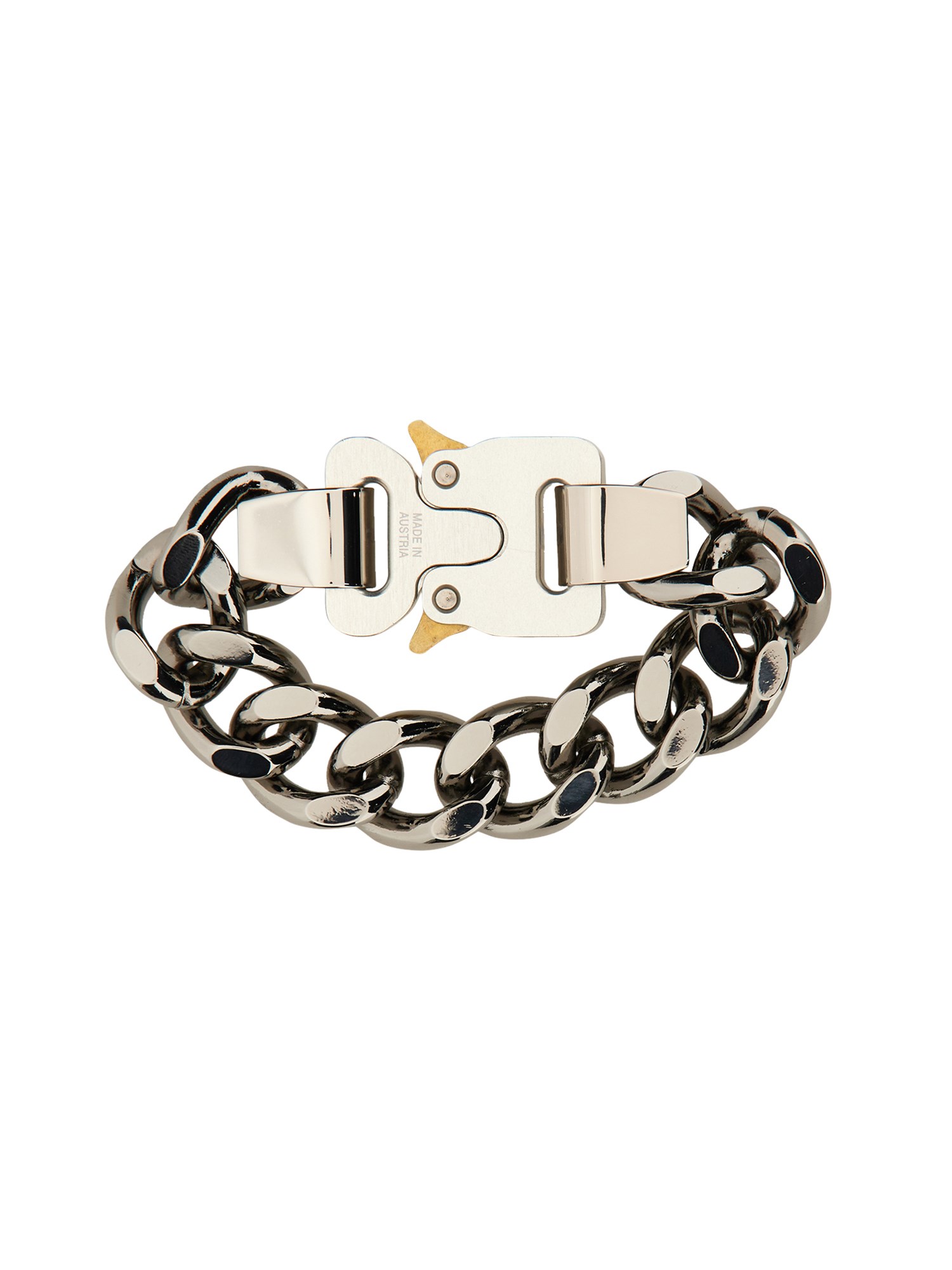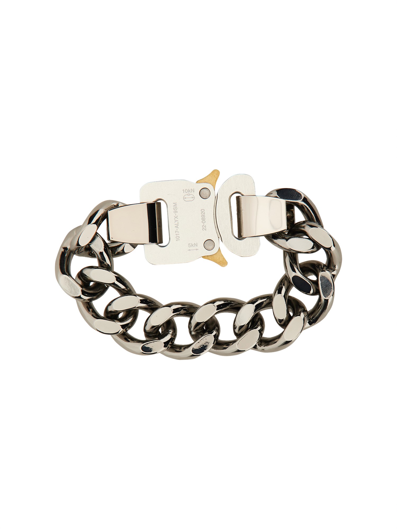 The iconic carabiner aluminium chain bracelet from 1017 ALYX 9SM is made from durable aluminium, which is a lightweight metal that is resistant to corrosion. The chain is thick, making it durable and long-lasting. The chain can be shortened or lengthened depending on your preference.