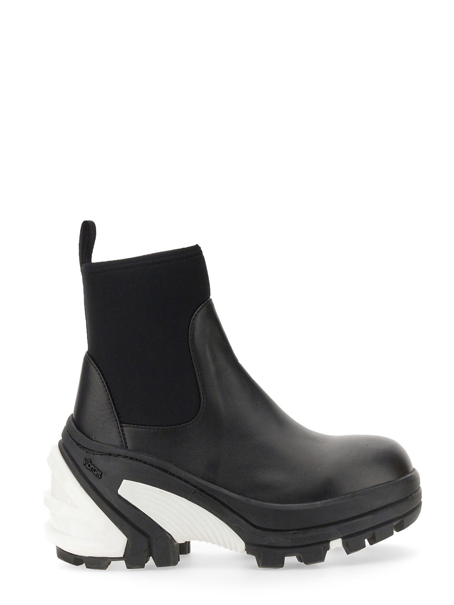 The one-of-a-kind leather boots from 1017 ALYX 9SM are made of 100% natural leather and have a durable Vibram rubber sole. The leather boots have a raised rubber toe cap, a contrast coloured leather back and a neoprene upper. The style of the boot is minimal, while still maintaining its strength.