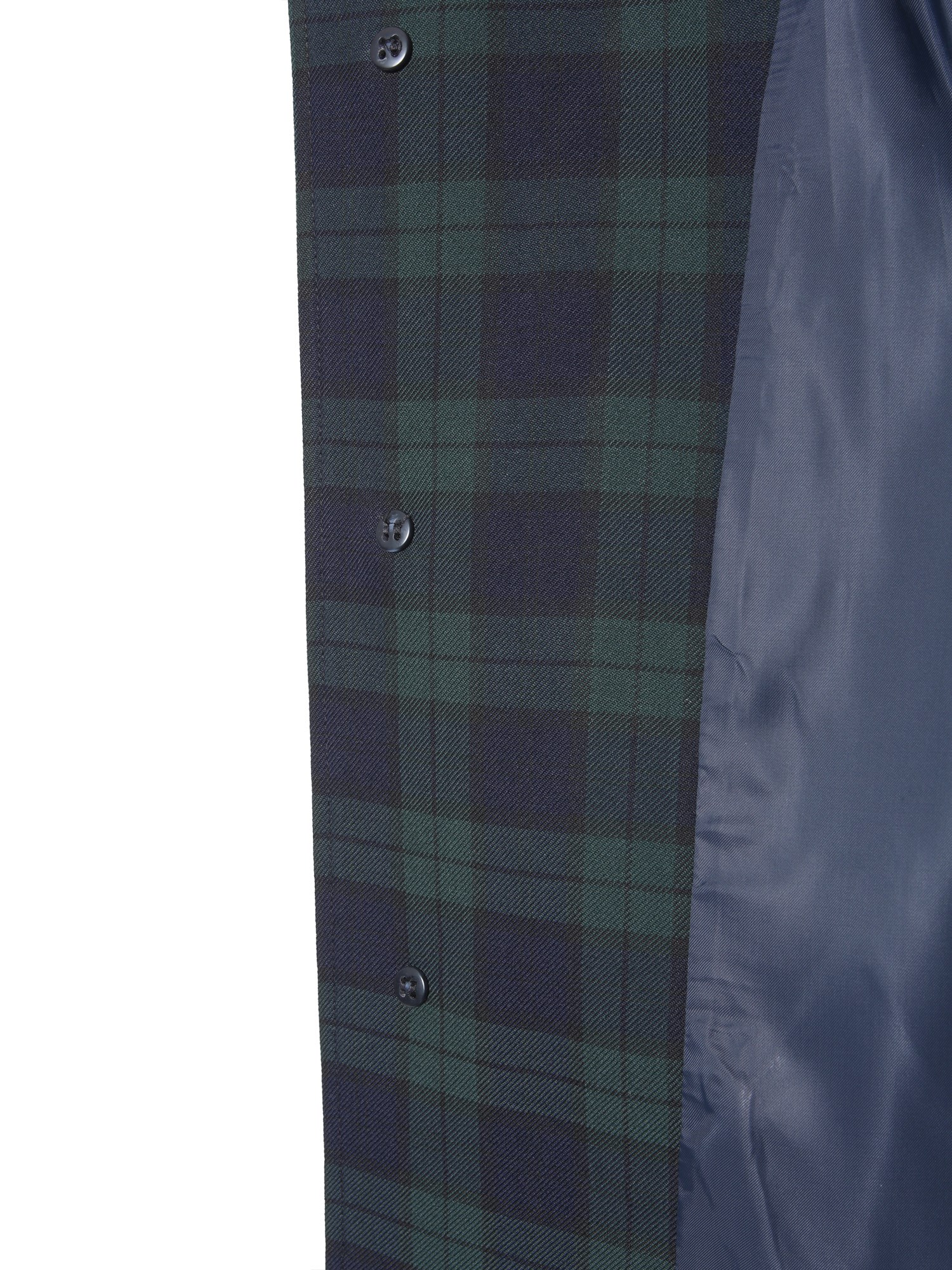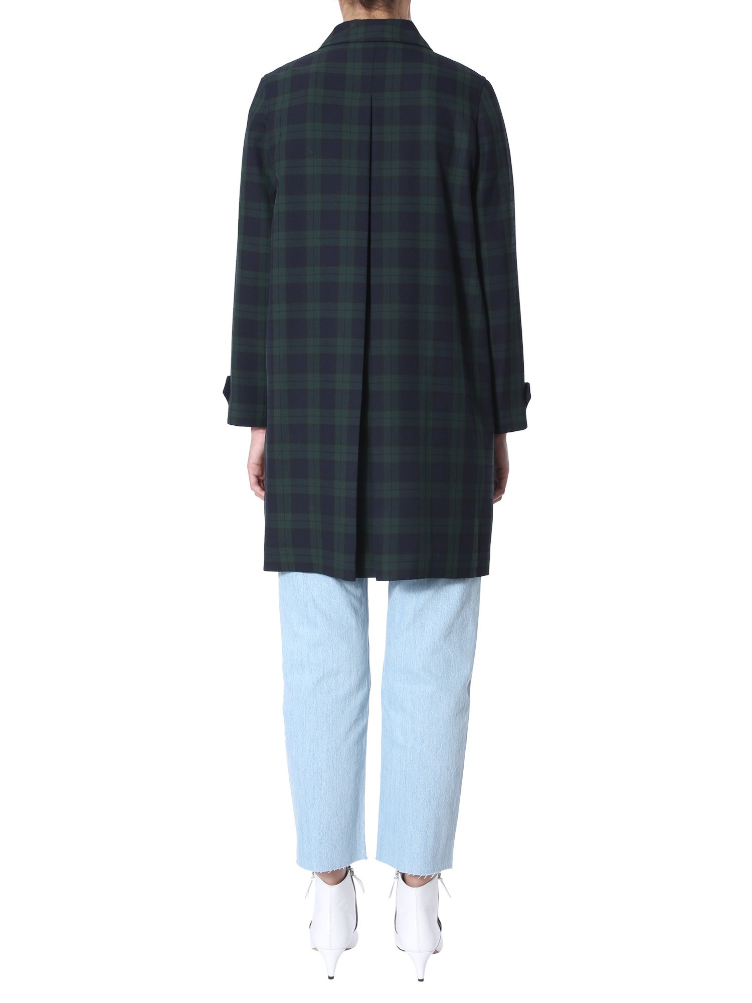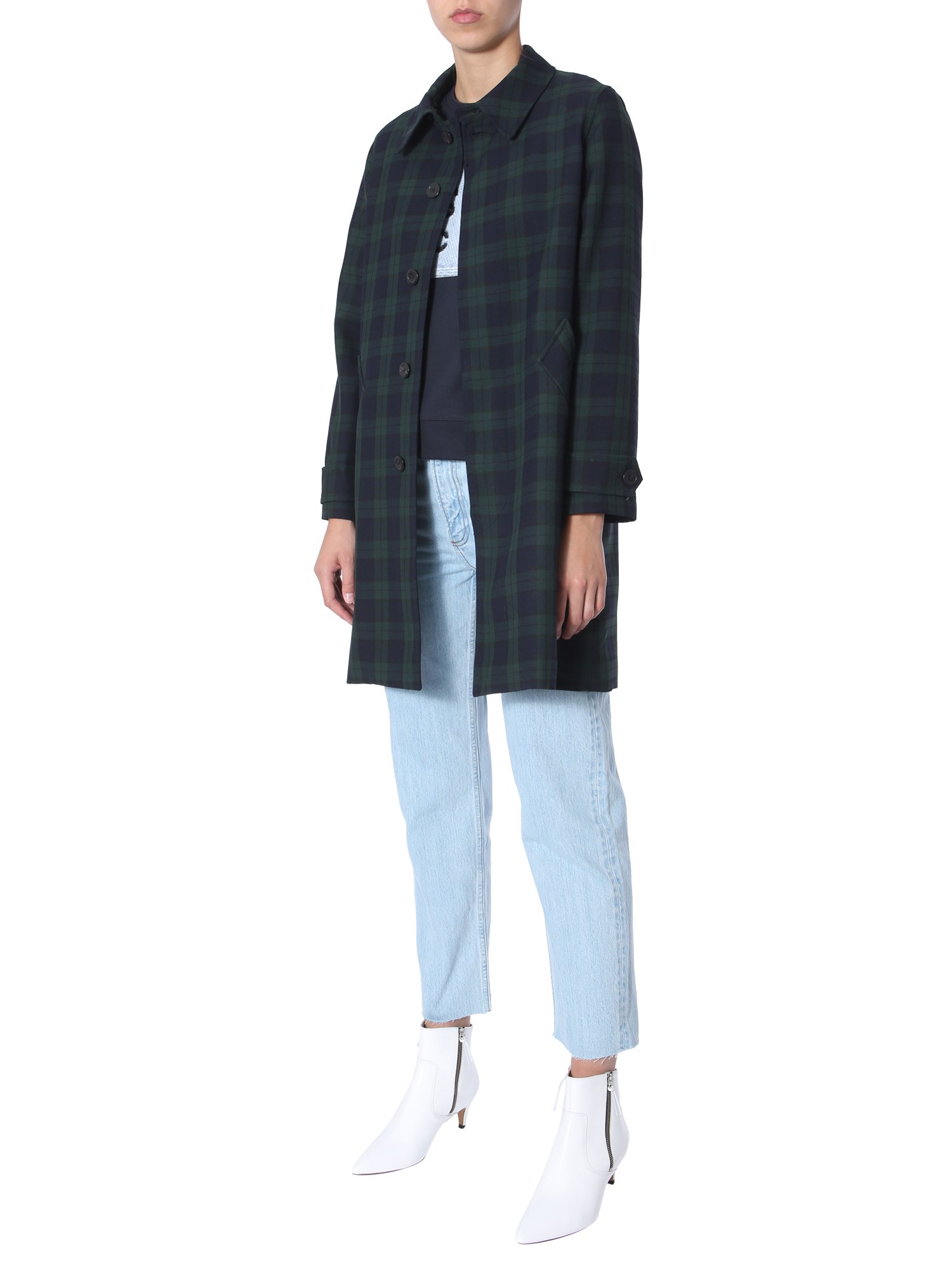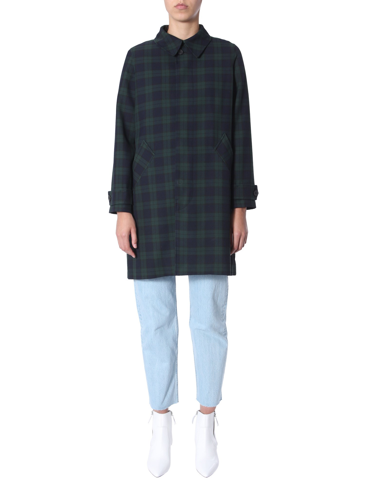Ensure utmost warmth to your body by wearing this dinarc mac trench from the collection of A.P.C. Having an all-over checked pattern, this trench has a stylish appearance. It is crafted from a blend of polyester and viscose that ensures durability and water resistance. It features a pointed collar design with hidden-button closure for a comfortable fit.