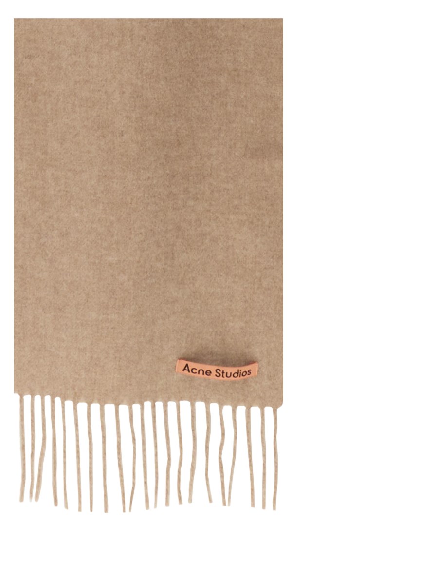 Acne Studios oatmeal melange fringed scarf is detailed with a pink Acne Studios label, crafted from midweight wool.