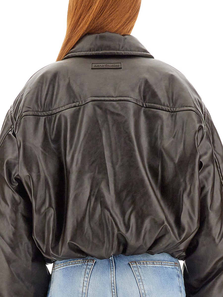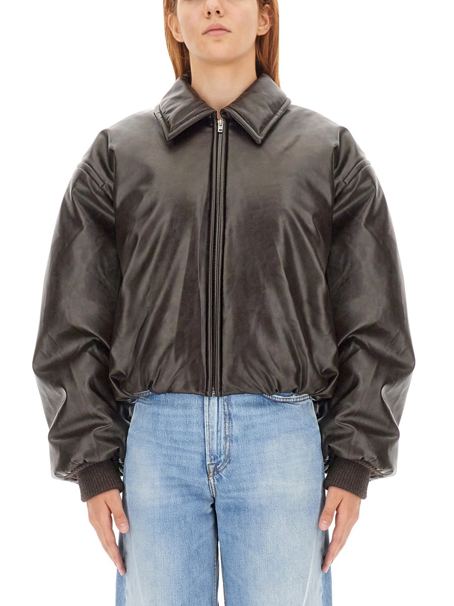 Acne Studios dark brown bomber jacket is crafted from a lightweight jersey based with coated finish. Complete with a zippered closure, side pockets, and Acne Studios logo on the back. Cut to a relaxed fit with dropped shoulders and hip length.