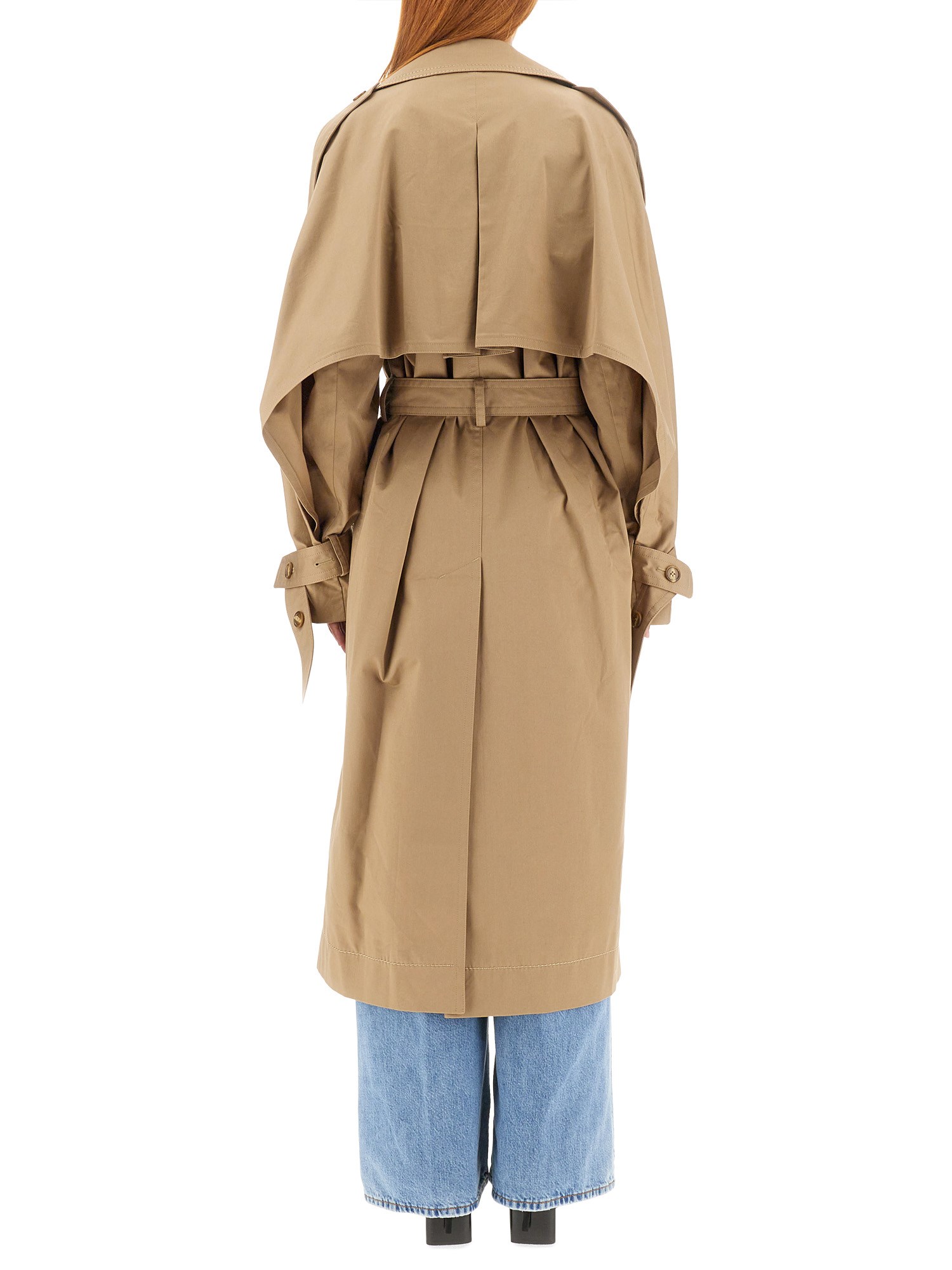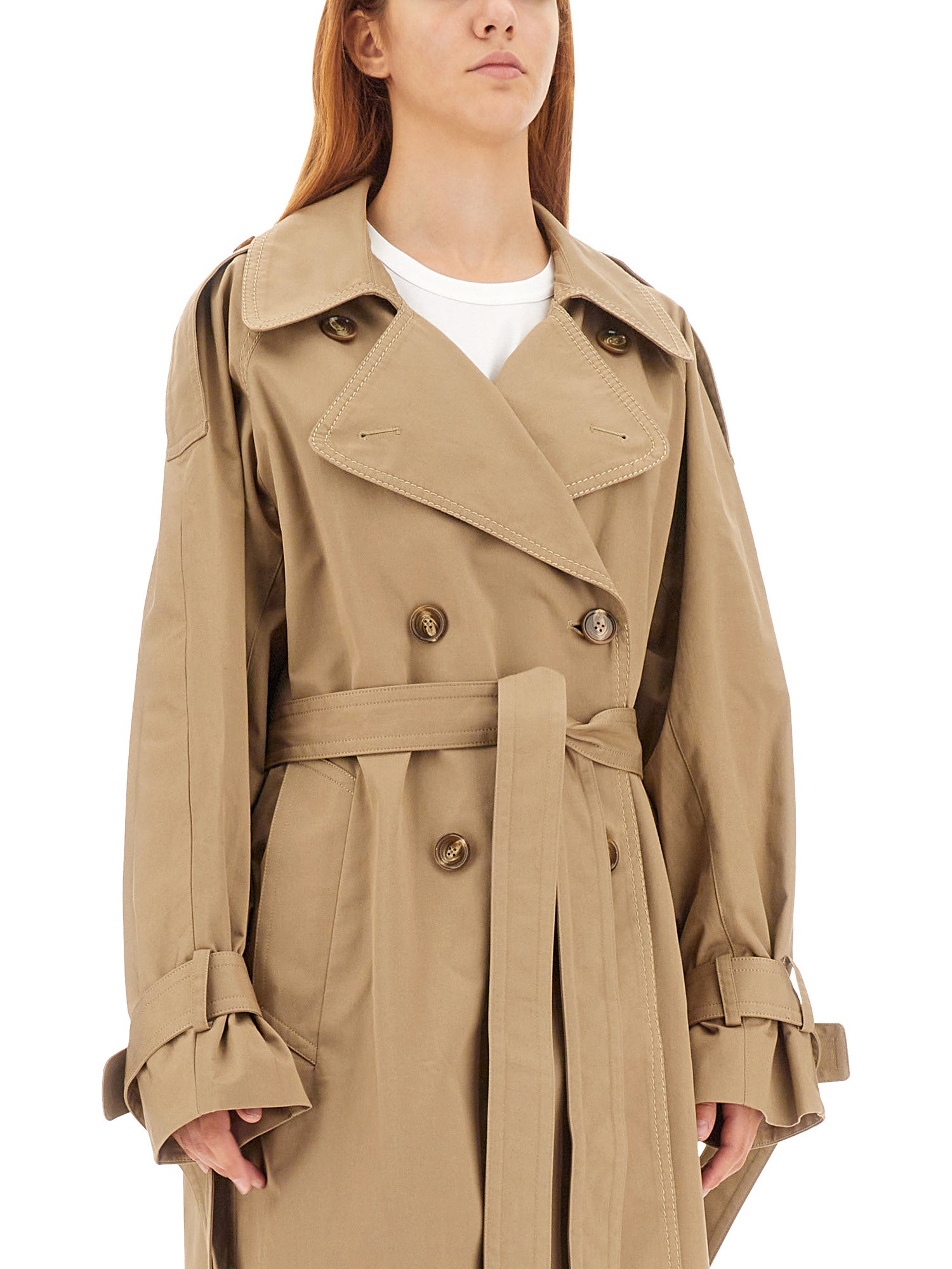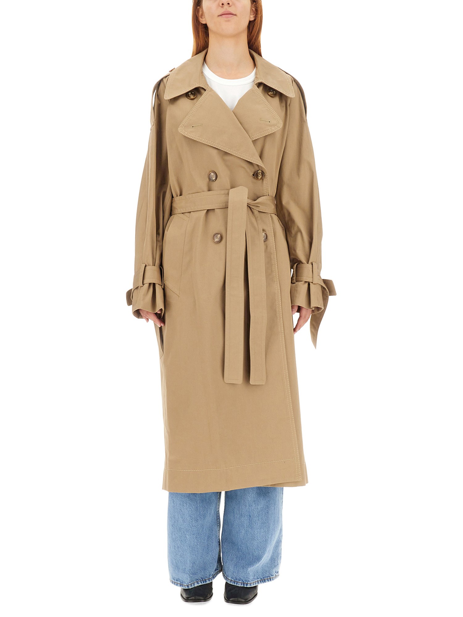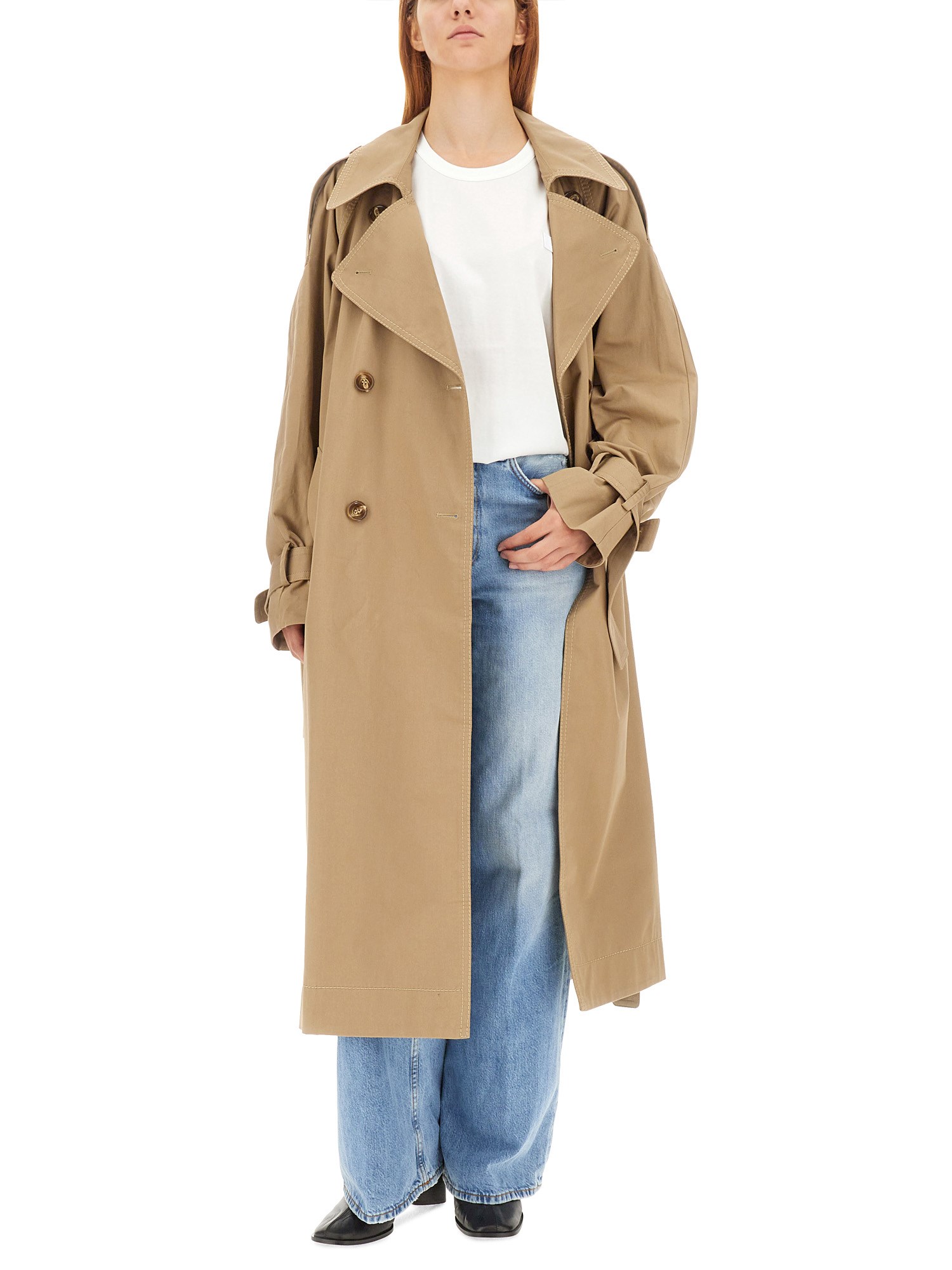 Acne Studios cold beige double-breasted trench coat is crafted from cotton twill, with a front button and knotted belt closure. Detailed with raglan sleeves, pleated inserts at the back and welt pockets. Cut to an exaggerated fit with a mid-length.
