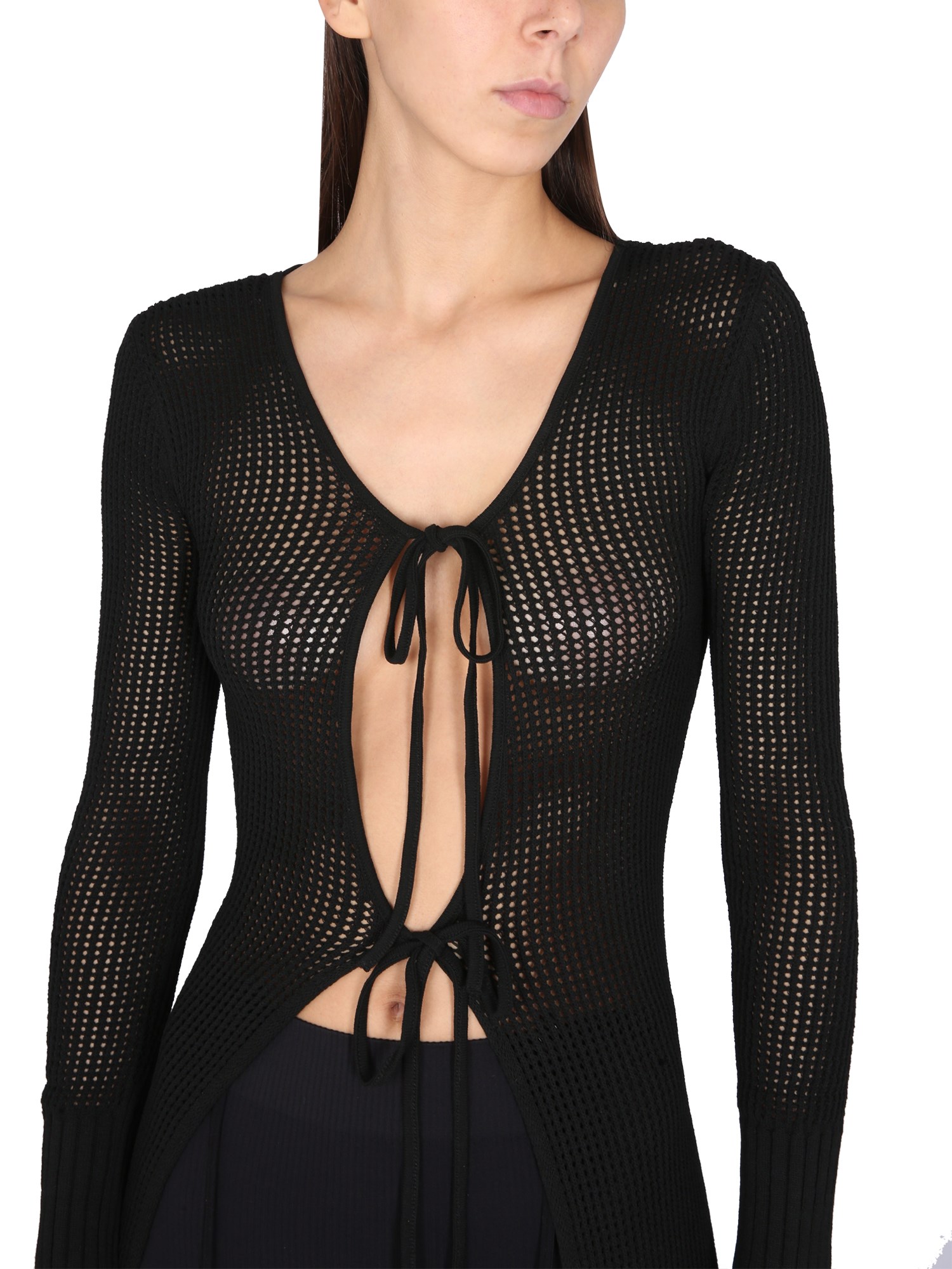 The viscose-long perforated sweater from Andreadamo is a beautifully designed piece that is sure to turn heads. This sweater is made from a stretchy and super soft viscose fabric that is perfect for year-round wear. It has a slim fit and features a V-neckline, long sleeves, and front closure with adjustable laces.