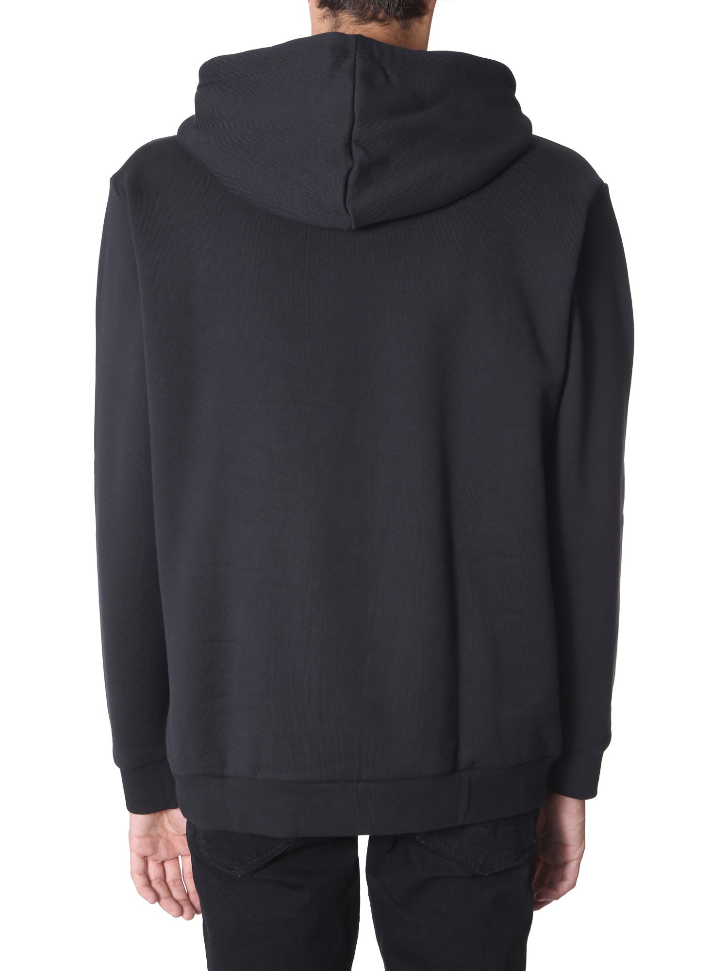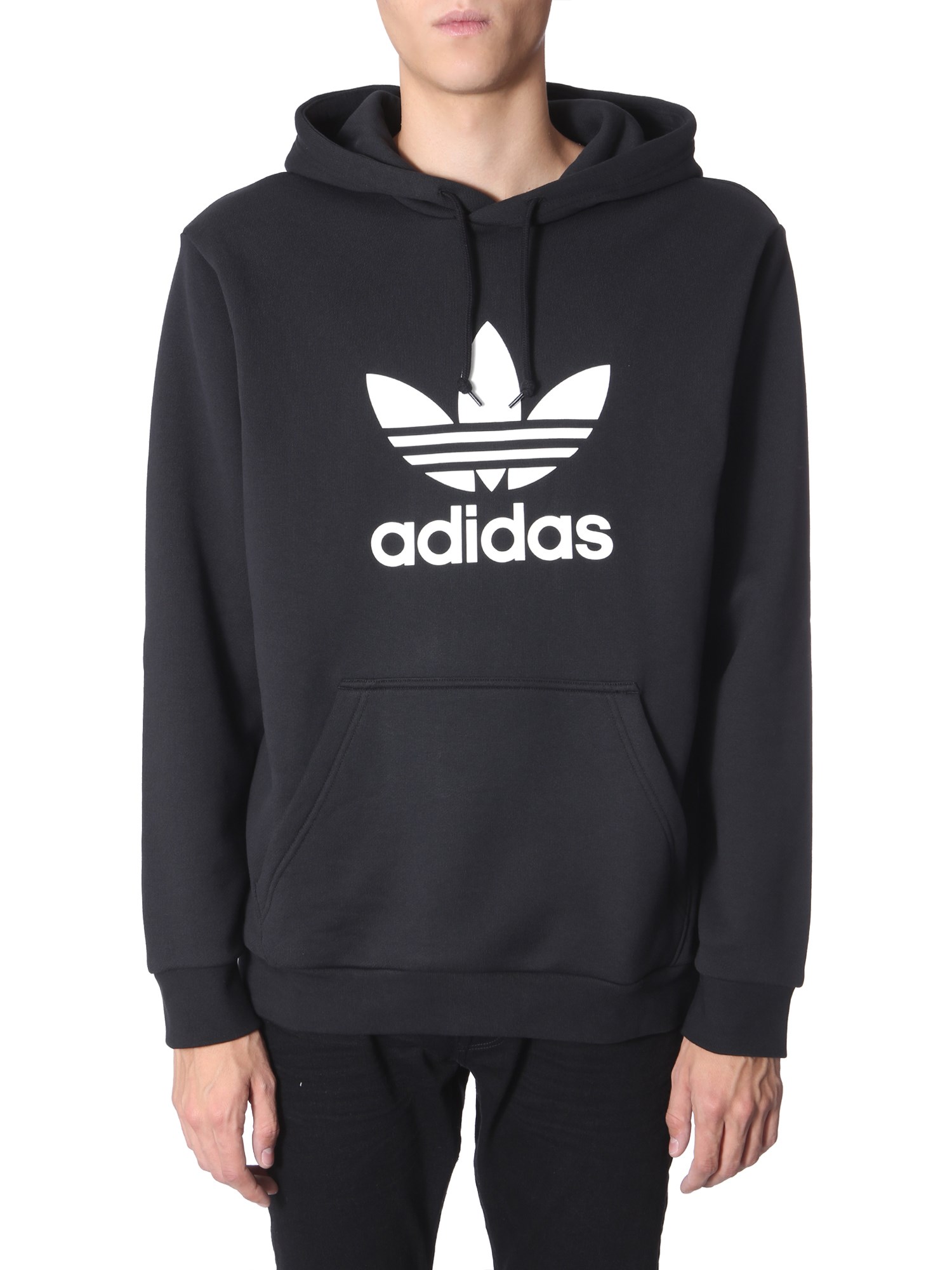 Upgrade your winter wardrobe with this hooded sweatshirt from Adidas Originals. It has a hooded neckline and ribbed panels at the cuffs and hem. The use of fine quality cotton in its manufacture assures premium comfort and breathability. The Adidas signature is printed at the front that looks good with its dark colour scheme.