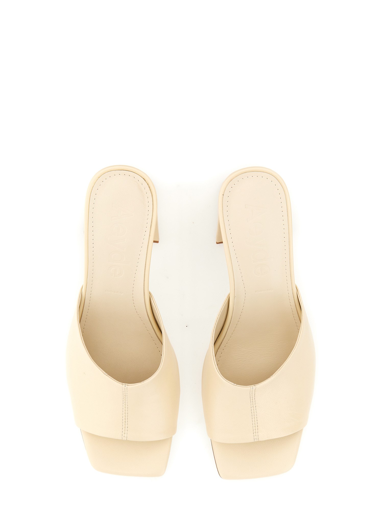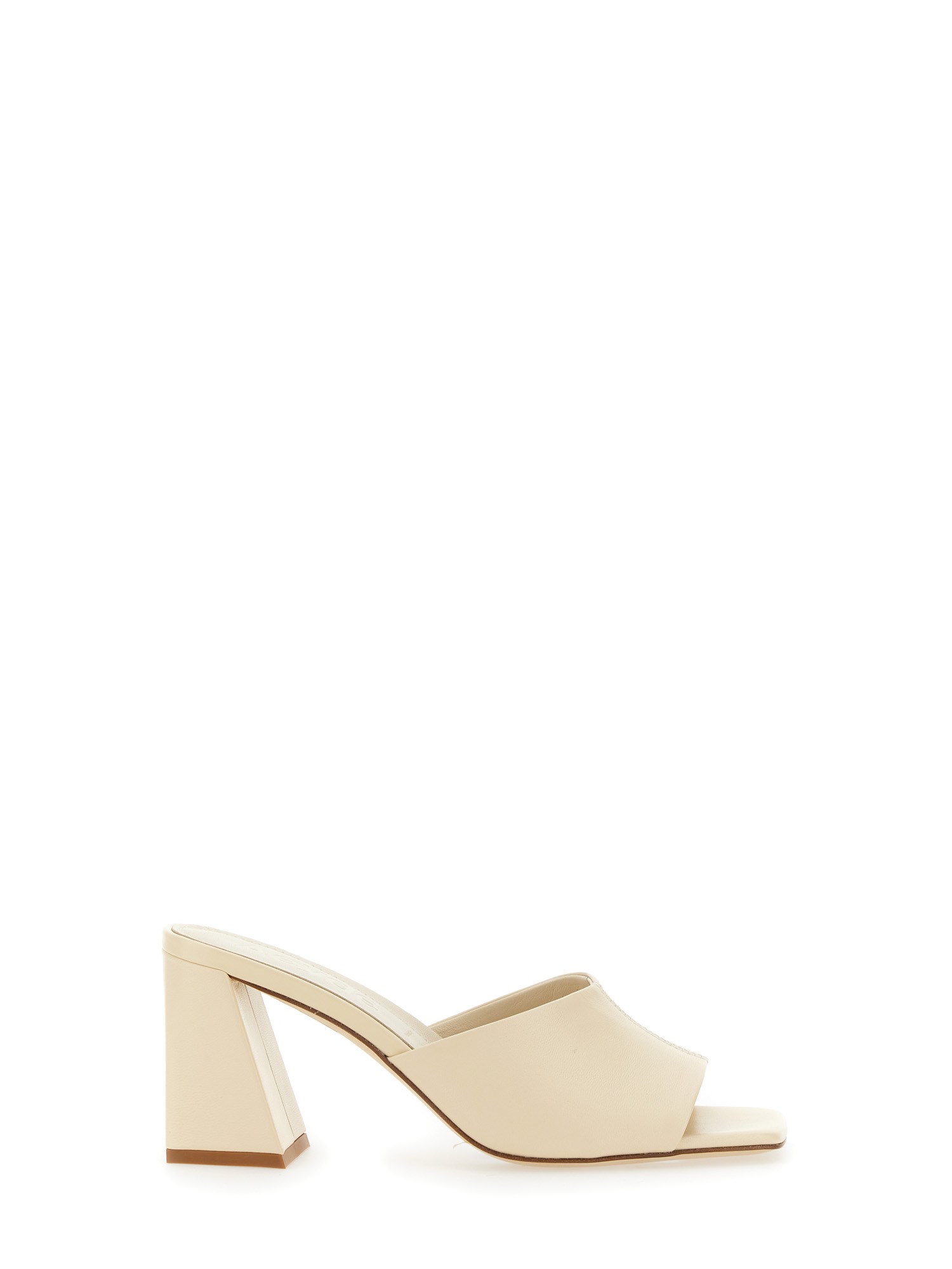 These gorgeous square toe leather mule sandals from Aeyde are great for spring and summer. They are an off-white colour with a thick silver chain that goes around the ankle and a buckle at the top of the foot. These are great for day or night, and they would look great with a pair of black shorts and a summer dress.