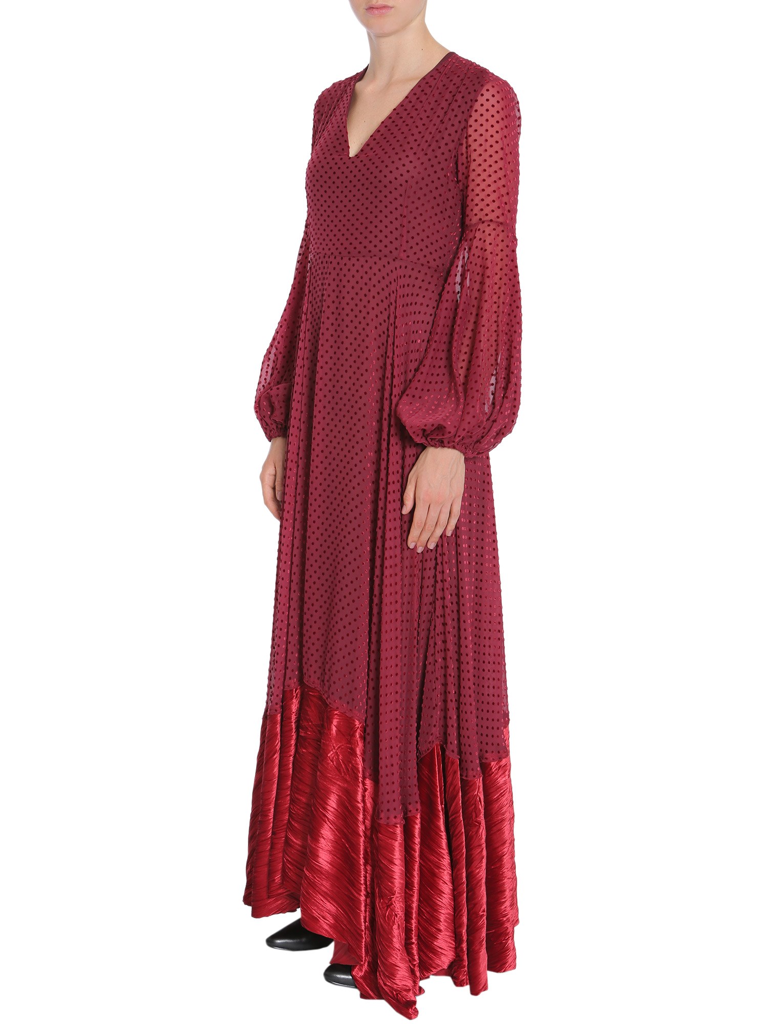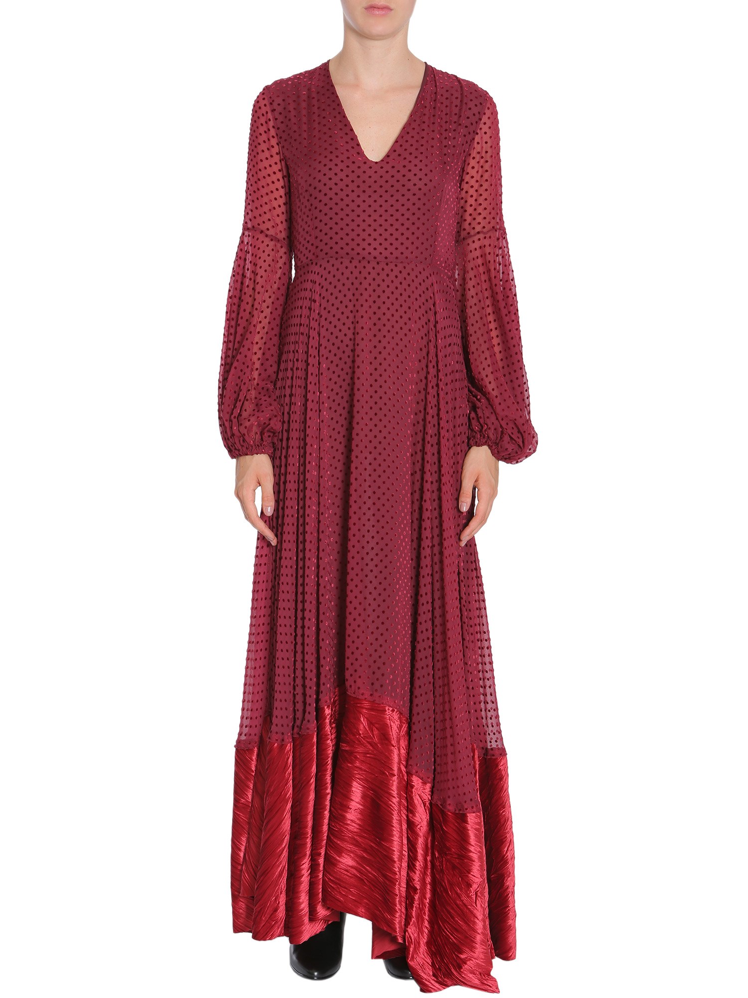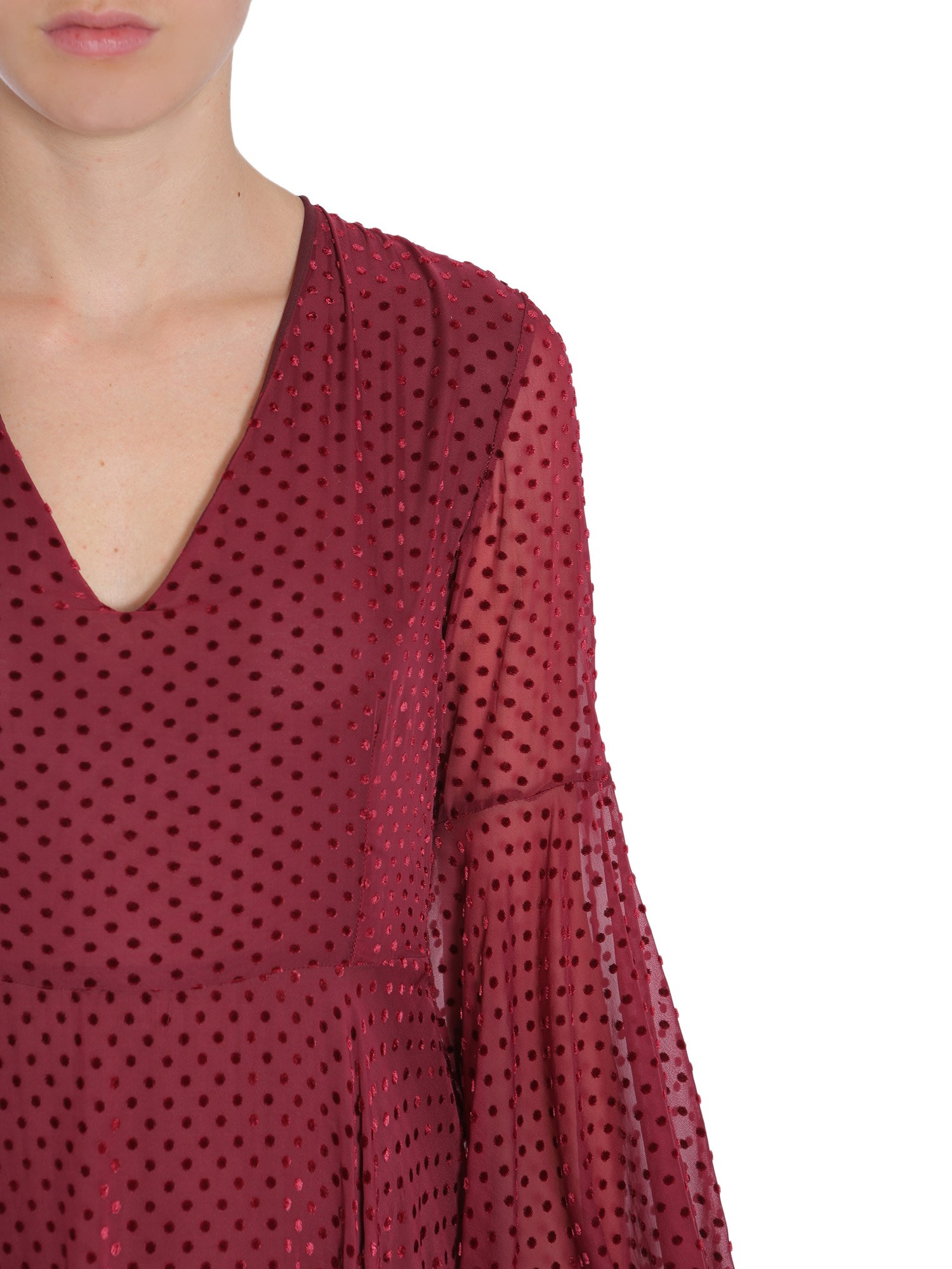 - V COLLAR- LONG PUFF SLEEVE- ELASTIC CUFFS- SIDE ZIP CLOSURE- FITTED WAIST- ALL-OVER VELVET POLKA DOT FABRIC- VELVET INSERT ON HEM- LINED- 46% POLYAMIDE, 27% VISCOSE, 23% POLYESTER, 4% ELASTHANE- MADE IN ITALY- MODEL IS WEARING SIZE 40