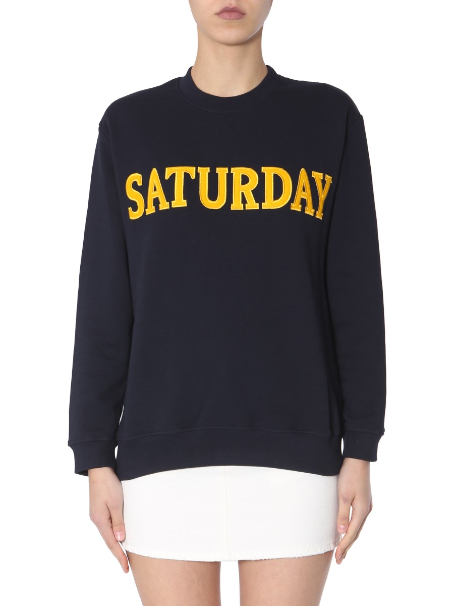 Tune in the weekend buzz with sweatshirt by Alberta Ferretti. Its blue colour with “Saturday” embroidery makes for the perfect winterwear. The sweatshirt is oversized giving a cosy and comfy look. Made with pure cotton, it has a ribbed neck, wrist and hem that accentuates the style quotient without much effort.
