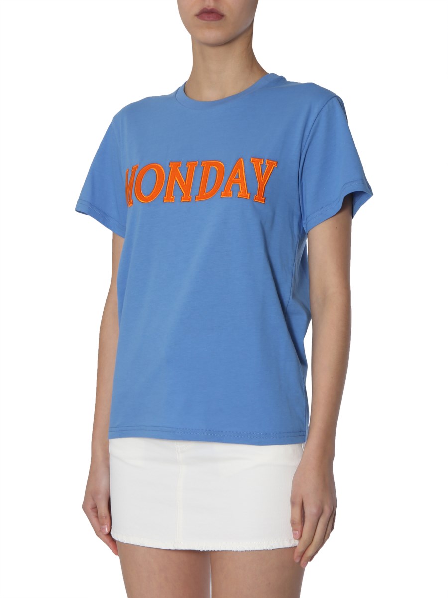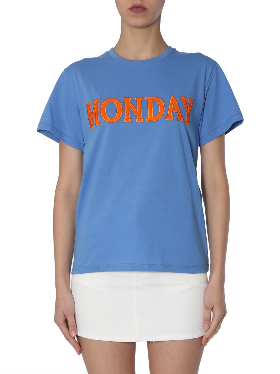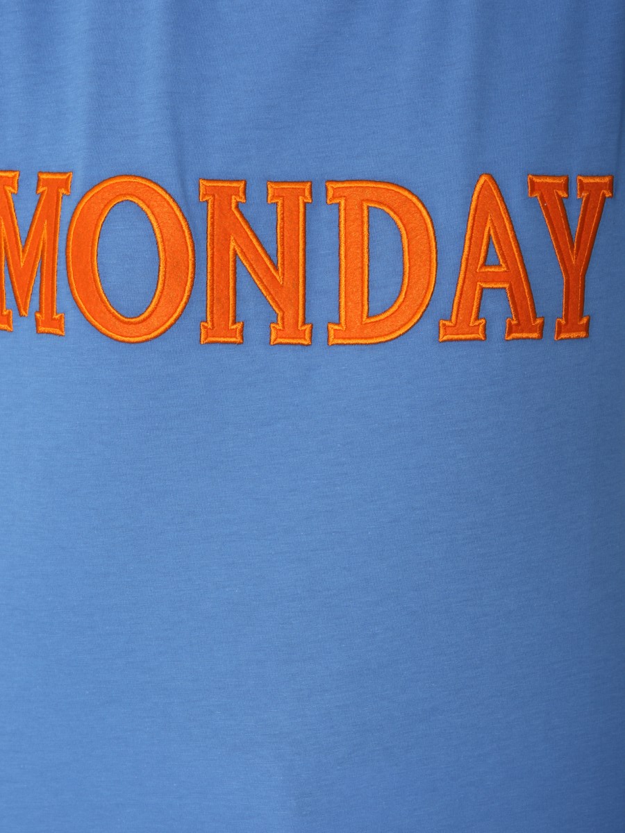 The “Monday” embroidery by Alerta Ferretti is a comfortable t-shirt for everyday wear. It has a crew neck style with short sleeves and gives a perfect summer vibe. Its cotton fabric gives comfort along with style. This t-shirt has a soft and natural feel to it.
