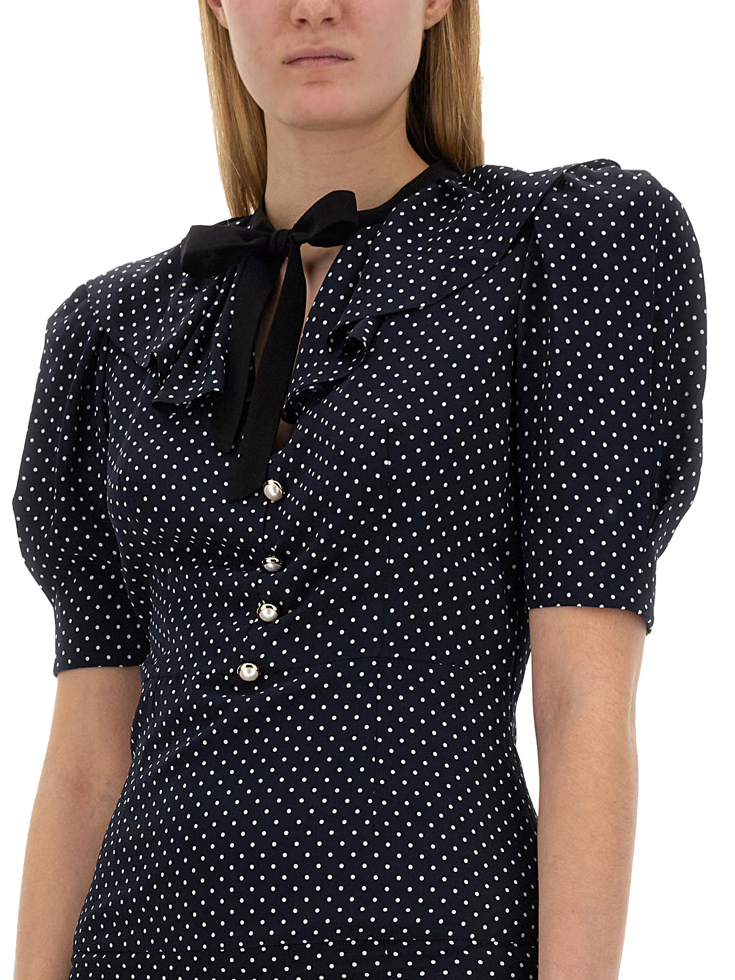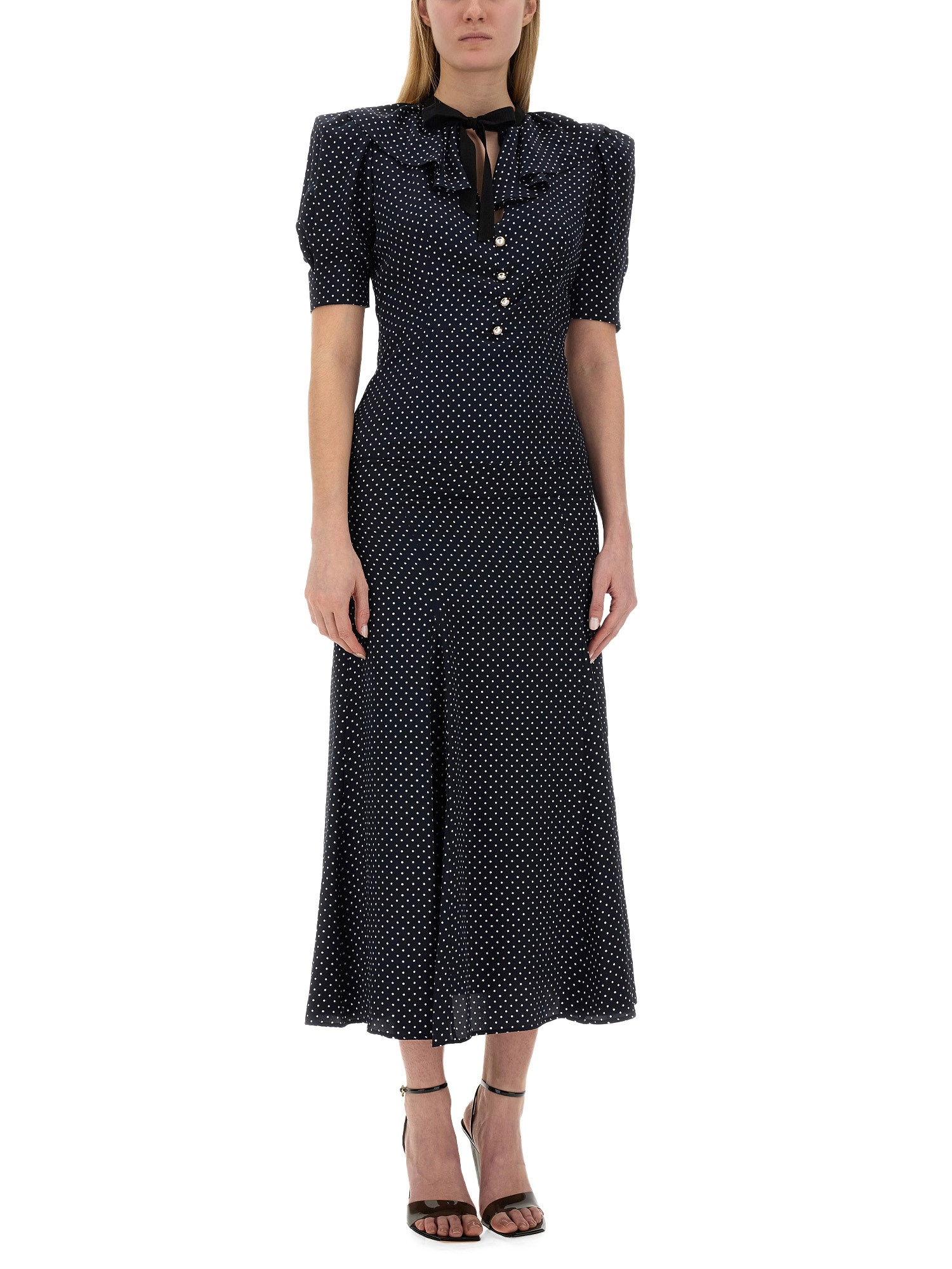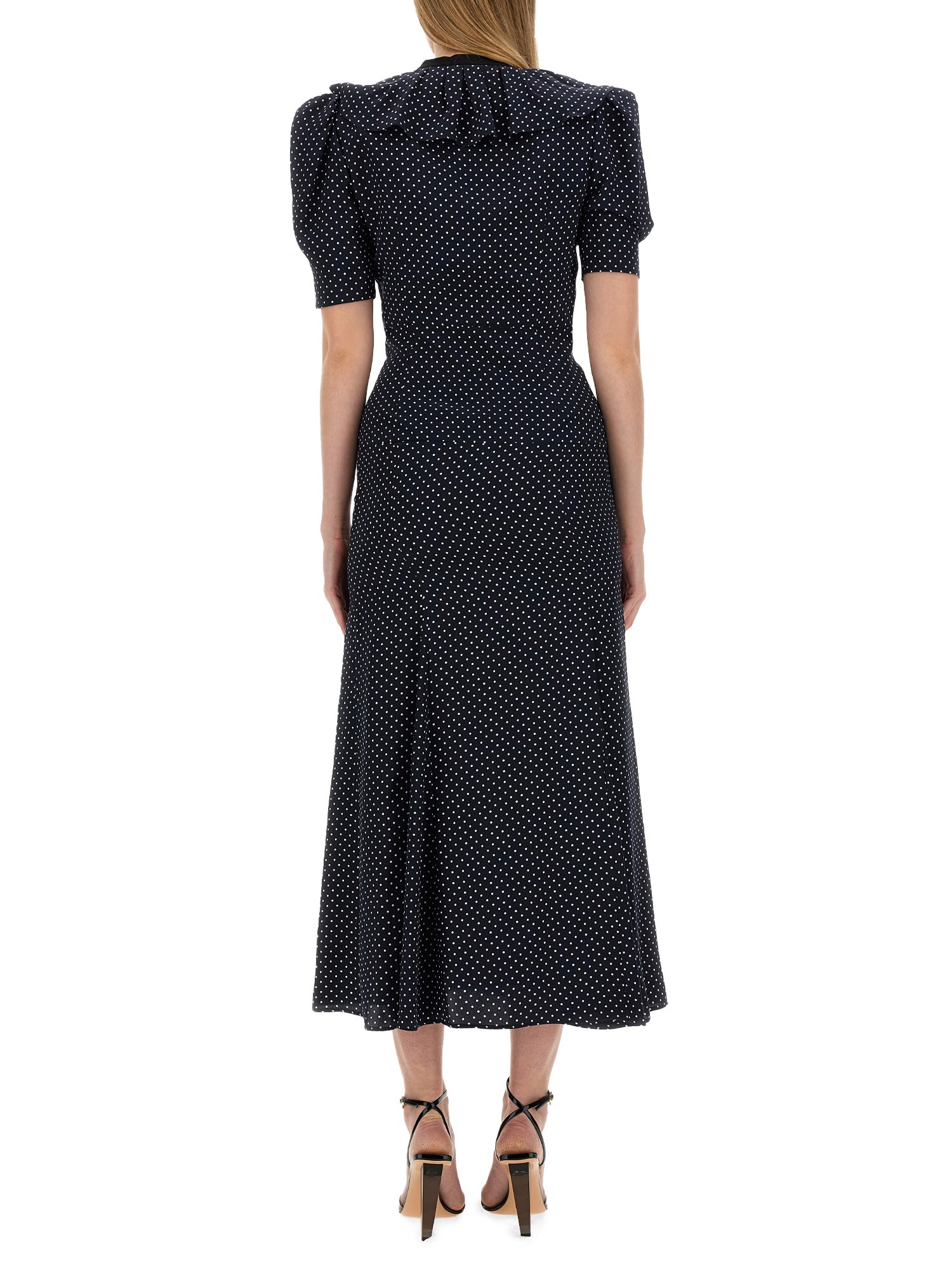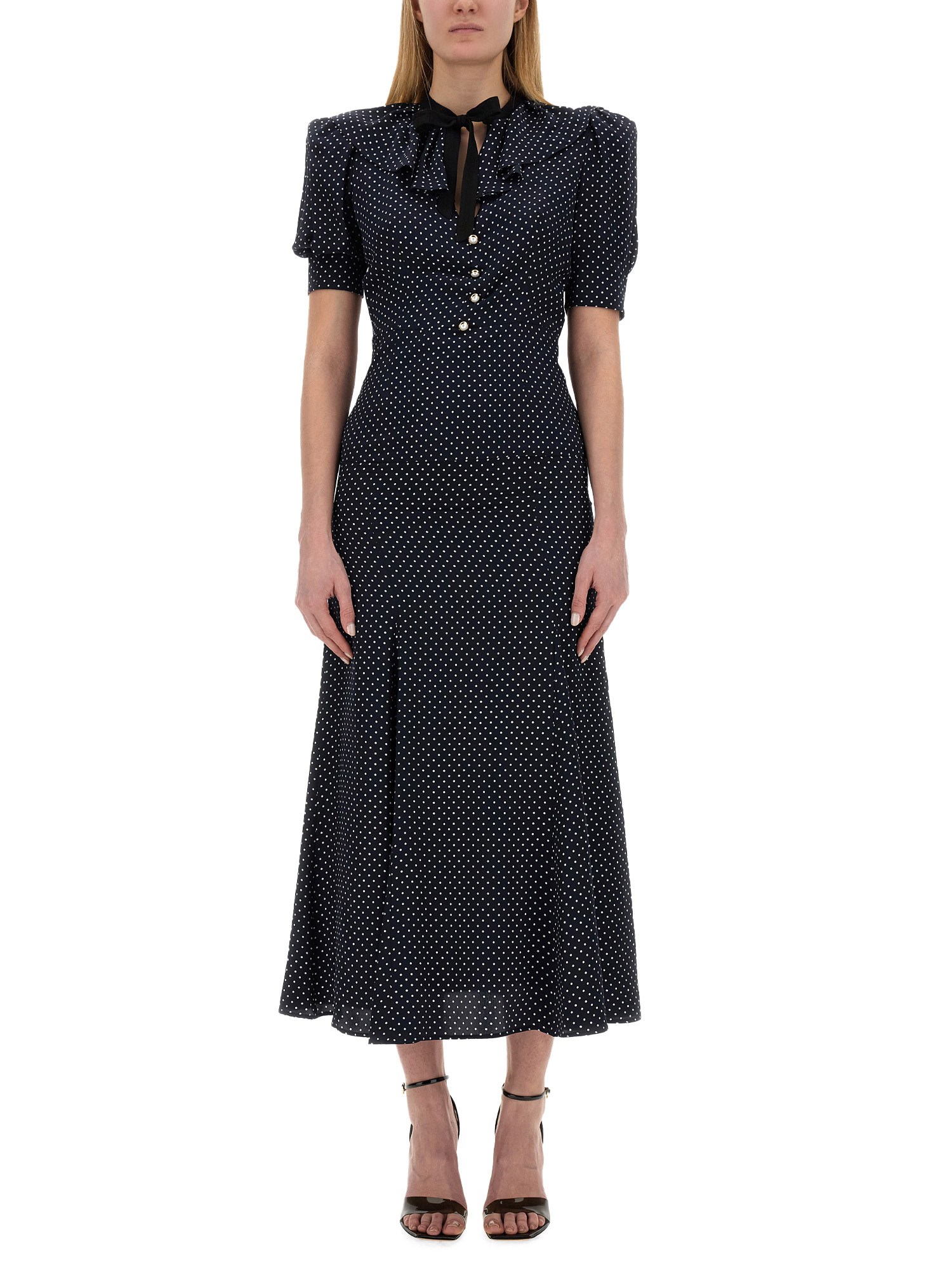 This elegant silk midi dress from Alessandra Rich features a charming ruffle collar and a classic polka dot pattern, adding a touch of whimsy to your wardrobe. The front button closure allows for easy wear and adds a sophisticated detail to the overall design. Perfect for both casual and formal occasions, this dress is a versatile and timeless addition to any fashion-forward closet.