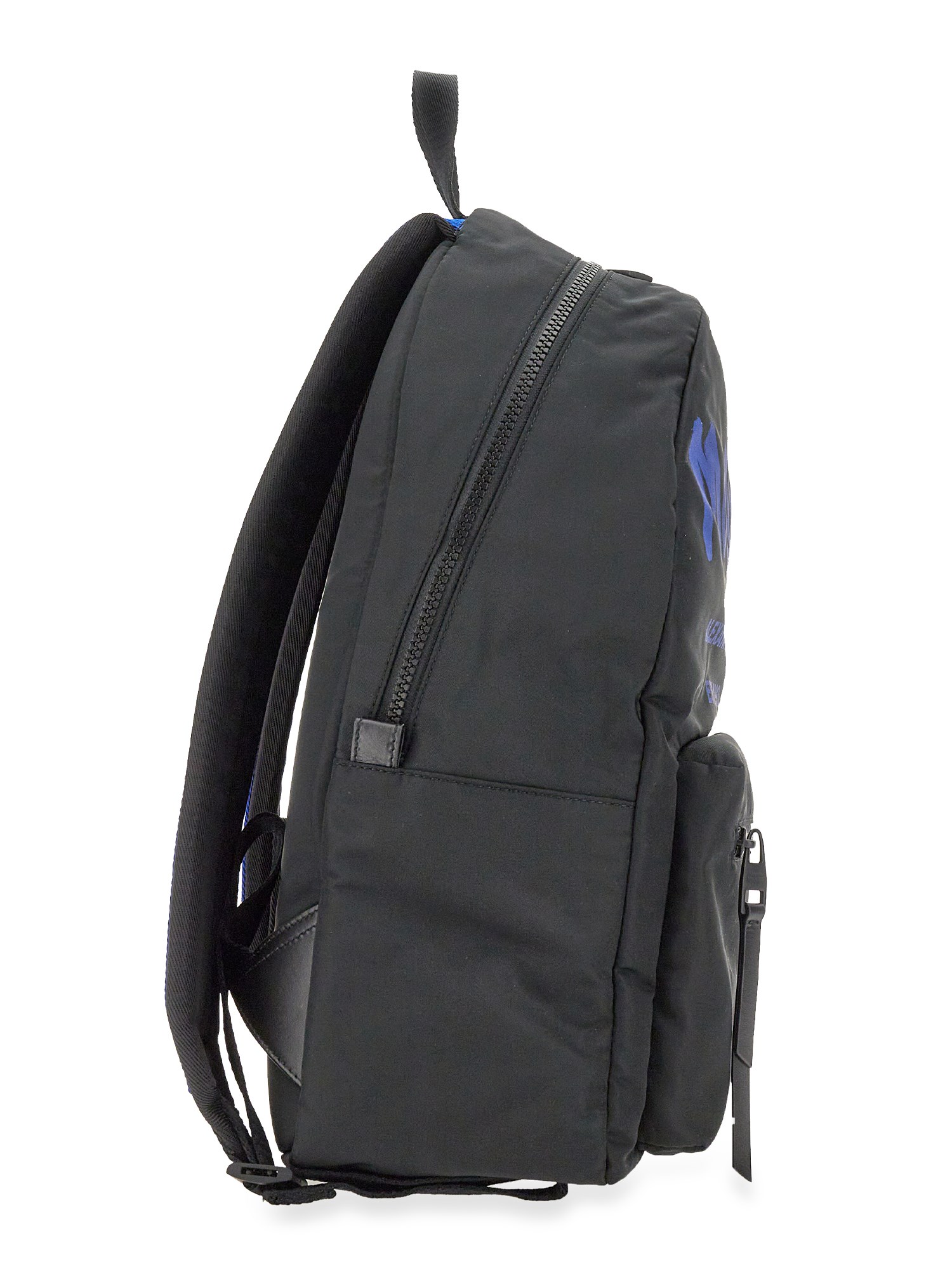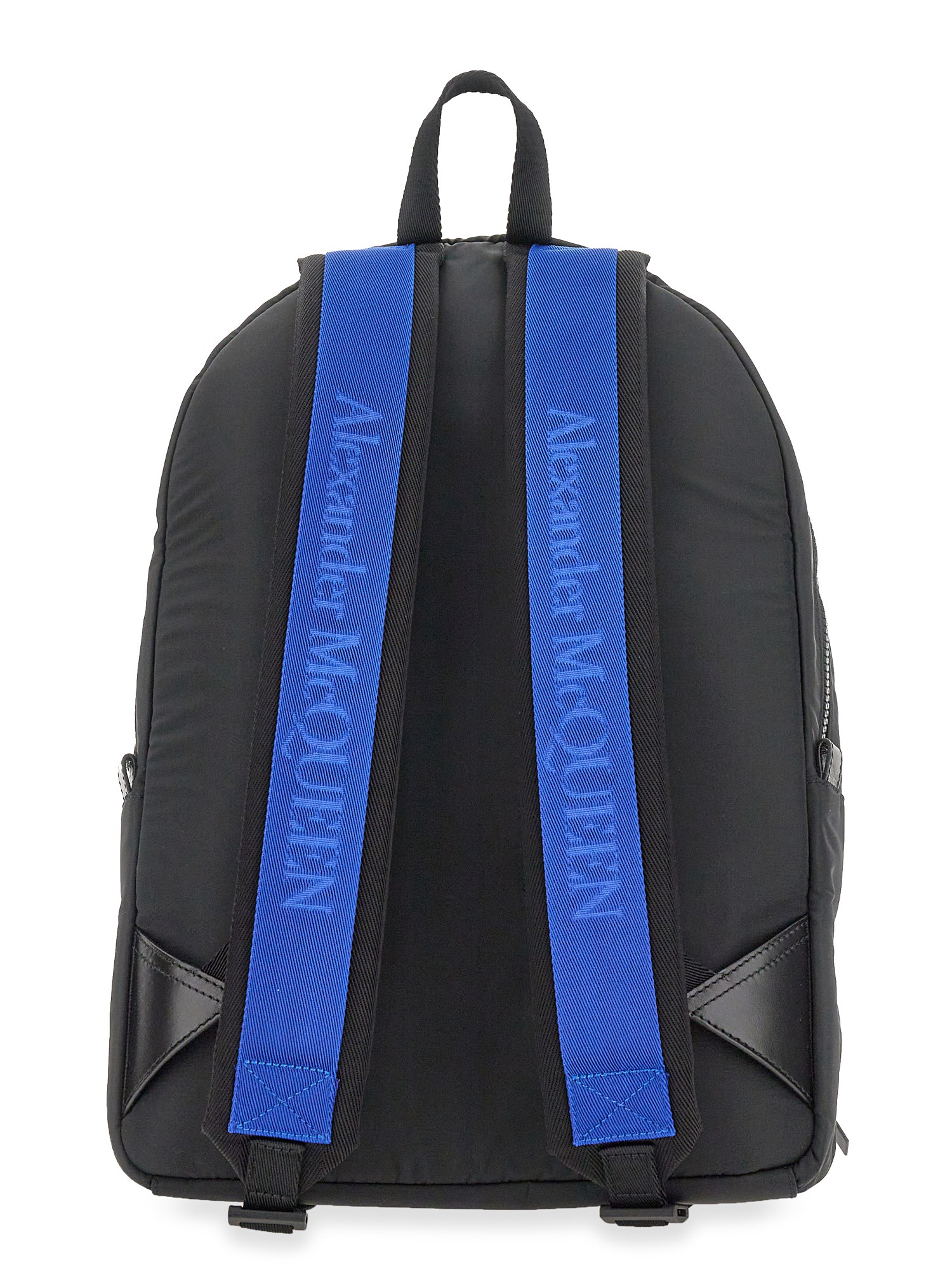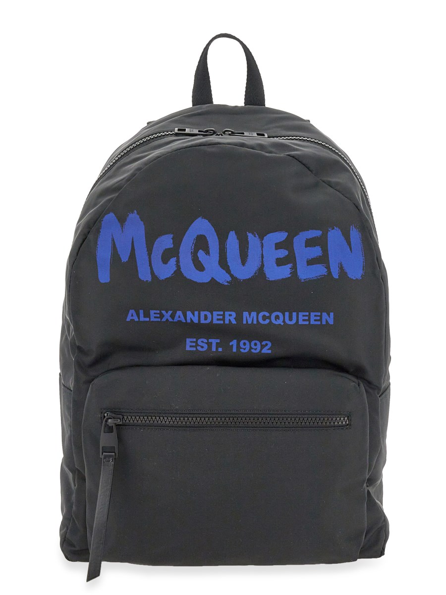 This lightweight, easy-to-carry backpack from Alexander McQueen is made from durable, water-resistant fabric. The top handle offers a convenient way to carry it on your shoulder or by the top of your hand. Inside, there is a large front zippered pocket, a smaller front zipper pocket, and a long zipper pocket on the back.