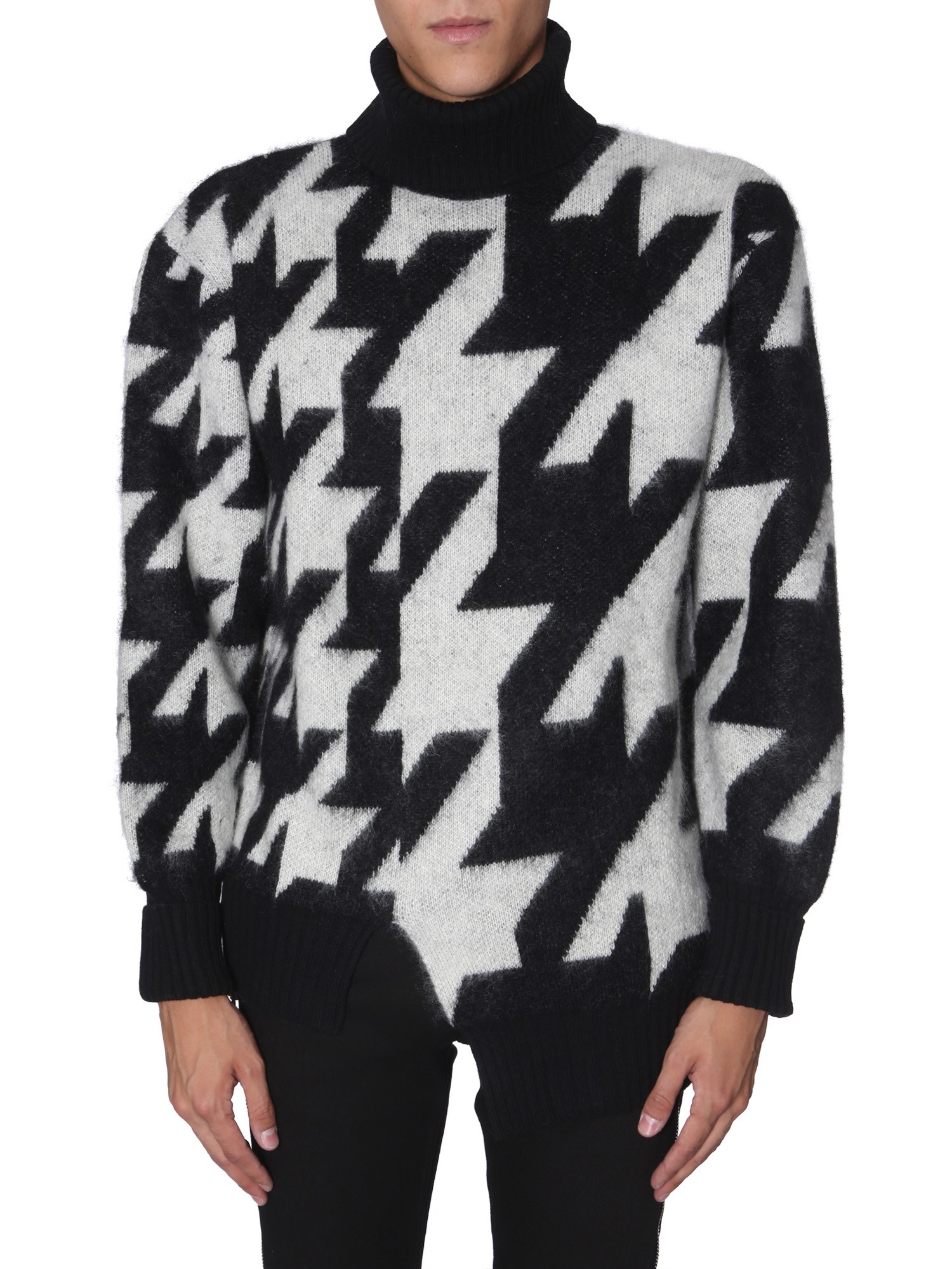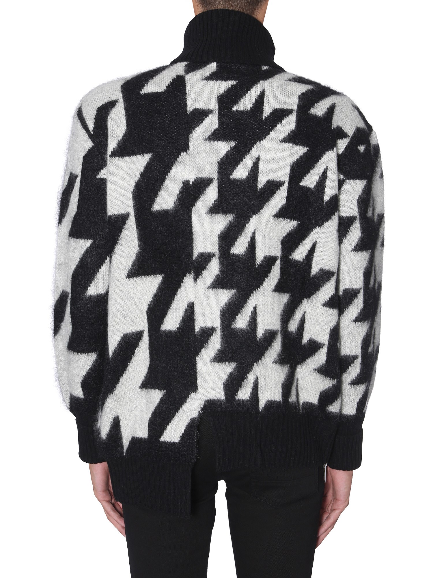 Unique and stylish, this oversize fit shirt from Alexander McQueen is designed for those who like to be on trend always. This high neck sweater flaunts a unique hound’s tooth print on the surface. It is knitted from wool, polyamide and mohair that make it a luxurious addition to your closet.