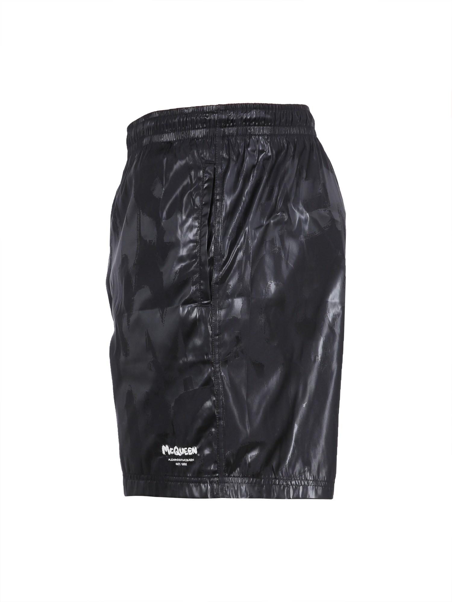 Stay cool and stylish this summer with our Graffiti Print Swimsuit from Alexander McQueen. Crafted with a lightweight fabric, this swimsuit features an elastic waistband for a comfortable fit that moves with you. It also includes two convenient side pockets to store your essentials while you enjoy a day at the beach. With its eye-catching all-over print, you'll turn heads wherever you go. Plus, the mesh inner briefs provide extra support and comfort. Dive into the season with confidence!