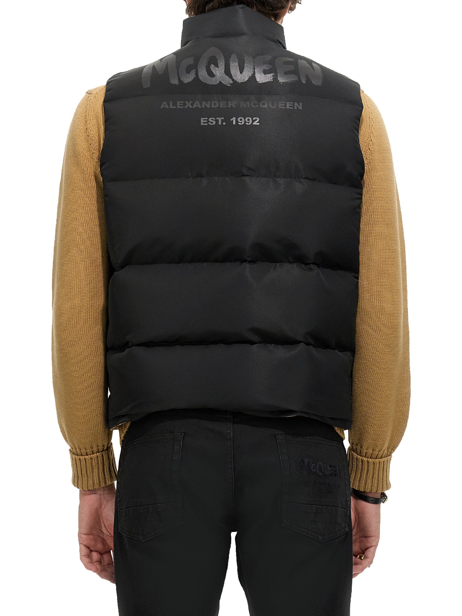 The technical fabric vest from the house of Alexander McQueen made of high-quality and durable polyester is a comfortable and stylish way to stay warm. The vest has a classic fit that makes it easy to get on and off. It has a front zipper and button closure and graffiti logo print on the back.