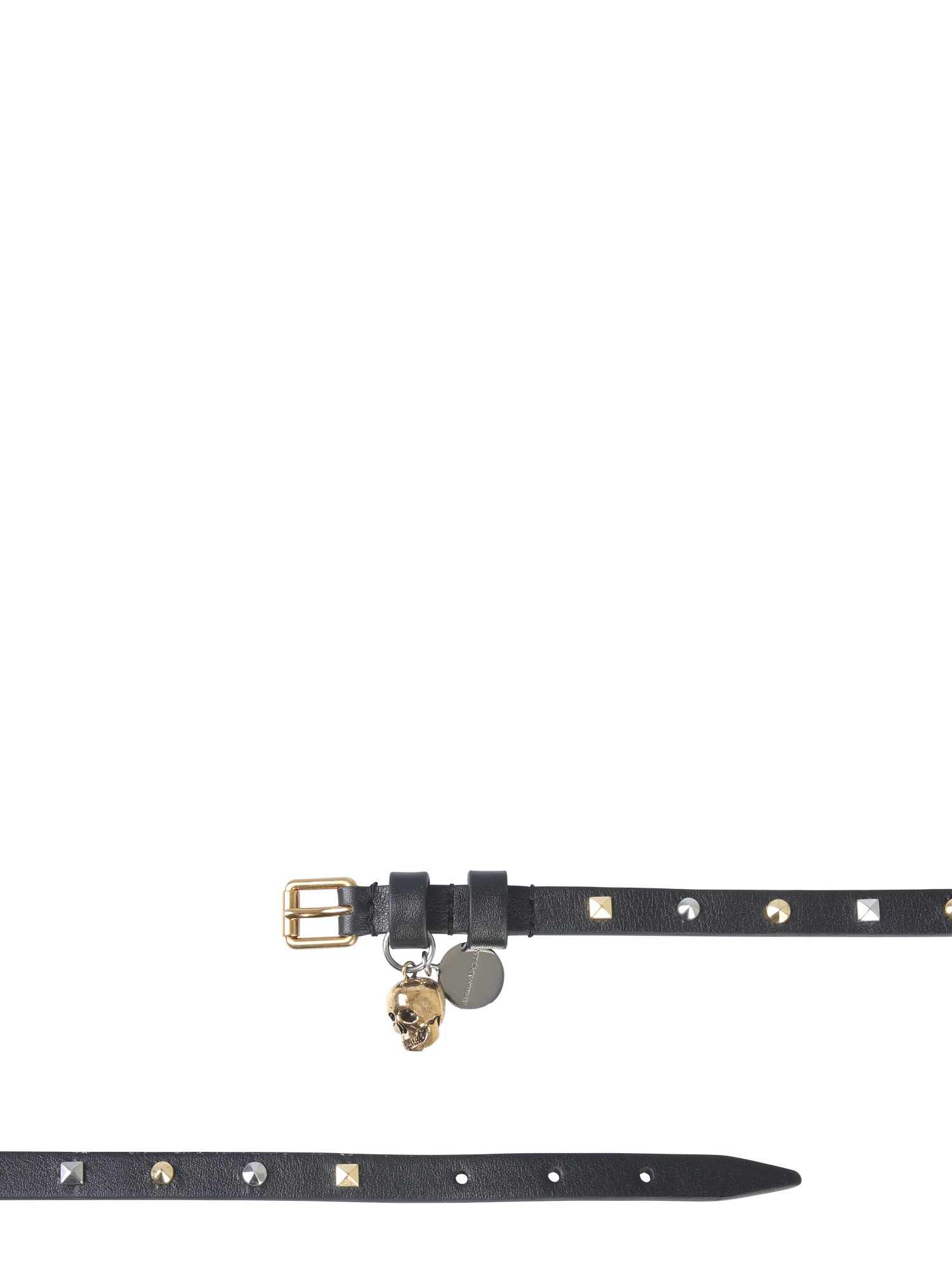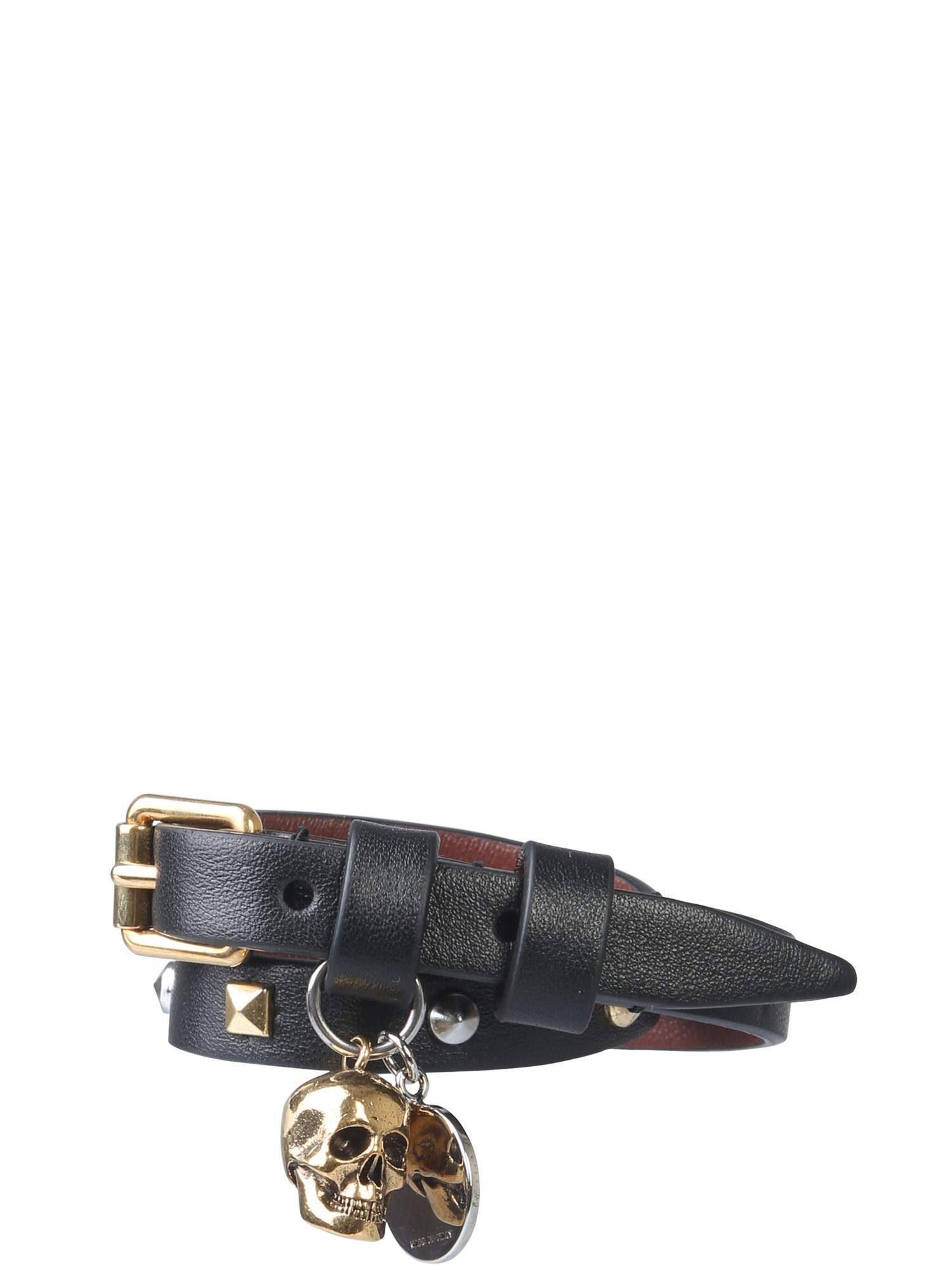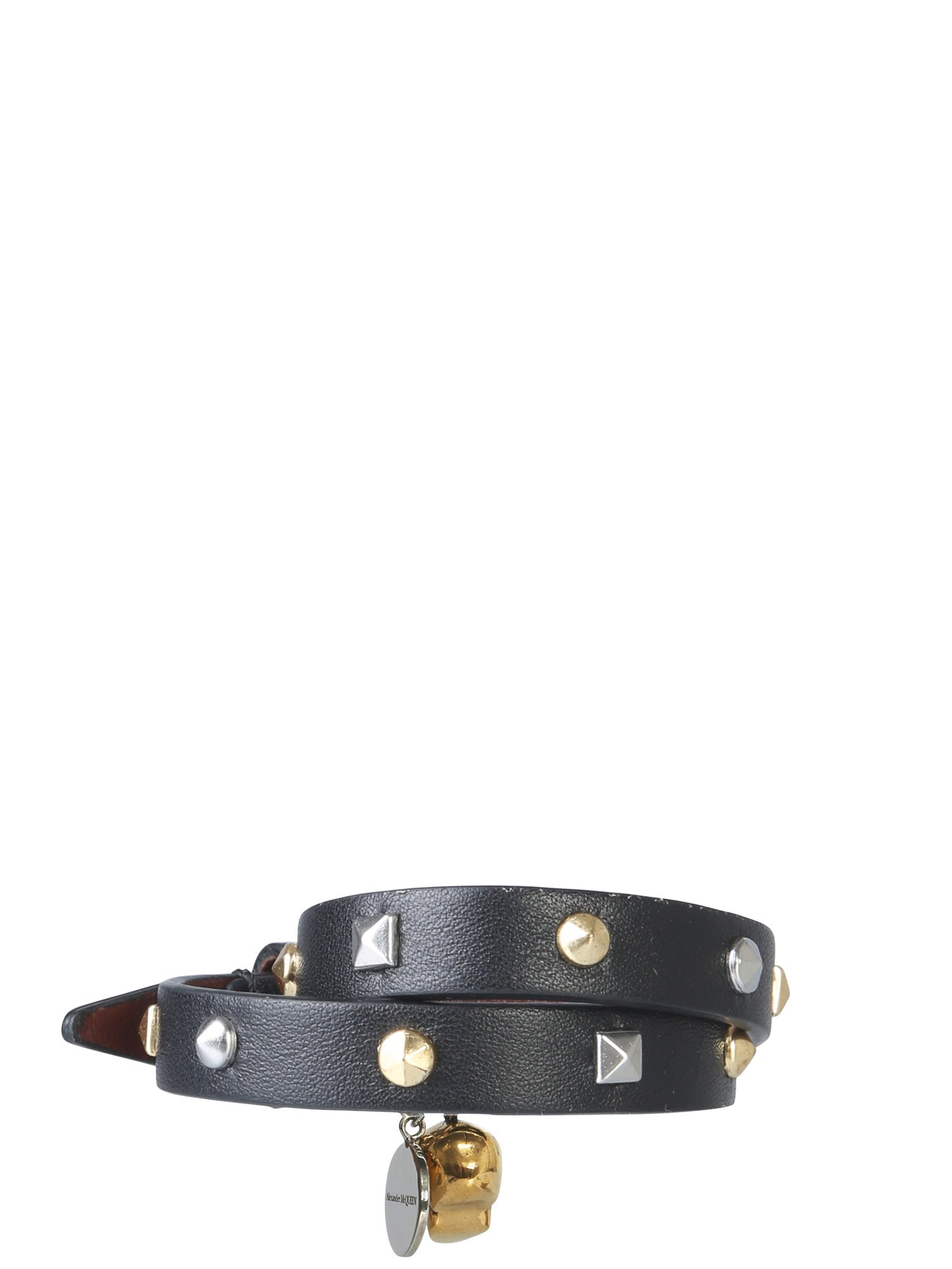 Adorn your wrist with the double turn bracelet from Alexander McQueen. This leather based bracelet has a buckle closure that can be adjusted according to your preference. It has metallic studs and a stylish skull charm for a unique and classy look. Best for casual use, you can wear it for rock concerts and Halloweens.