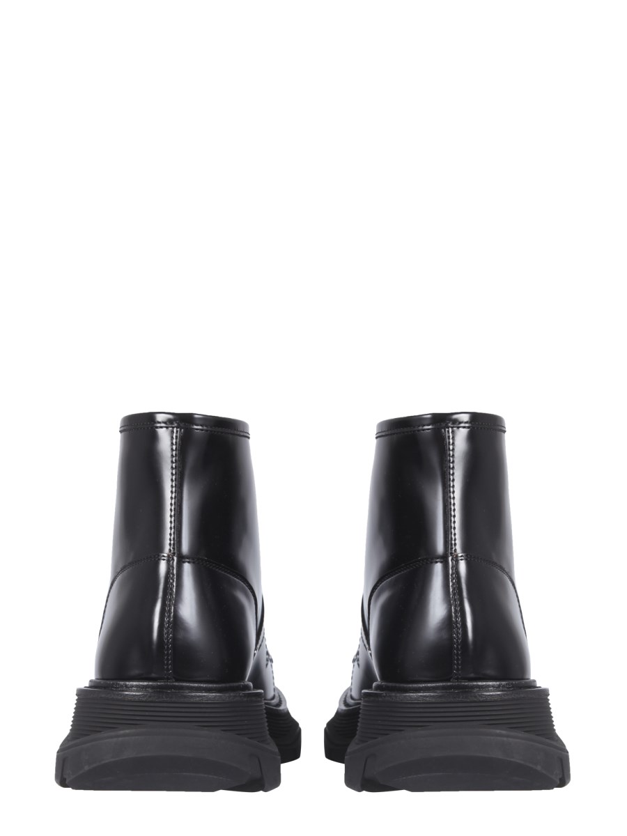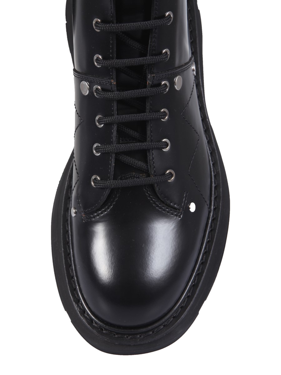 The leather boots from Alexander McQueen are designed with a sleek silhouette and a cosy interior to keep you on trend and comfortable all season long. It features tubular laces with reinforced metal eyelets, a round toe design, a leather upper, and a logo on the tab. The leather construction boots have a durable rubber outsole.