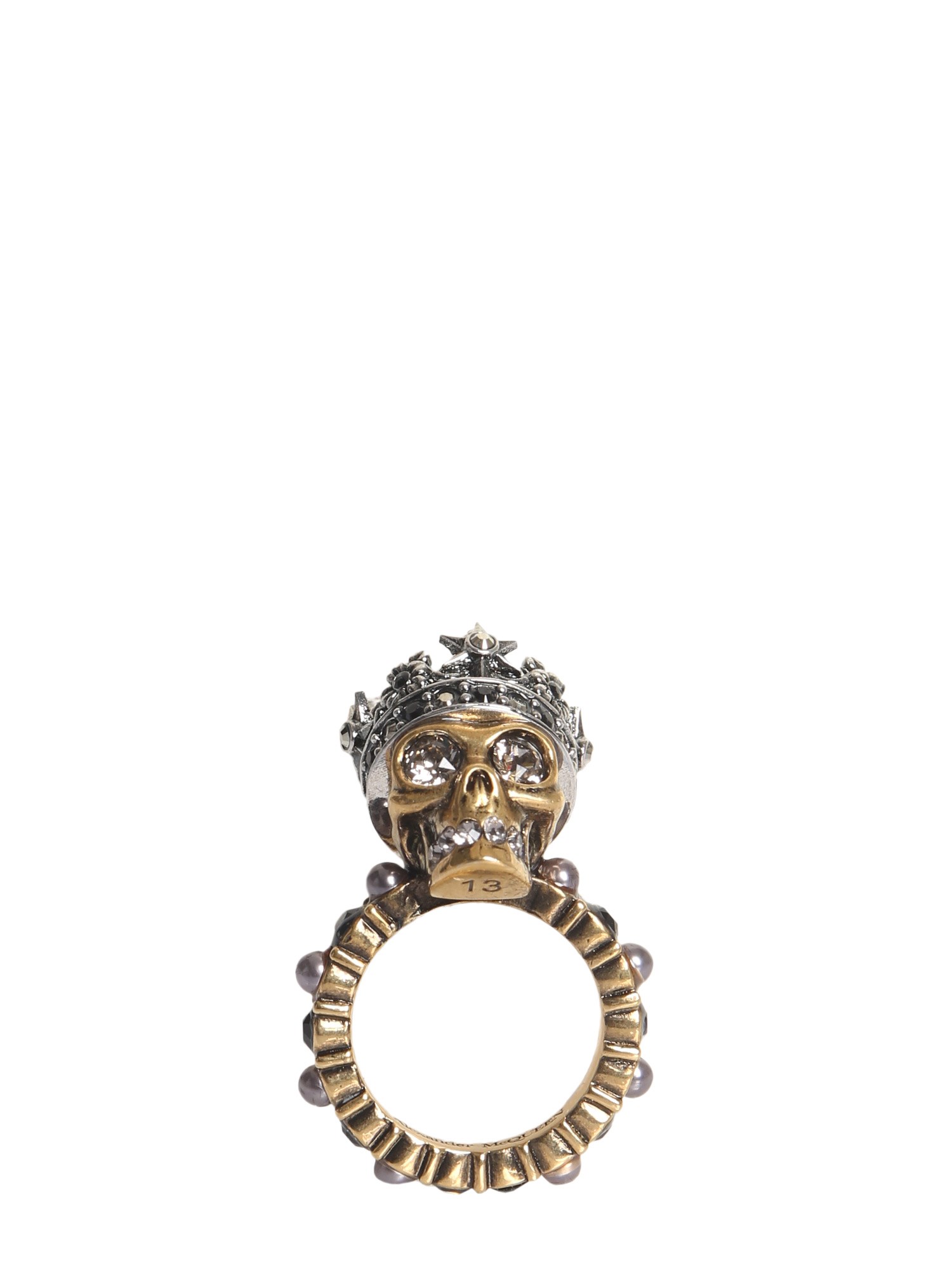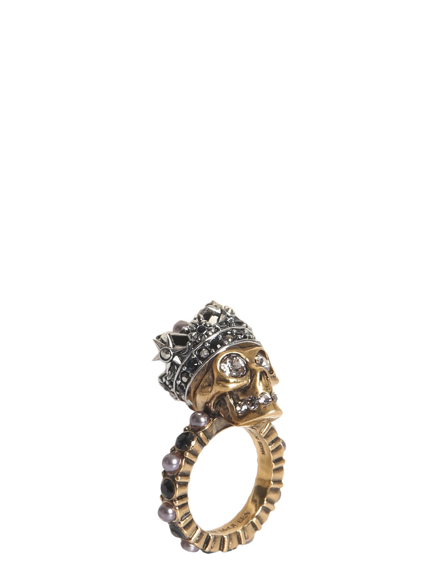 Opt for the quirky skull ring from Alexander McQueen to get a stylish look. This multicoloured ring is made of brass making it safe to wear. It has a skull stone on the crown for a funky look. There are crystal and pearl embellishments all over for a classic touch.