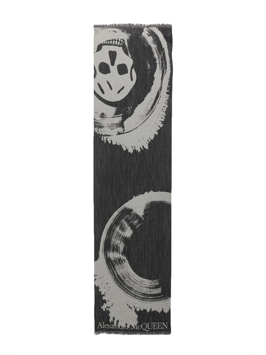 The Galactic Iris Scarf is a long, beautiful scarf from Alexander McQueen made from a blend of wool and silk. It is perfect for any occasion and will make any outfit look amazing. The scarf features fringing on the edges, a skull print, and a logo detail.