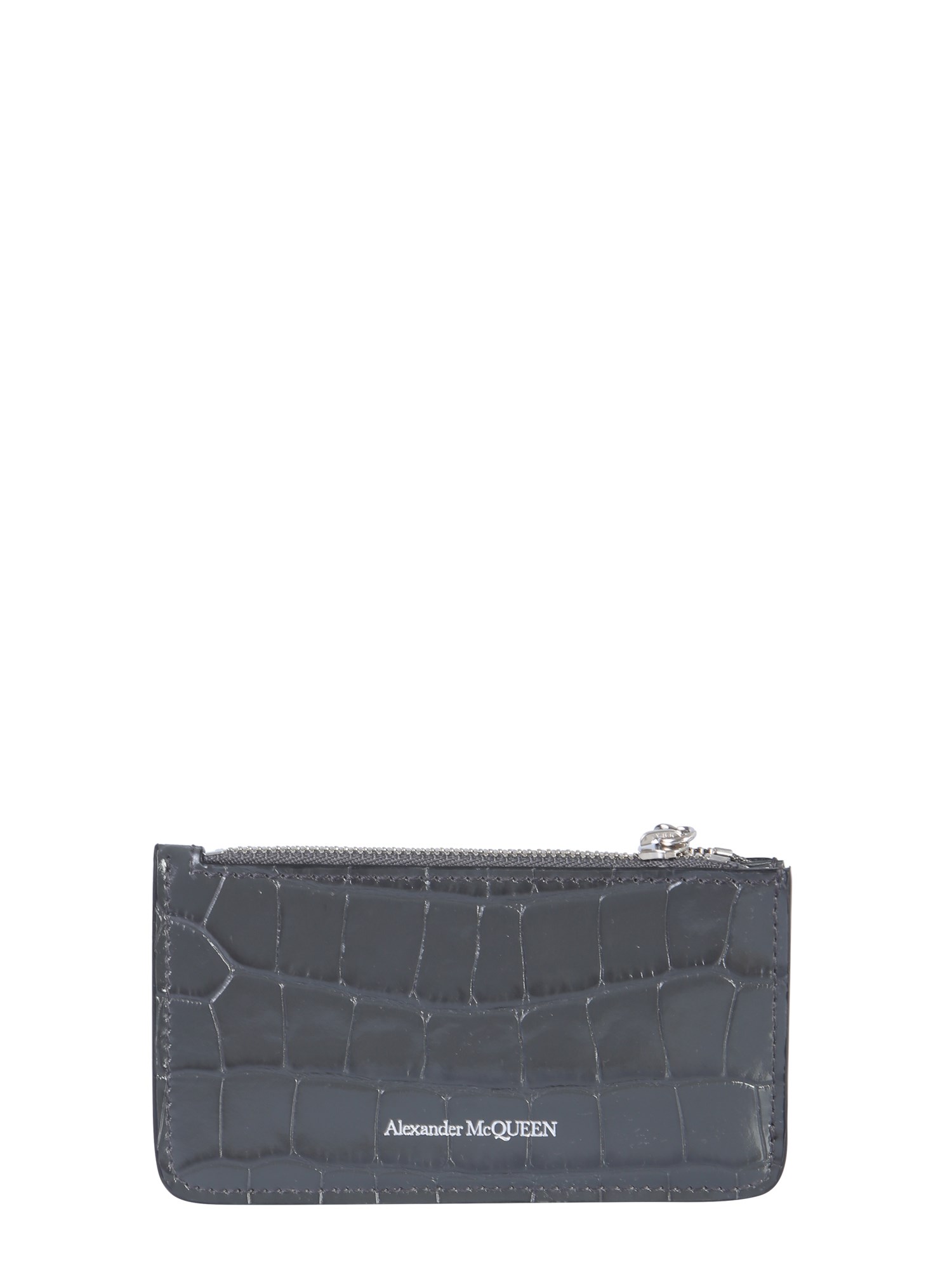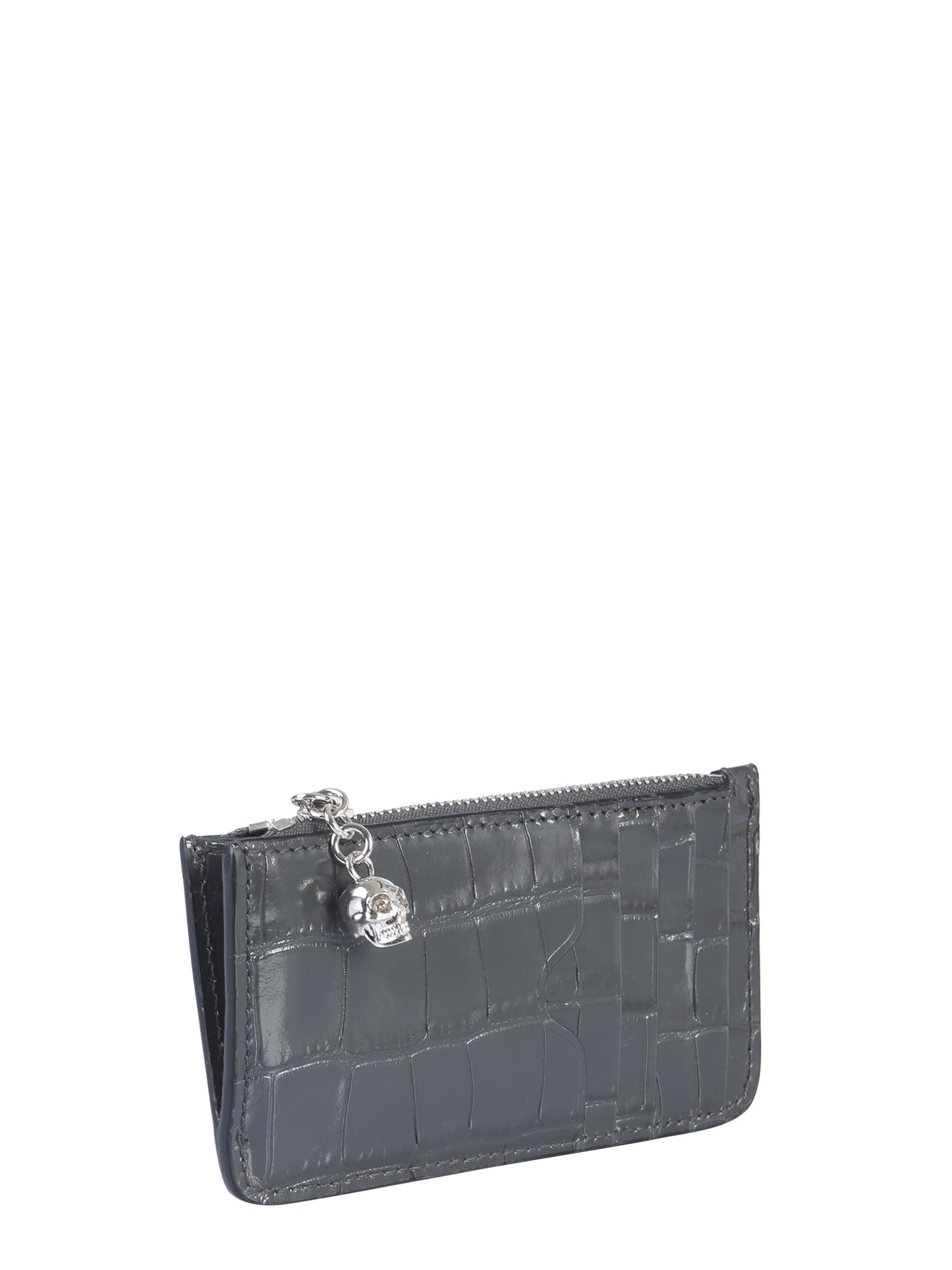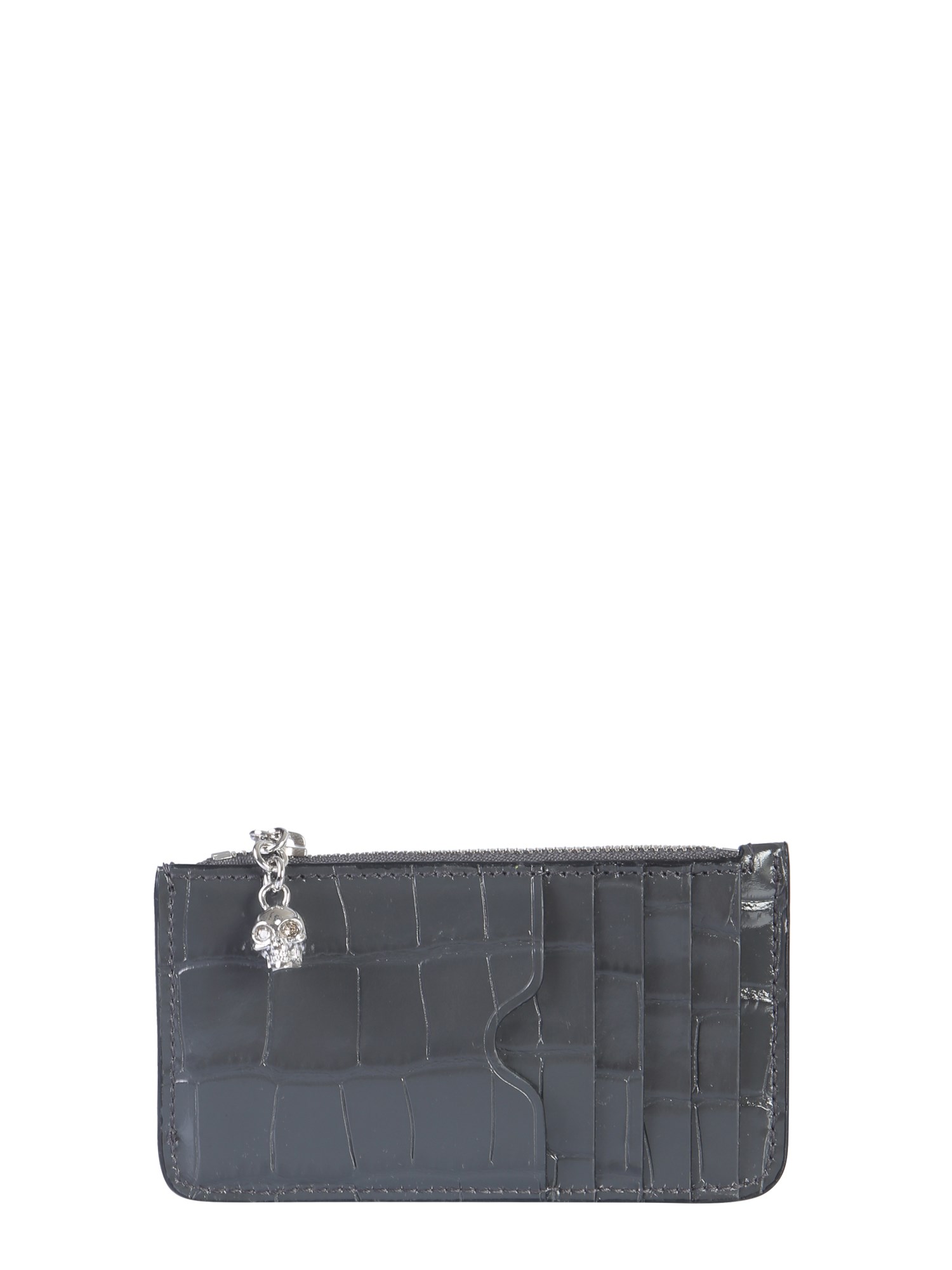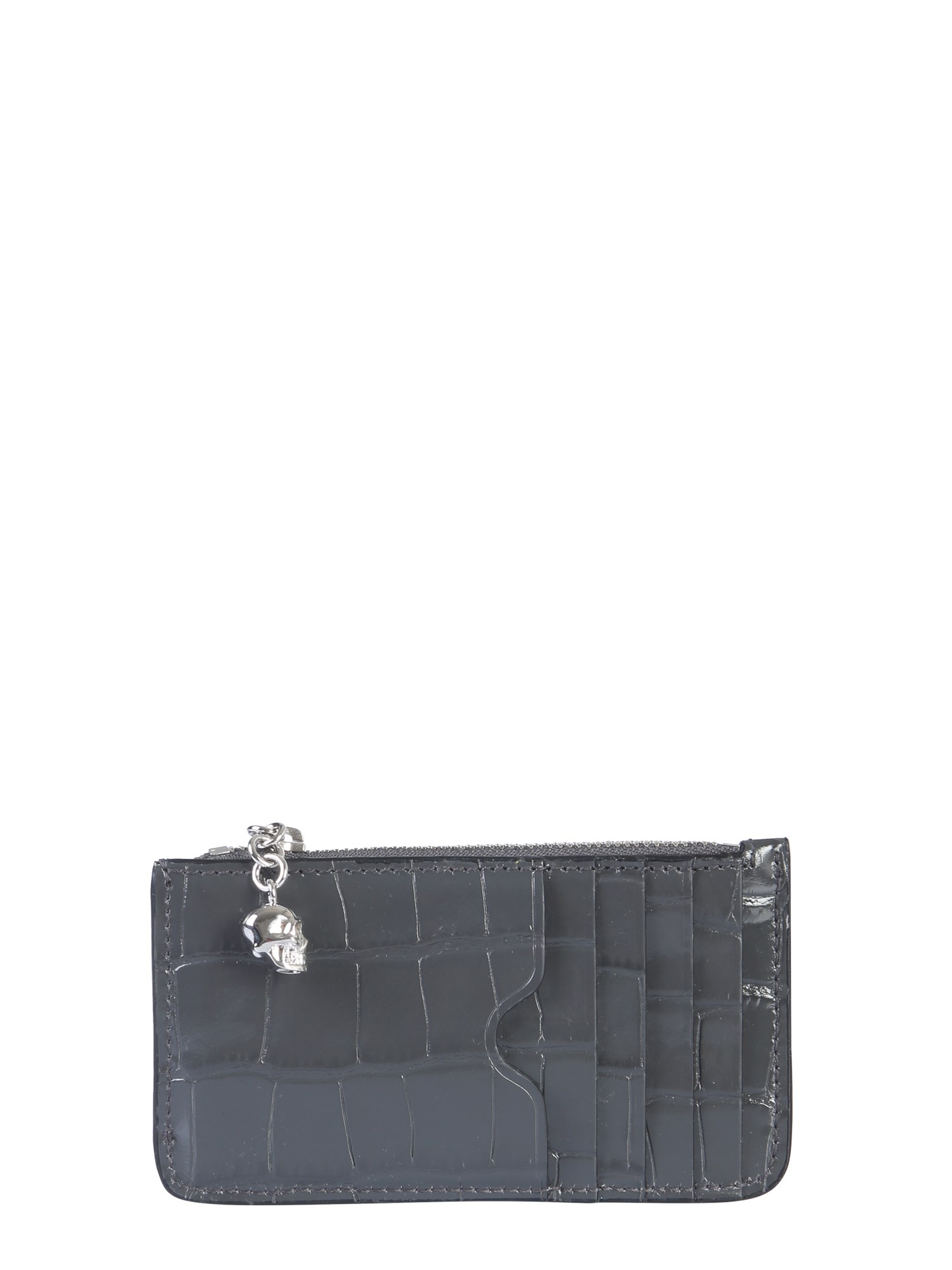 This shiny and cute zip card holder from Alexander McQueen is a must-have for every accessory collection. It's made in Italy from lightly grained leather buffed to a soft shine with a skull embellishment. It stores up to five cards with coins and receipts. The zip closure secures your cards.