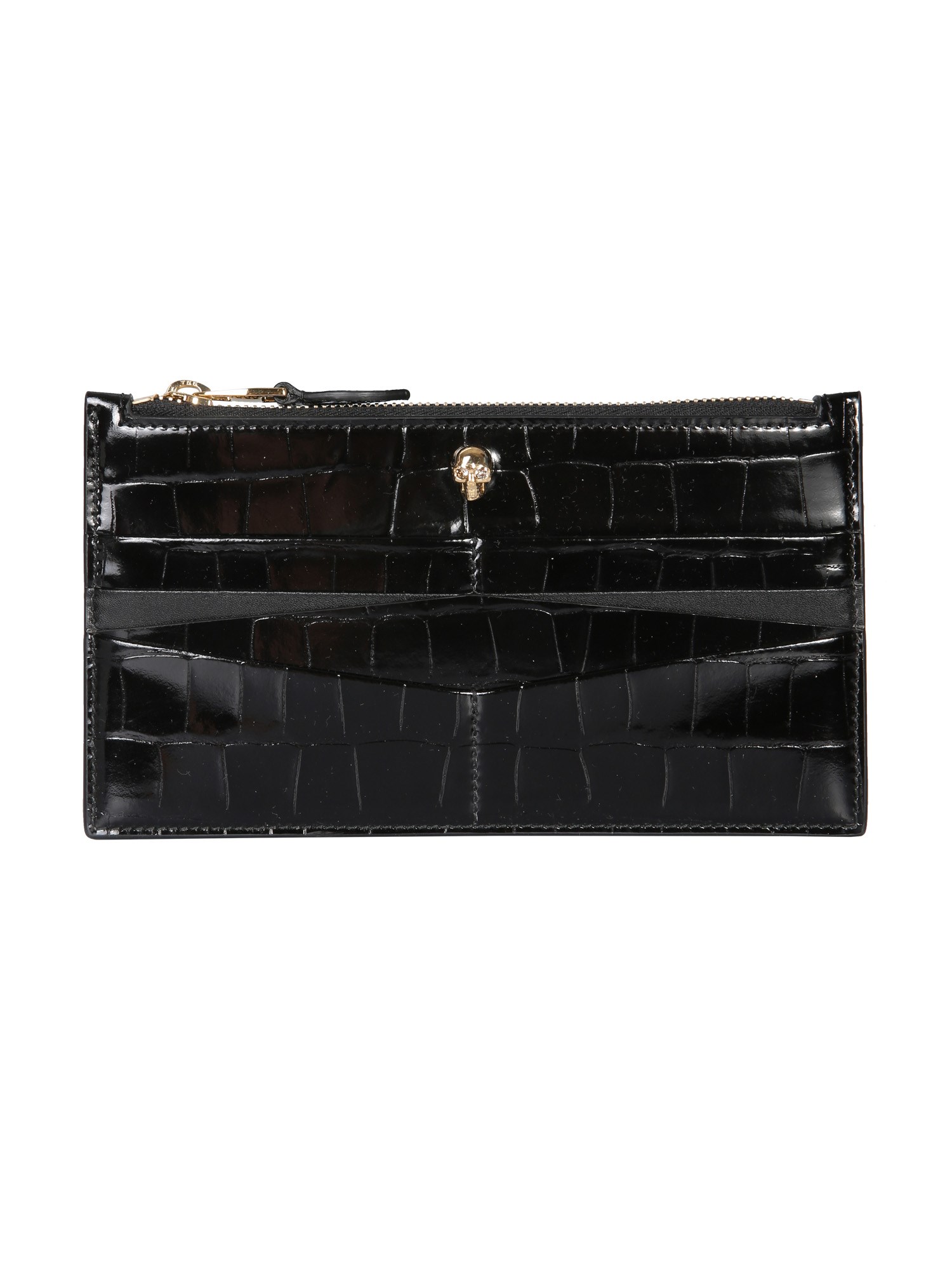 The crocodile print leather flat wallet from the house of Alexander McQueen is a sleek and simple wallet that's perfect for carrying all of your essentials. Made from soft, supple leather, this wallet features a zipper closure and multiple card slots for your ID, cards, and cash. The stylish wallet is adorned with a metal skull application.