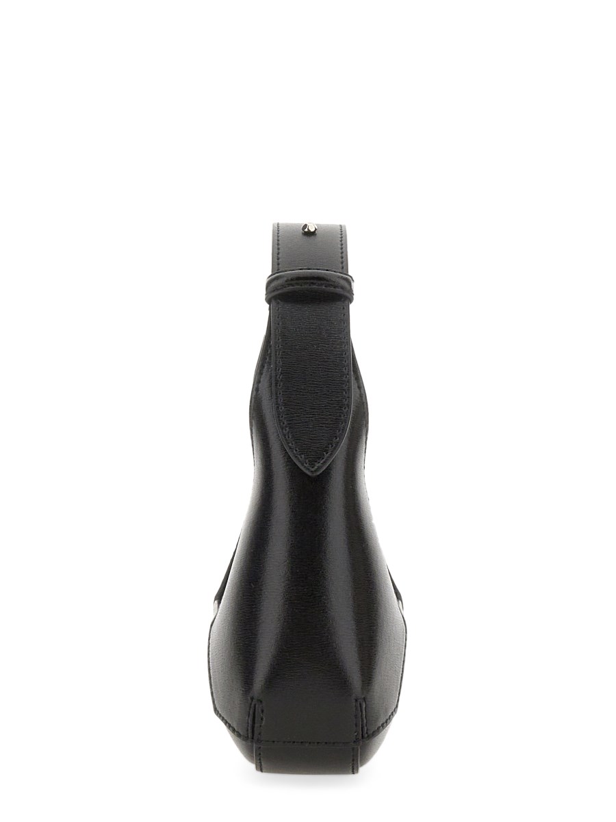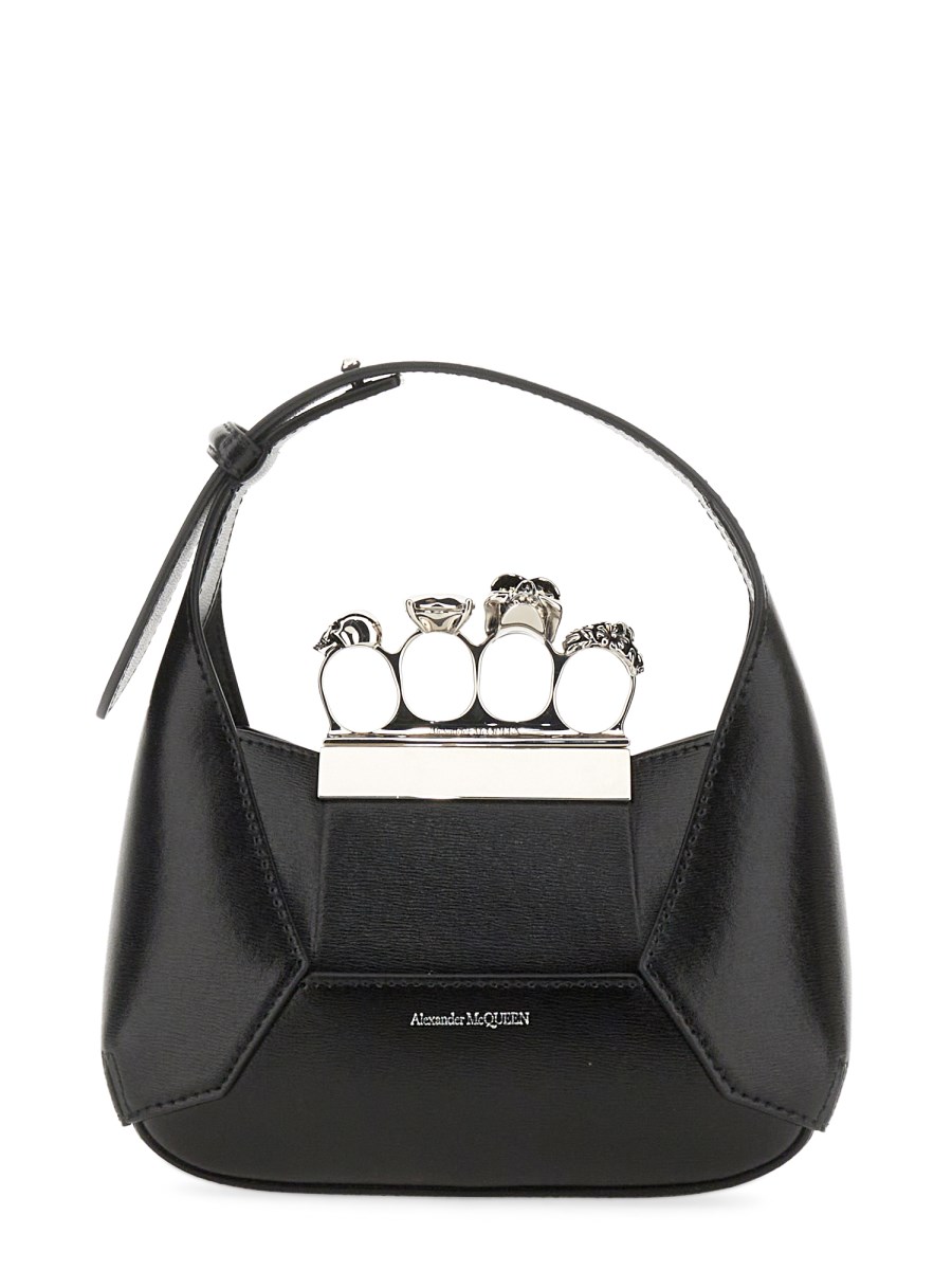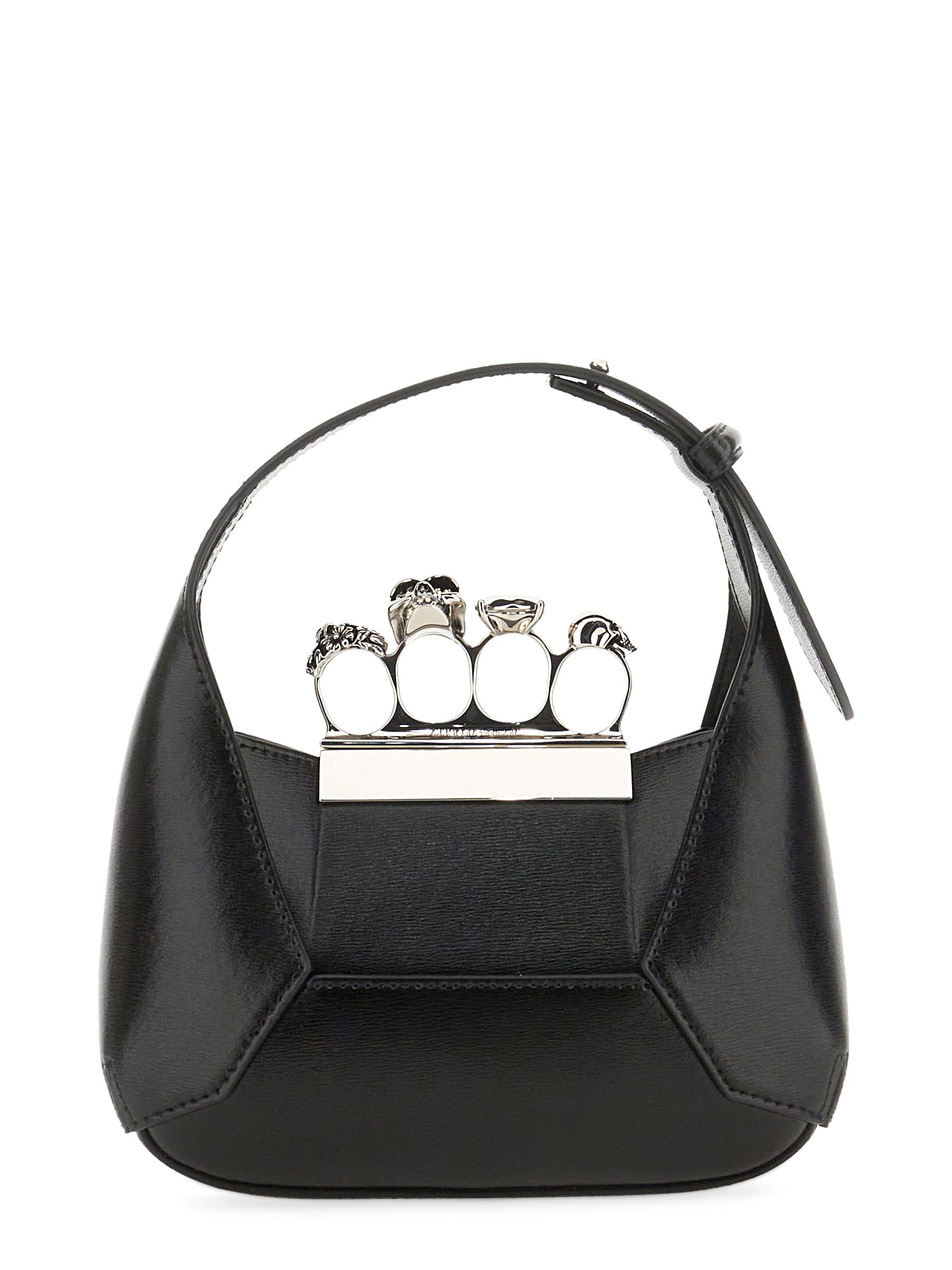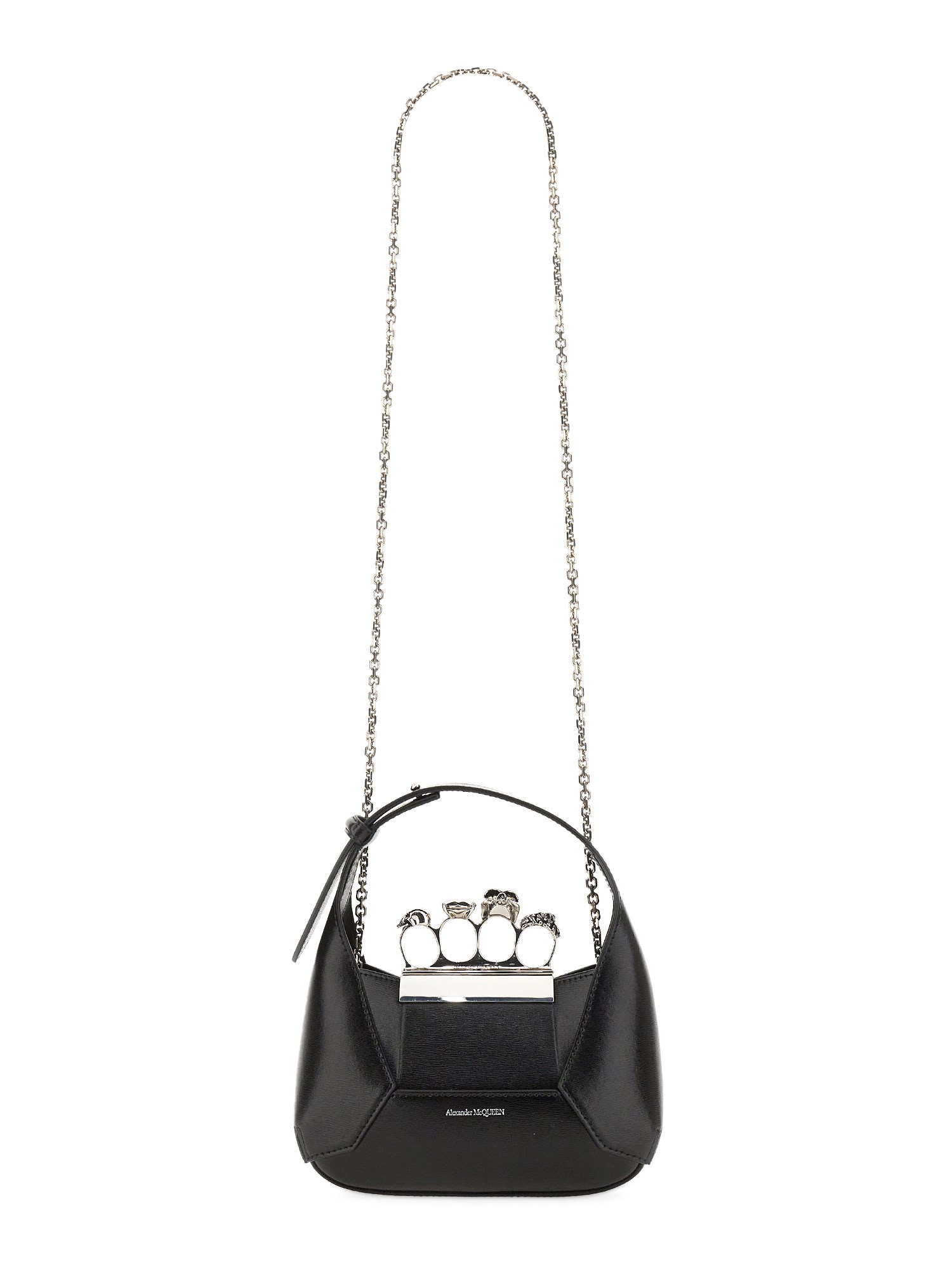 Black smooth calfskin leather Jewelled Hobo bag featuring an antique silver-finished handle adorned with Swarovski-encrusted rings. The unique silhouette of the Jewelled Hobo bag is inspired by the faceted stone that sits on the Knuckle, and features leather panels that are cut and re-assembled together. This bag can be worn either hand-held or over the shoulder or across the body with its detachable chain.
