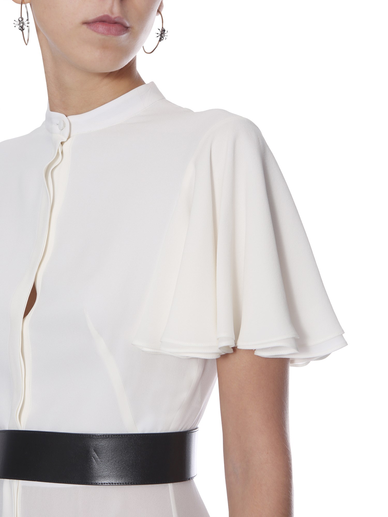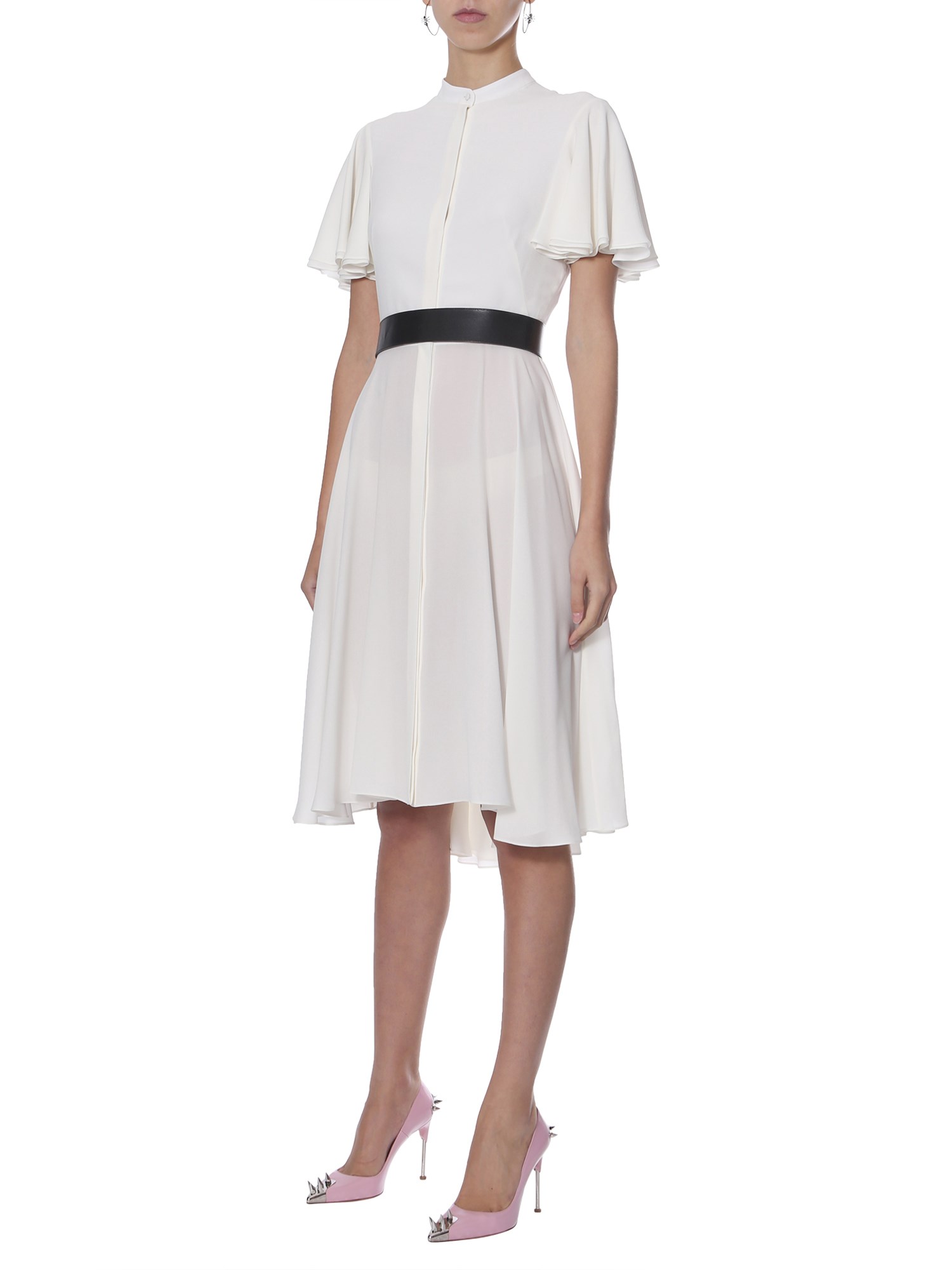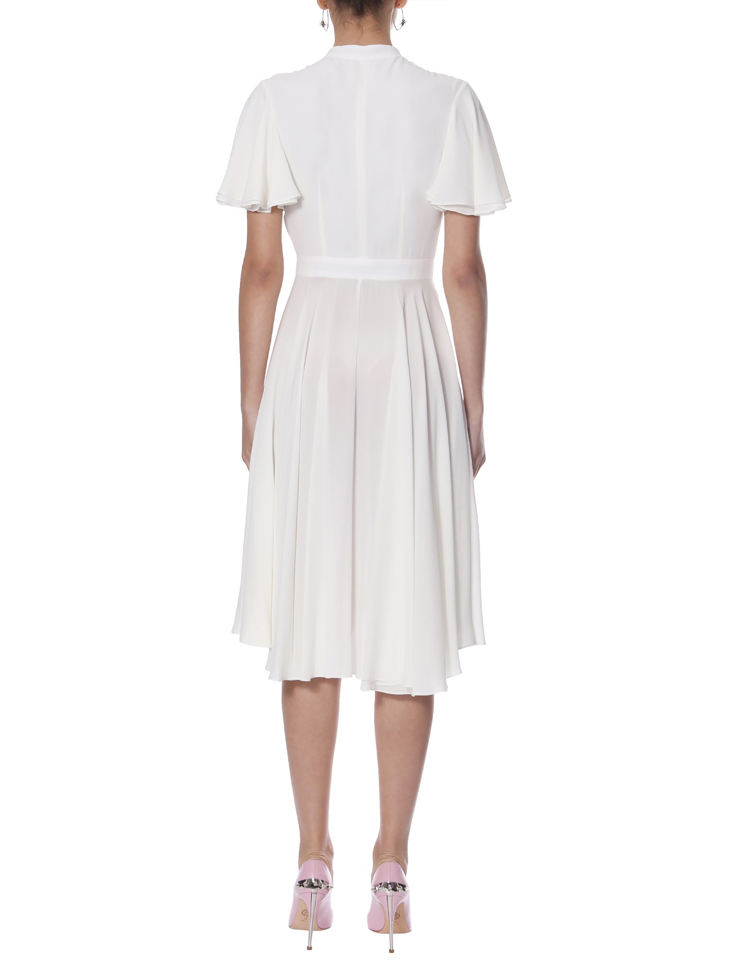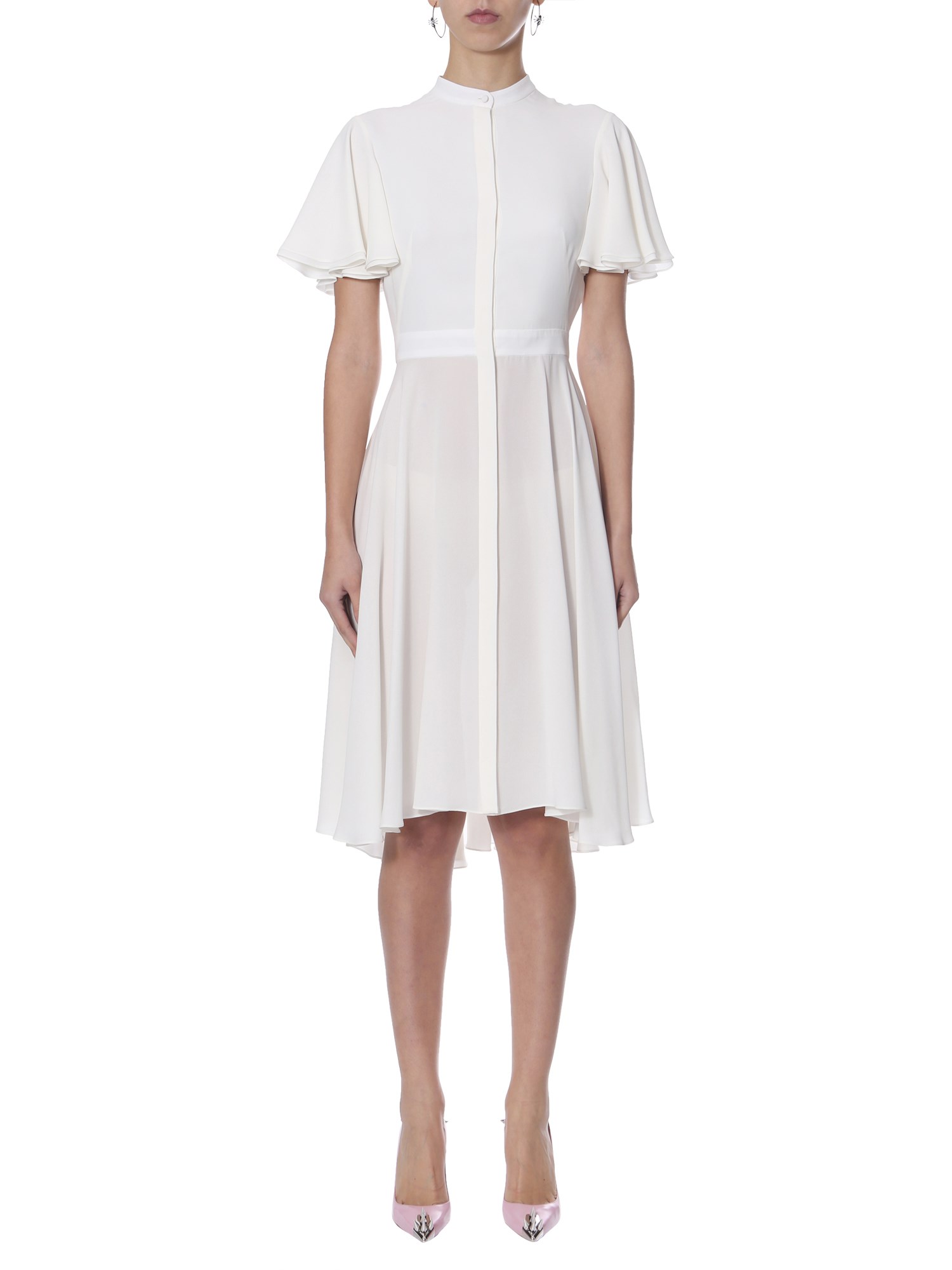 Express your demure style with this long silk dress from Alexander McQueen. The dress is designed with short petal sleeves that look great with its flowy skirt. This graceful dress has a hidden button closure and asymmetrical hem. It is made of premium silk fabric to remain comfortable throughout the wear.