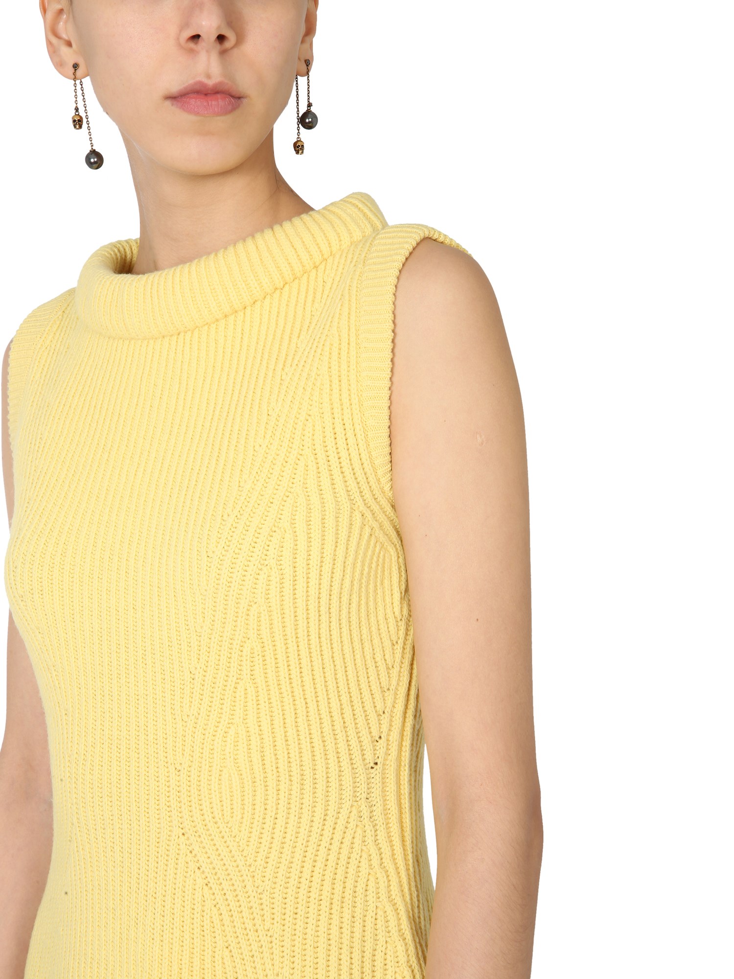 Dress up your mini dress with this knitted dress by Alexander McQueen that is perfect for the chilly weather. The dress is made of wool, so it will keep you warm and is the perfect material for the winter. The knit dress is a long sleeve dress that comes in one size and has a boat neck and rib knitting.