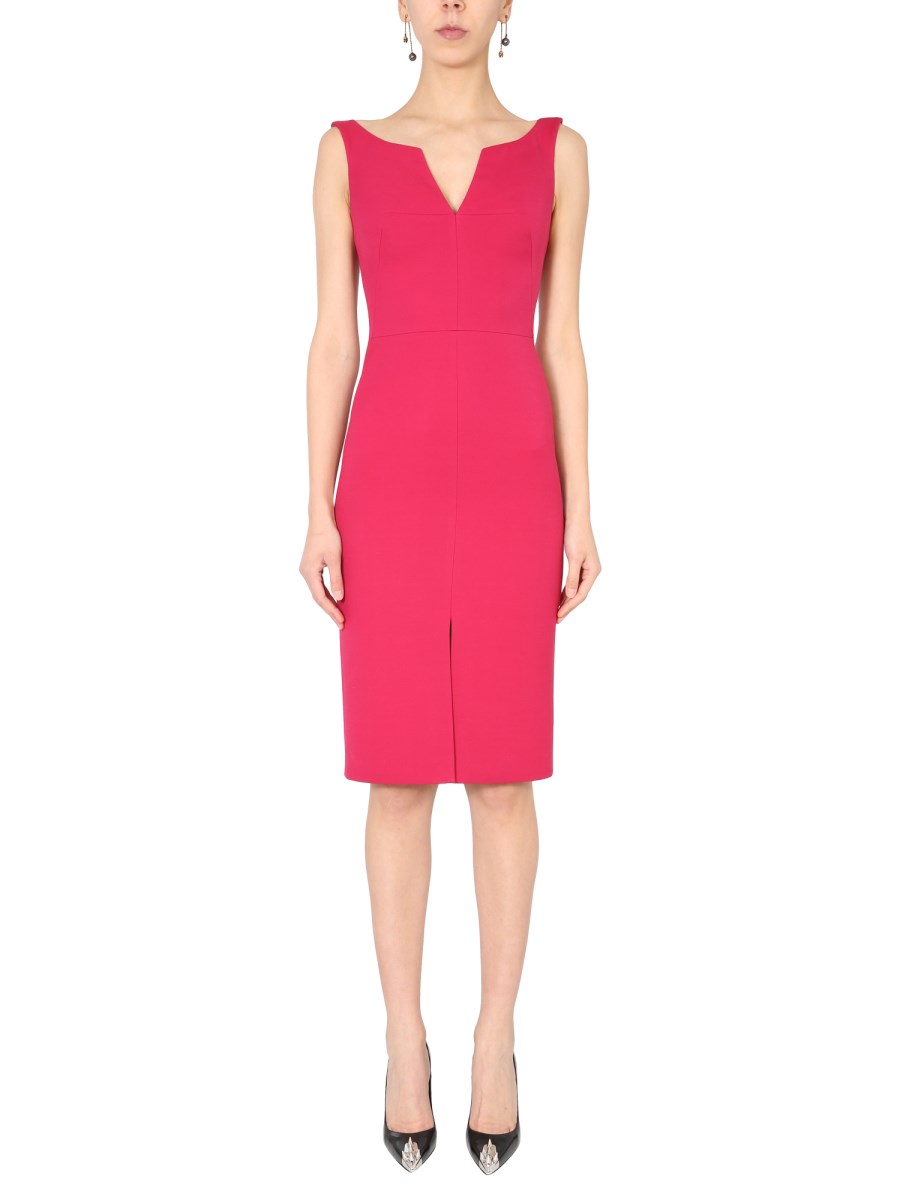 It's a casual dress by Alexander McQueen that has a soft, flattering silhouette and falls just below the knee. The design is made of a lightweight fabric that is wrinkle-resistant and has a four-way stretch. The dress has a V-neckline, zipper closure at the back, and no sleeves. The dress is made from 63% wool, 26% silk, and 12% polyamide.