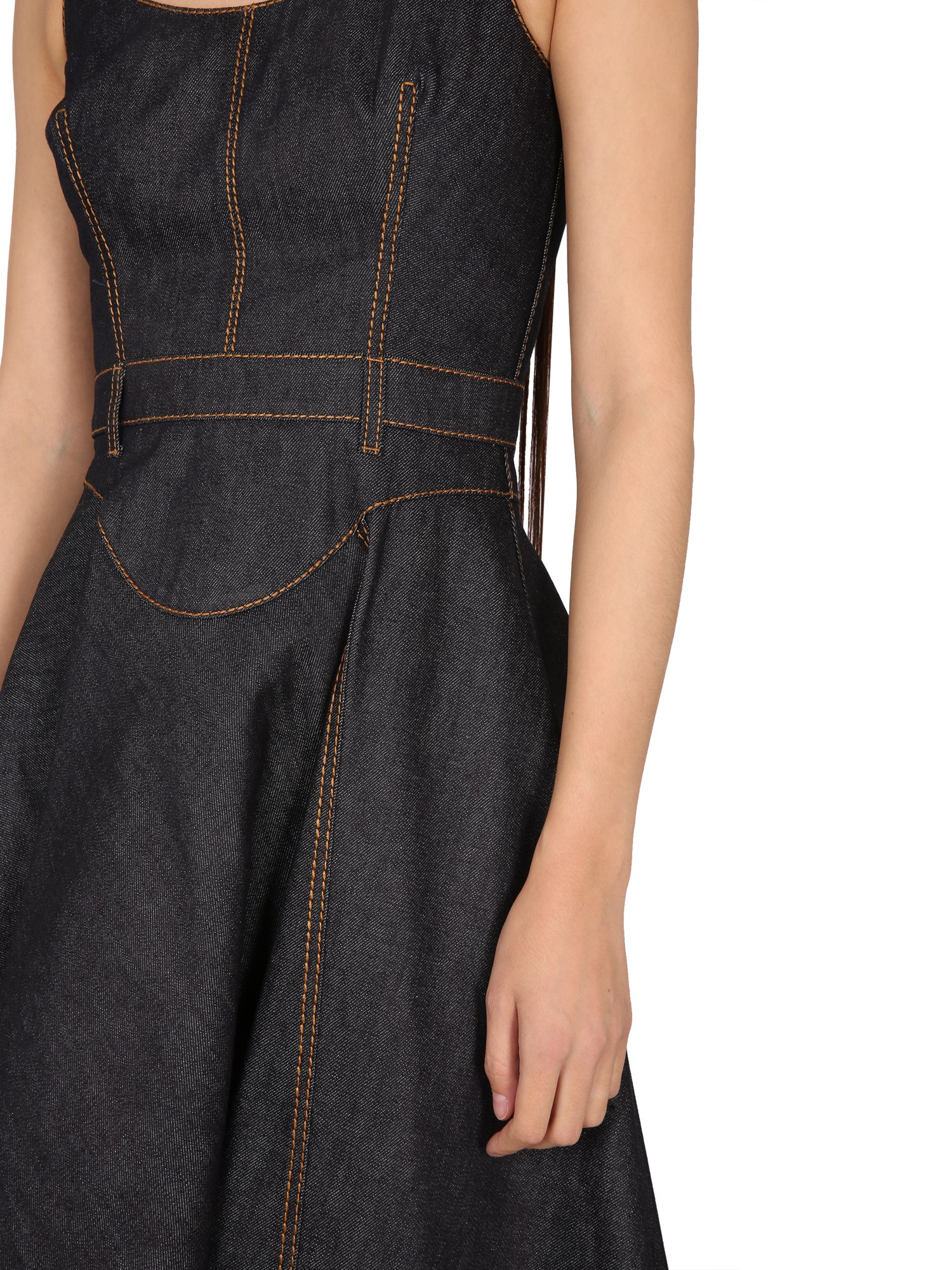 This denim dress from Alexander McQueen is a stylish way to add a touch of comfort to your everyday look. This style is made of a soft, durable denim fabric. The dress has thin shoulder straps and a round neckline with a zipper in the back. The cotton dress has belt loops at the waist and an asymmetrical bottom.