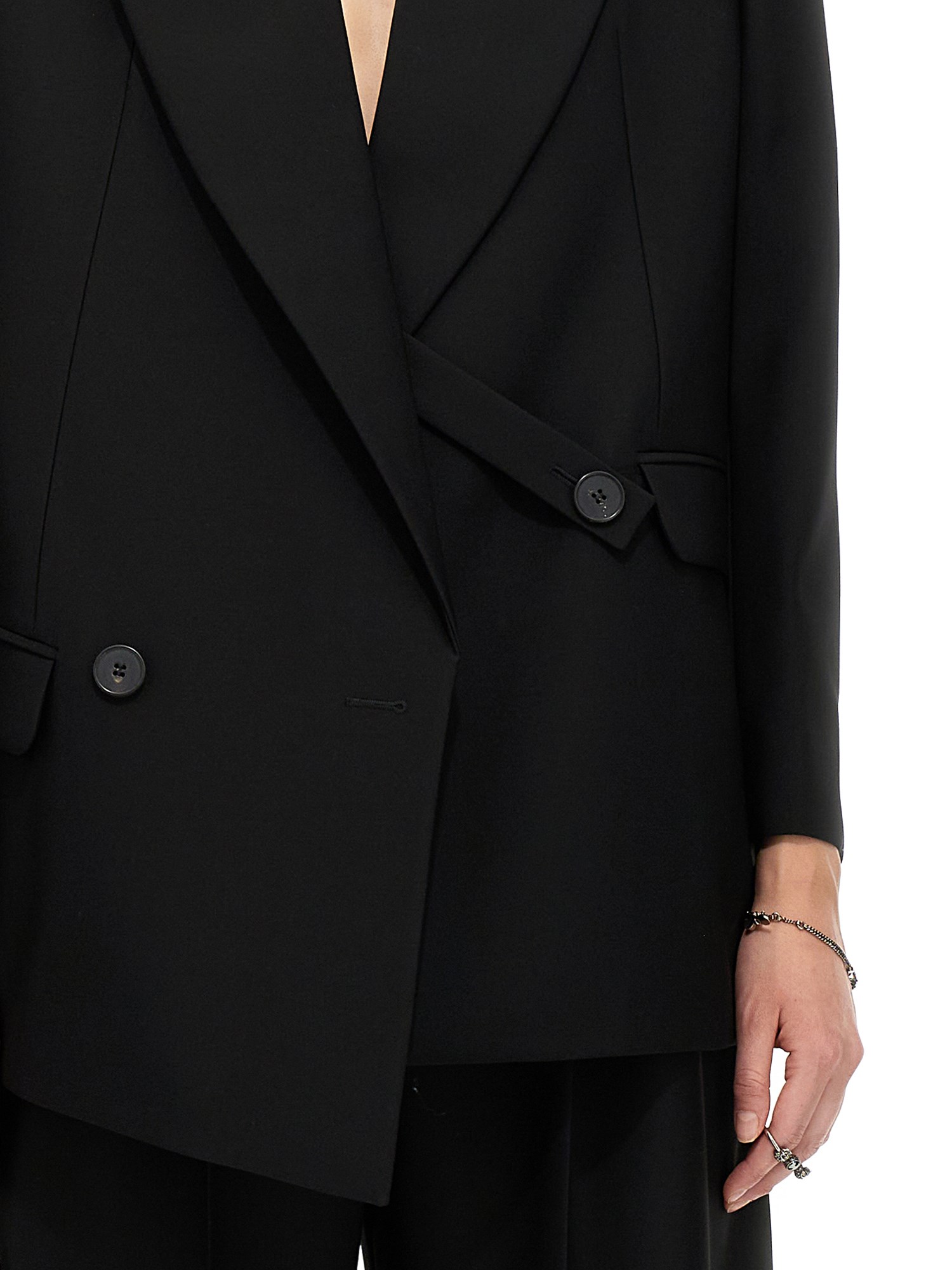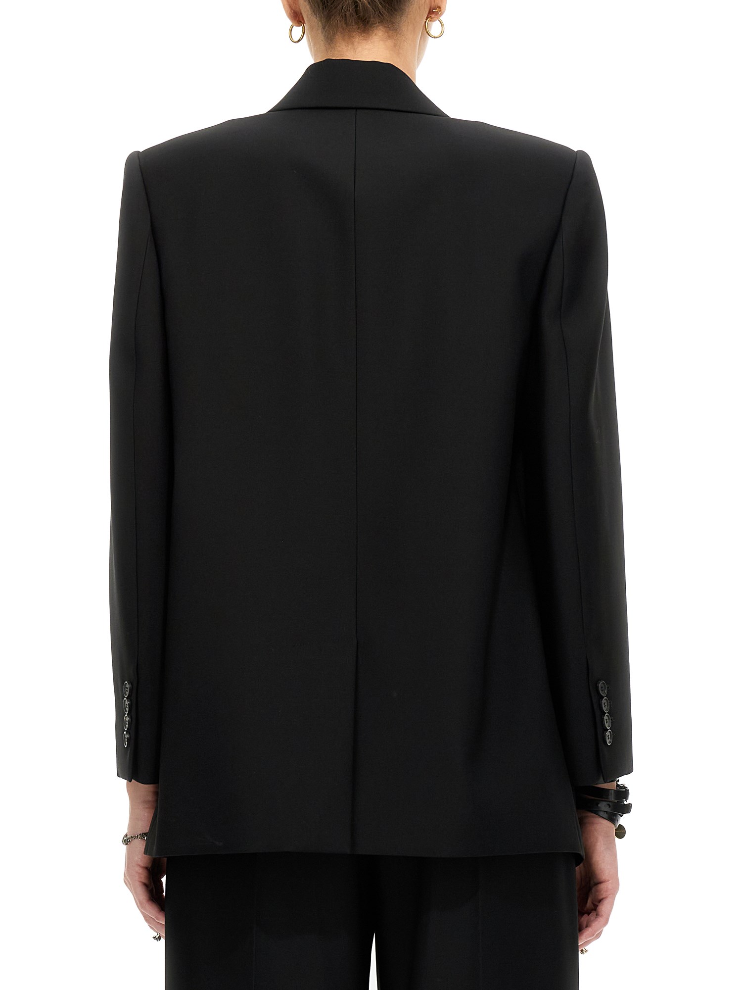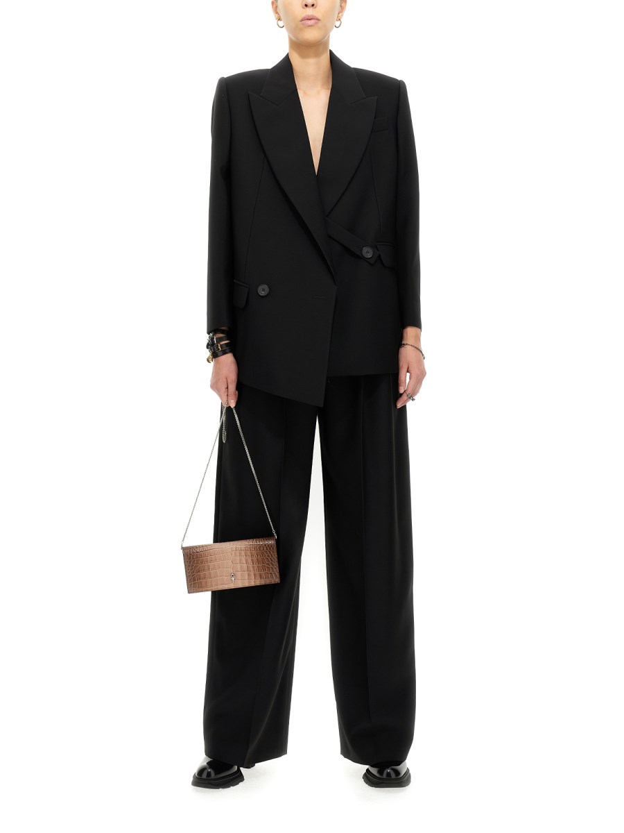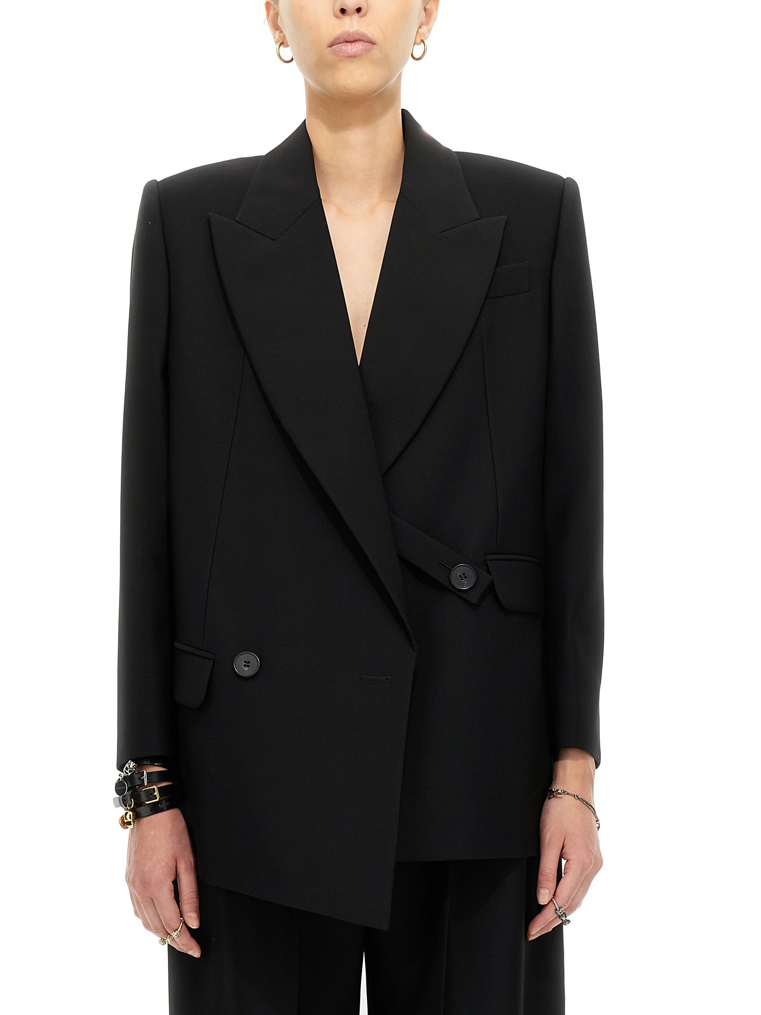 A wool jacket from Alexander McQueen is a classic outerwear piece. This jacket has a peaked lapel, a double-breasted tab and button closure, and wool material. With the distinctive peaked lapels and double-breasted closure, this wool jacket is the perfect way to keep warm. The black colour is a perfect match for fall.
