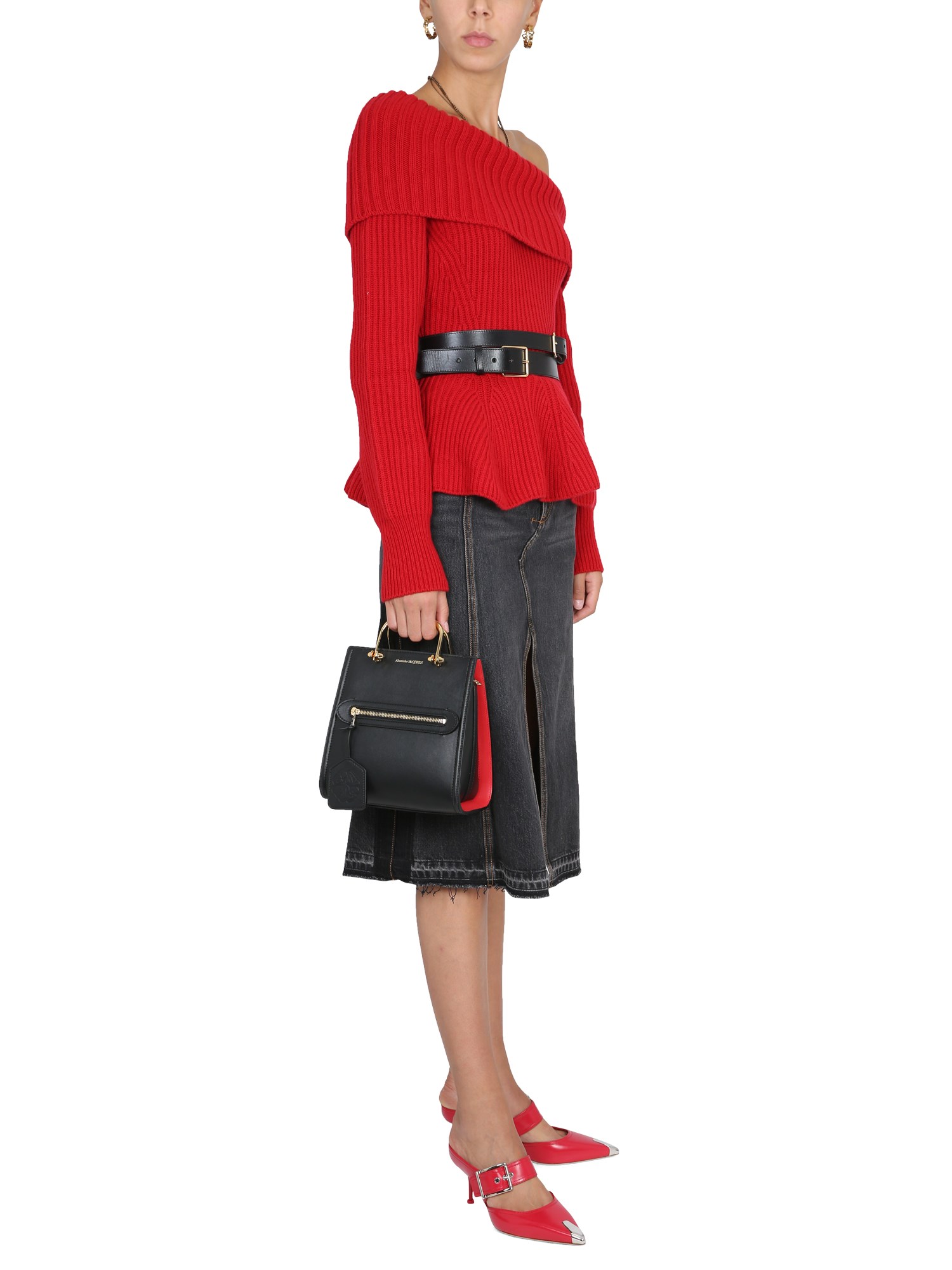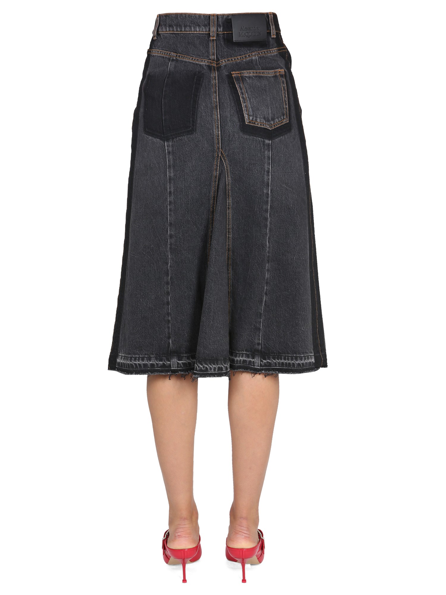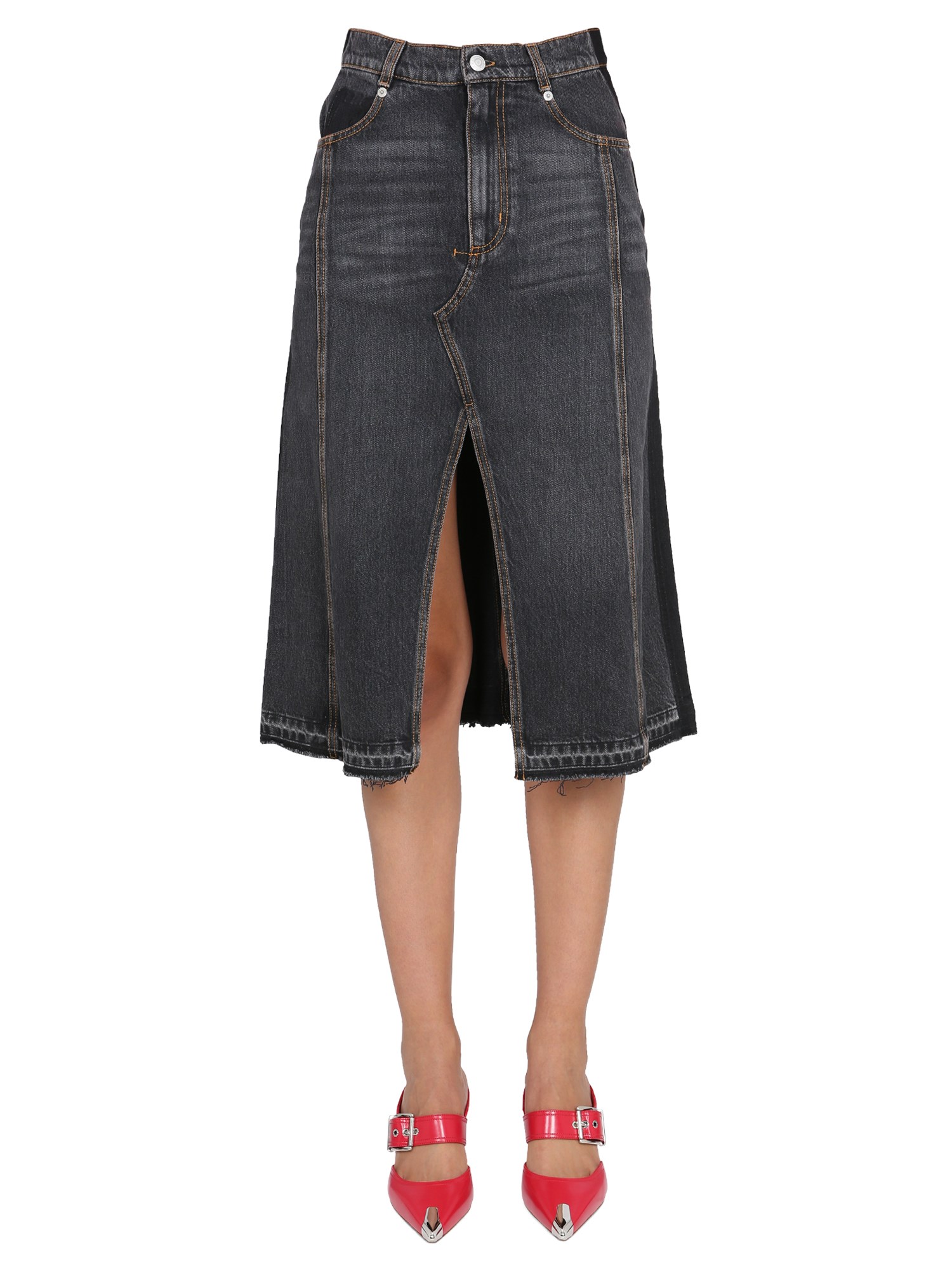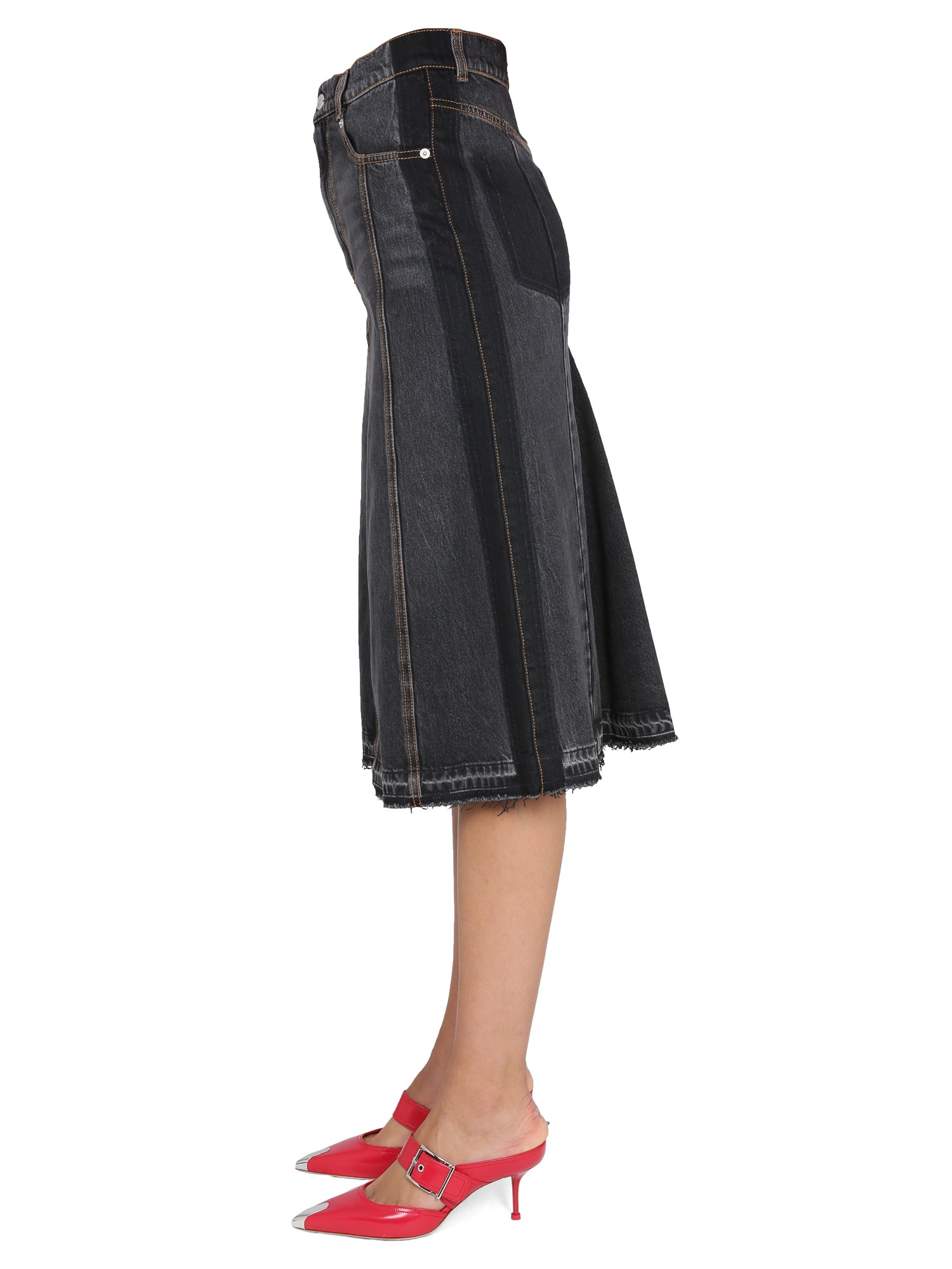 The denim flared skirt from the house of Alexander McQueen is a summer-ready must-have. With an ankle-length silhouette, this skirt can be paired with everything from a crisp shirt and sandals to a cute sweater and sneakers. It has belt loops at the waist with zipper and button closure and has two side pockets and a back pocket.