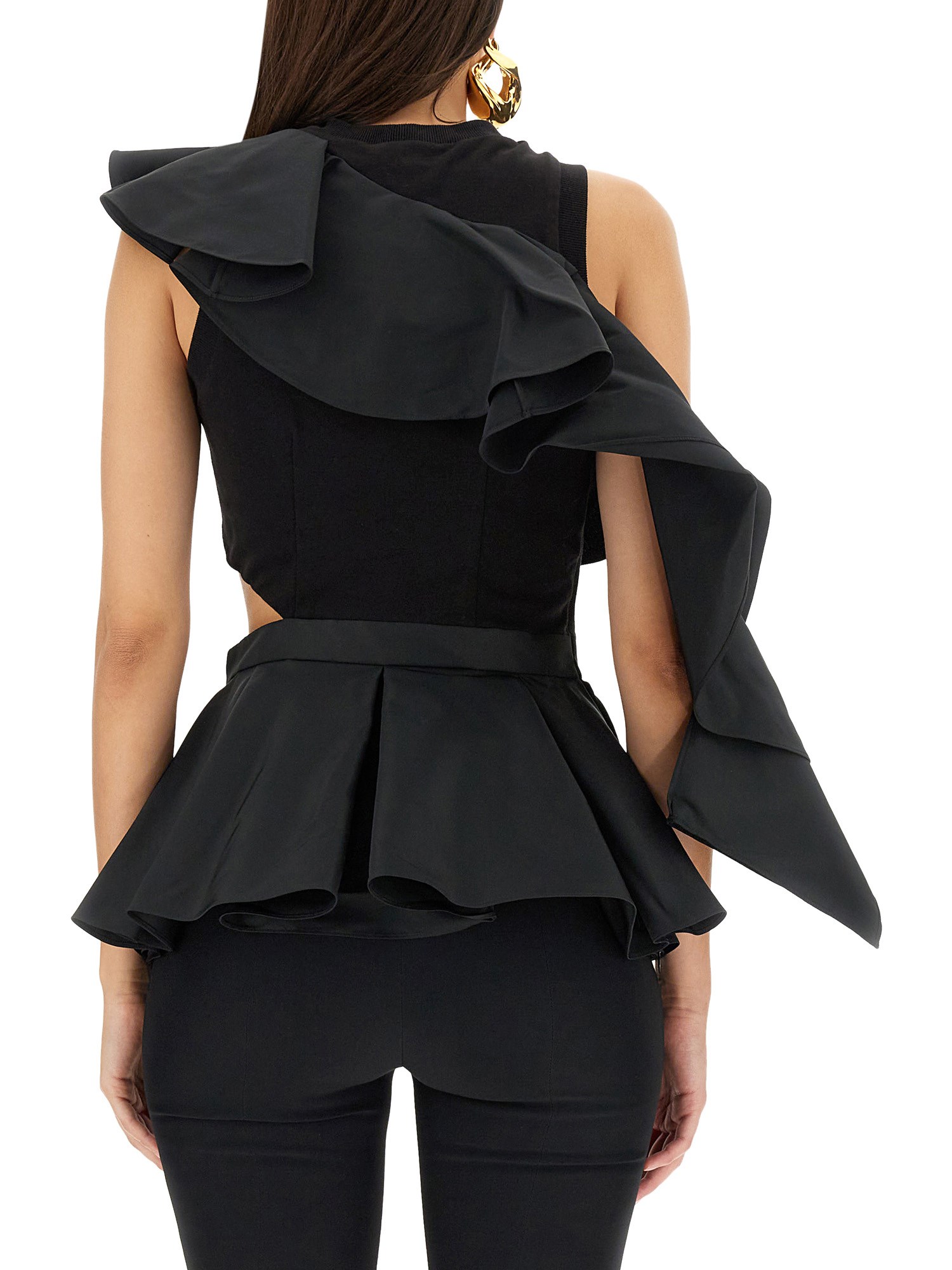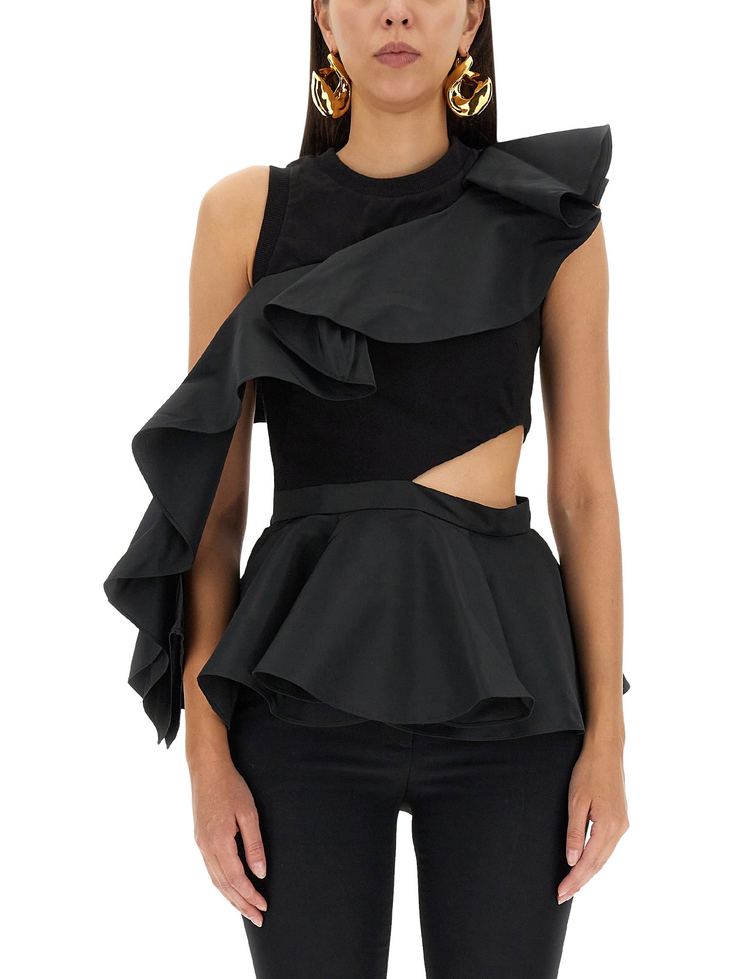 Get your outfit going with this regular fit, black top from Alexander McQueen. This cotton top has a cool and comfortable fit that's perfect for the fall season. It has a regular fit with a front ruffle cut-out detail. It is made of cotton that is breathable and comfortable.