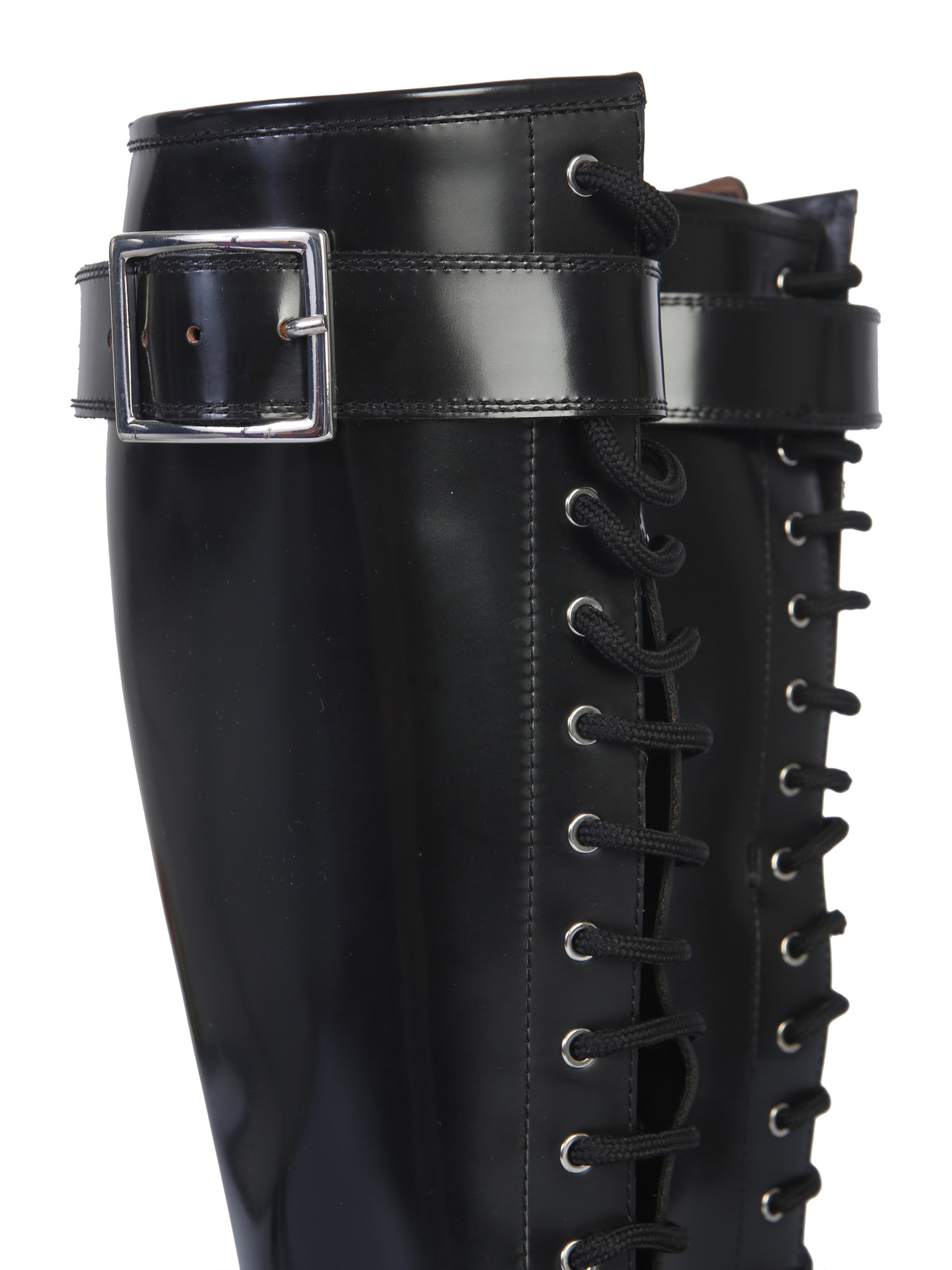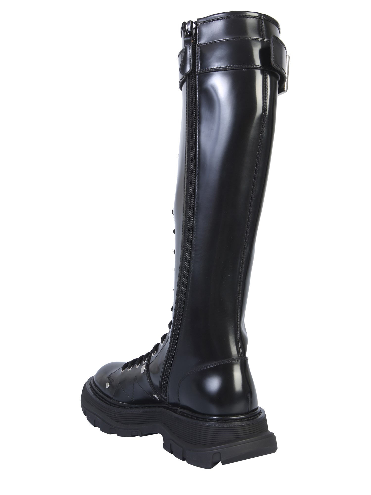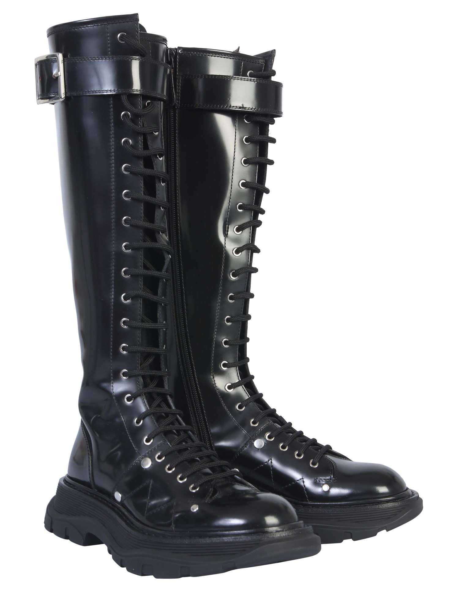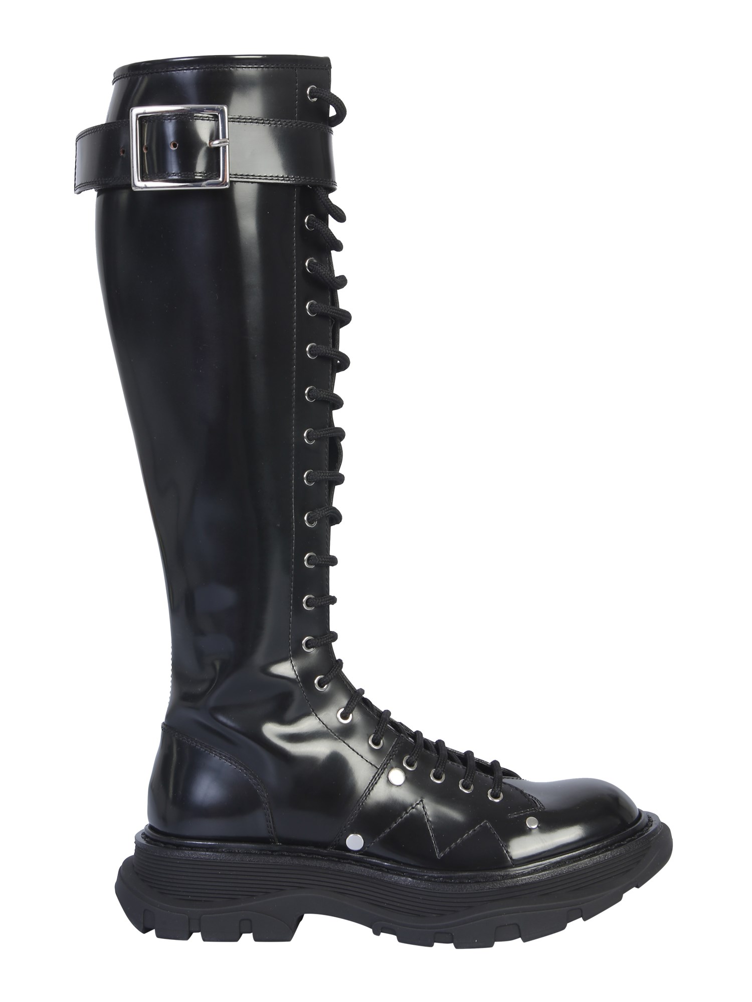 Dress up exquisitely by adding these Alexander McQueen leather boots with a tread sole. It has an all lace-up closure with a buckle strap on the neck. The upper and side quarters are all made from smooth and shiny leather material. These shoes come with replacement laces included in the package.