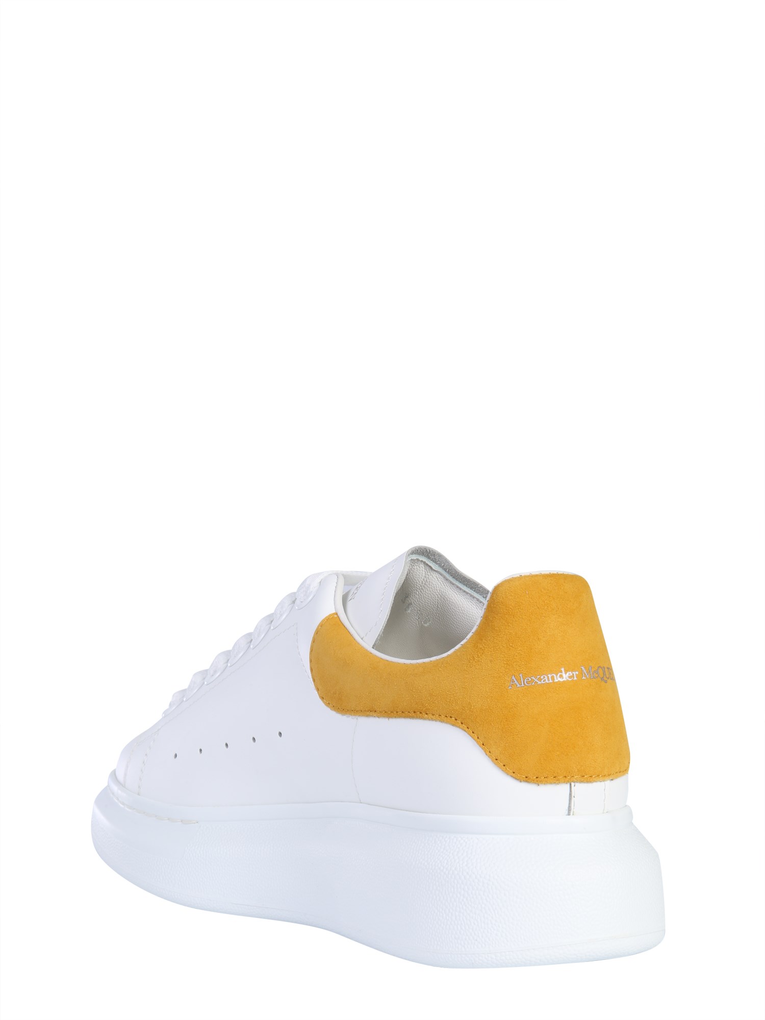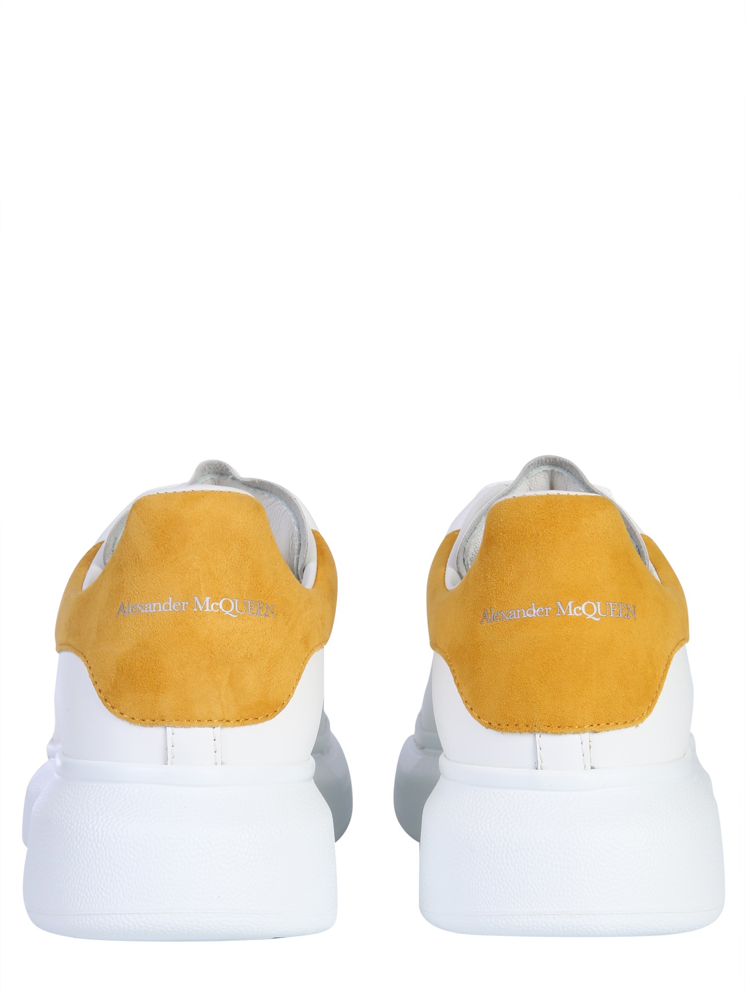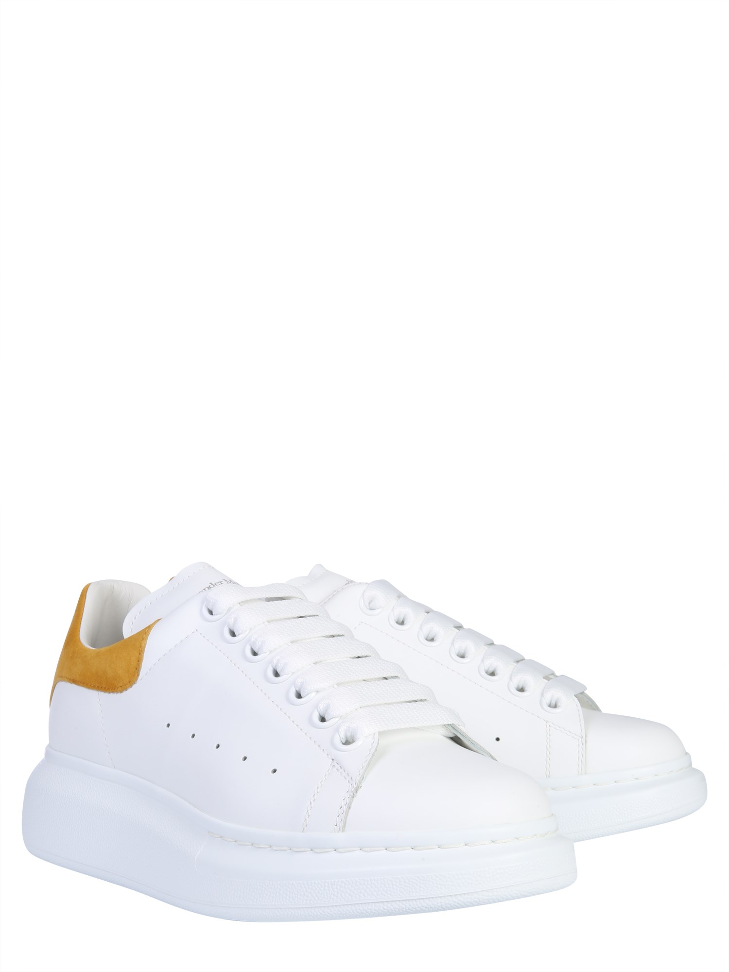 These oversize sneakers from Alexander McQueen are crafted in 100% leather for a fine finish. Standing on rubber outsole, the sneakers offer great traction across variety of terrains. Reinforced metal eyelets, lace-up closure allow custom-like comfortable fit. Logo on tongue and heel counter pronounce quality and luxury. Their monochromatic appeal is improved by contrasting suede insert on the heel counter.