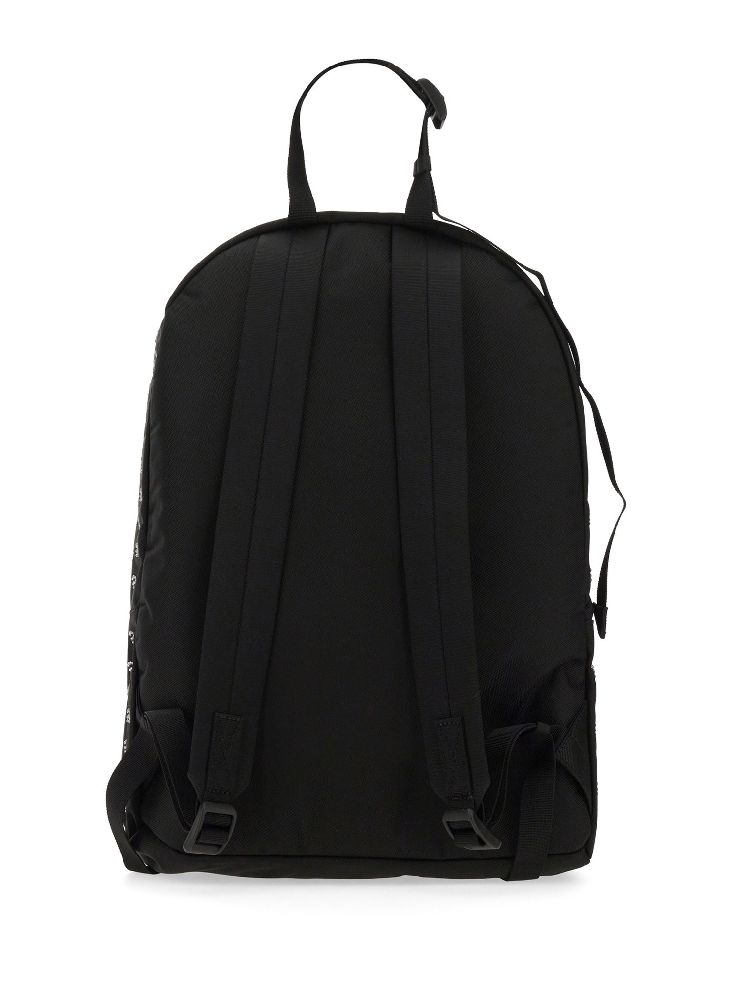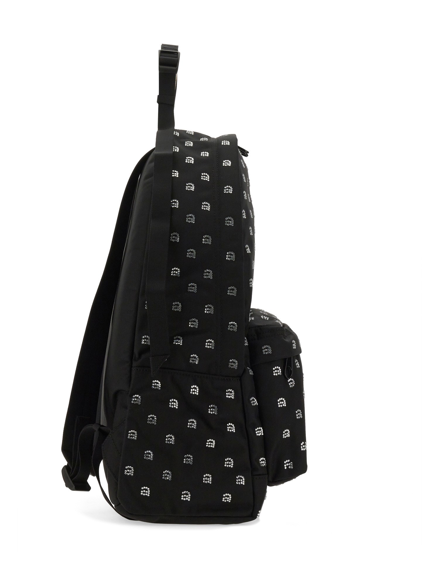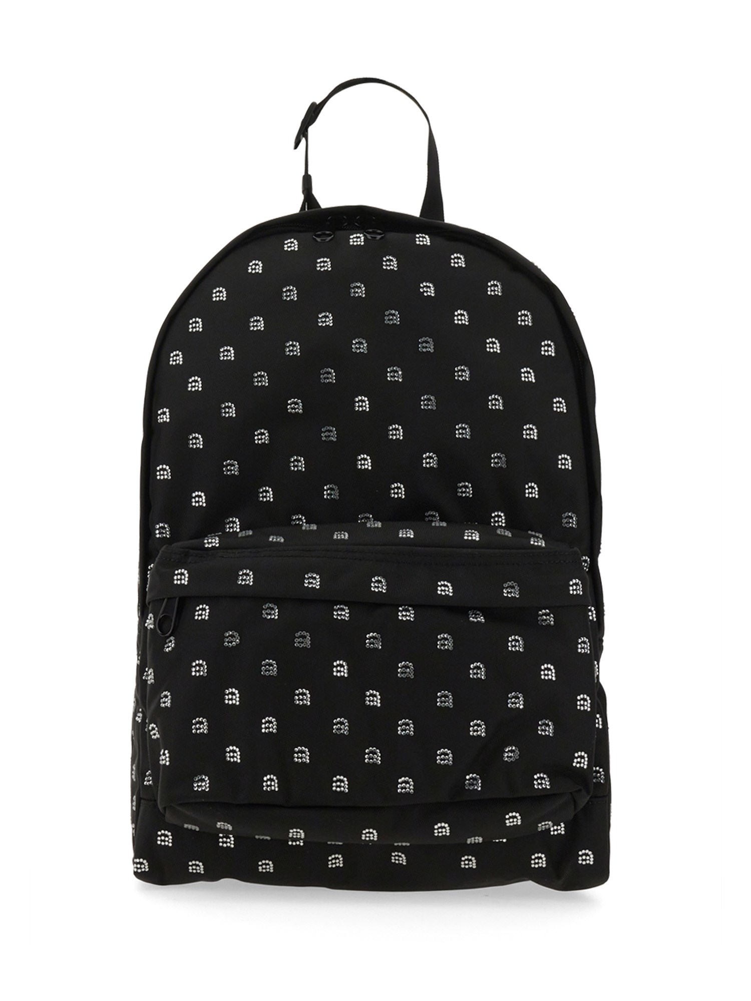 The Nylon Backpack from Alexander Wang is a backpack that is both stylish and practical. It has a wide opening and it has a removable strap that can be attached to the side of the backpack. The backpack is made from nylon material, and it has a zipper closure. It is a very durable backpack, and it has an adjustable top handle and all-over crystal decoration.