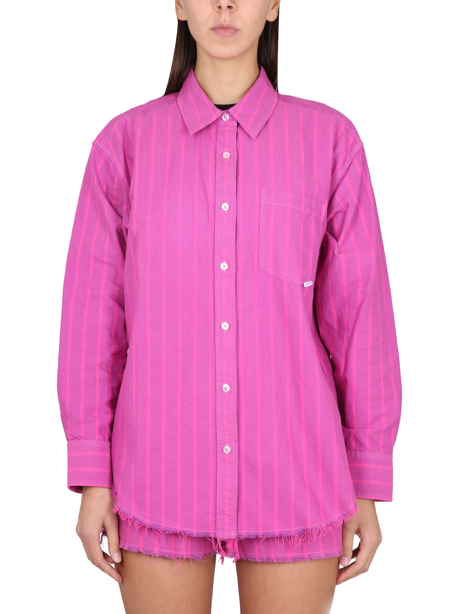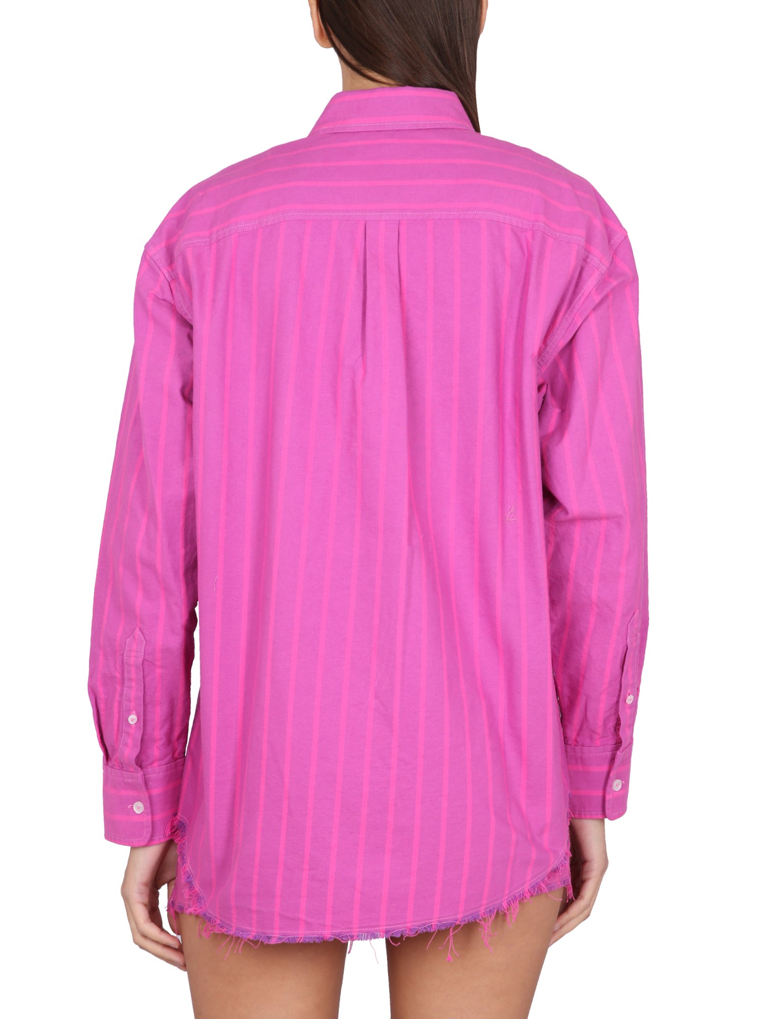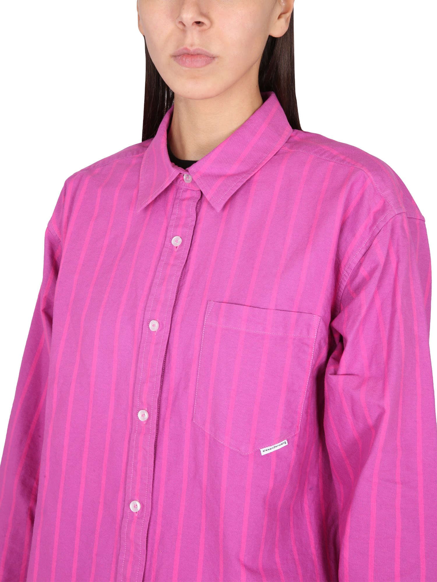 This cotton shirt from Alexanderwang T. is the perfect staple to any wardrobe. This is a raw cut, long sleeve shirt with a classic collar button closure chest pocket. It has a striped pattern and raw hem. The sleeves are also long, so it is perfect for wearing over a tank top or dress.