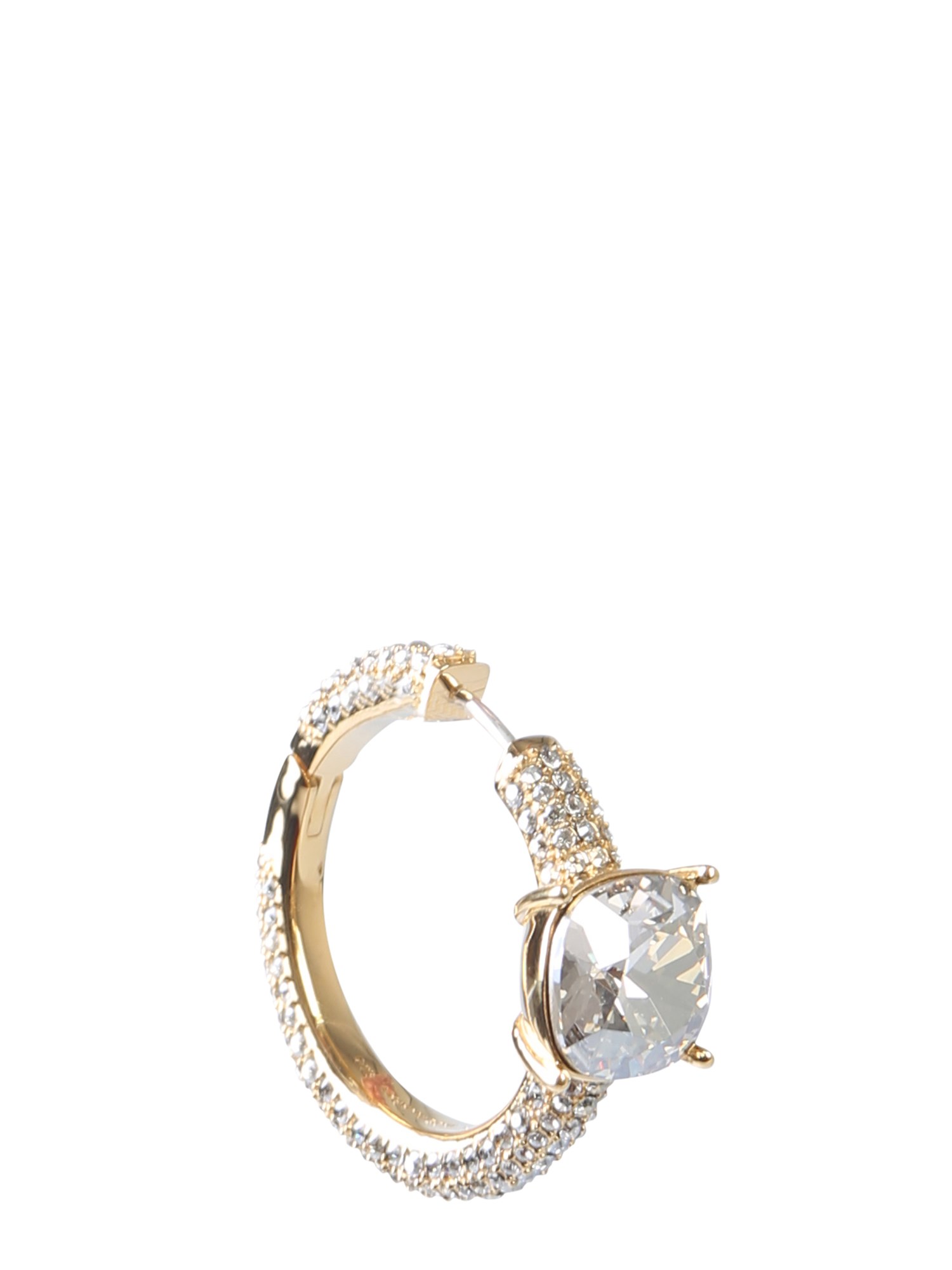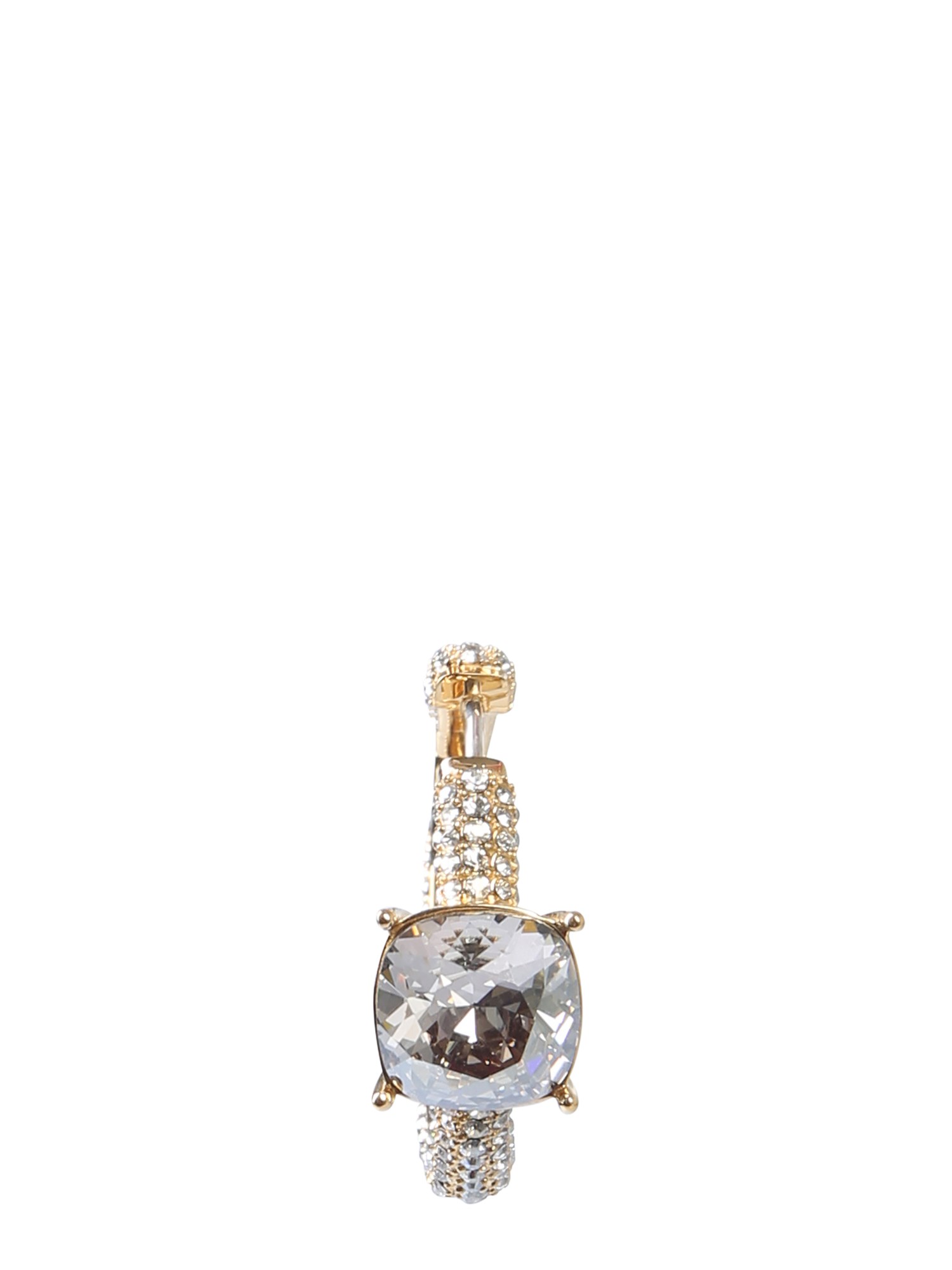Casual or party wear, this single earringfrom Ambush will complement all your favourite outfits. It has a gold-plated structure with a solitaire studding in the centre and Swarovski crystals in pavé stonesetting all around it. This hoop earring looks best on a top ear piercing or with a single drop earring on the other ear.