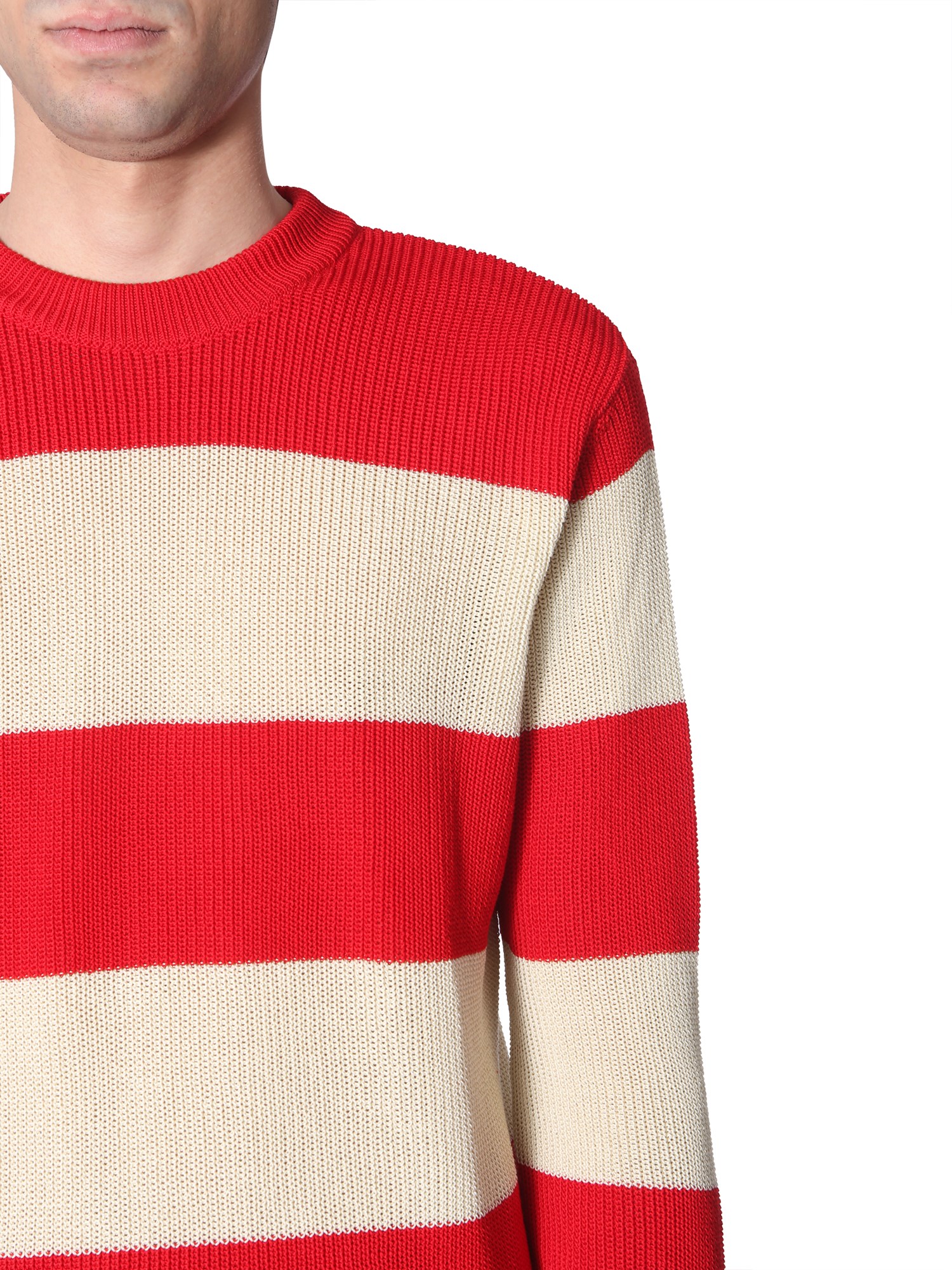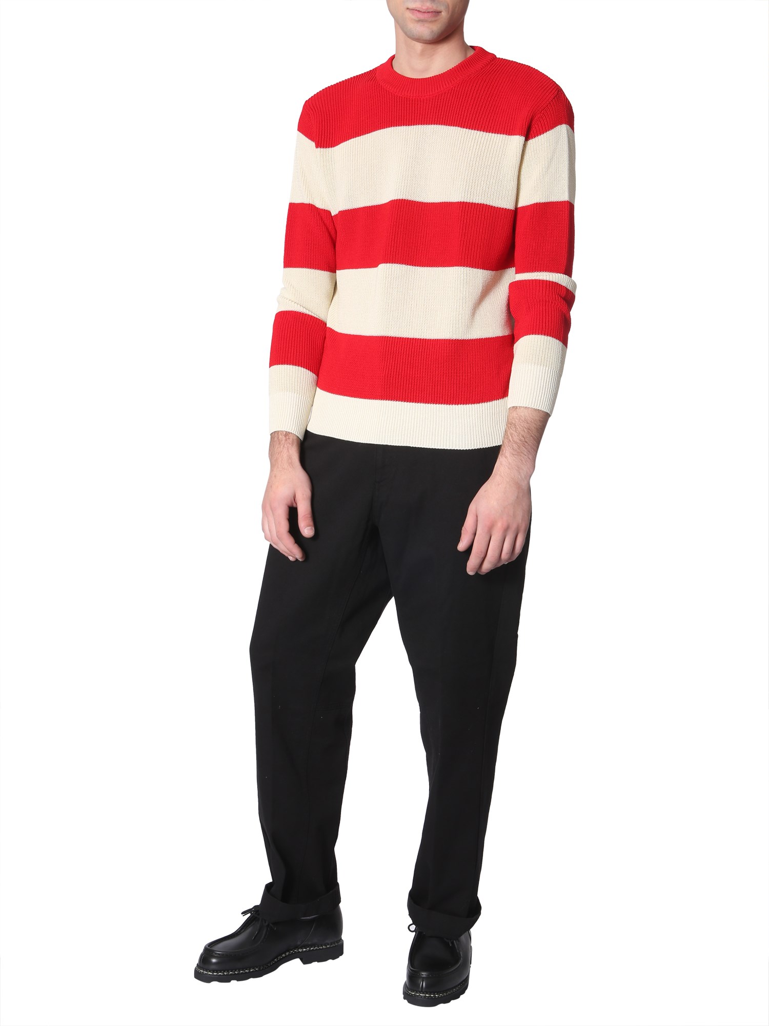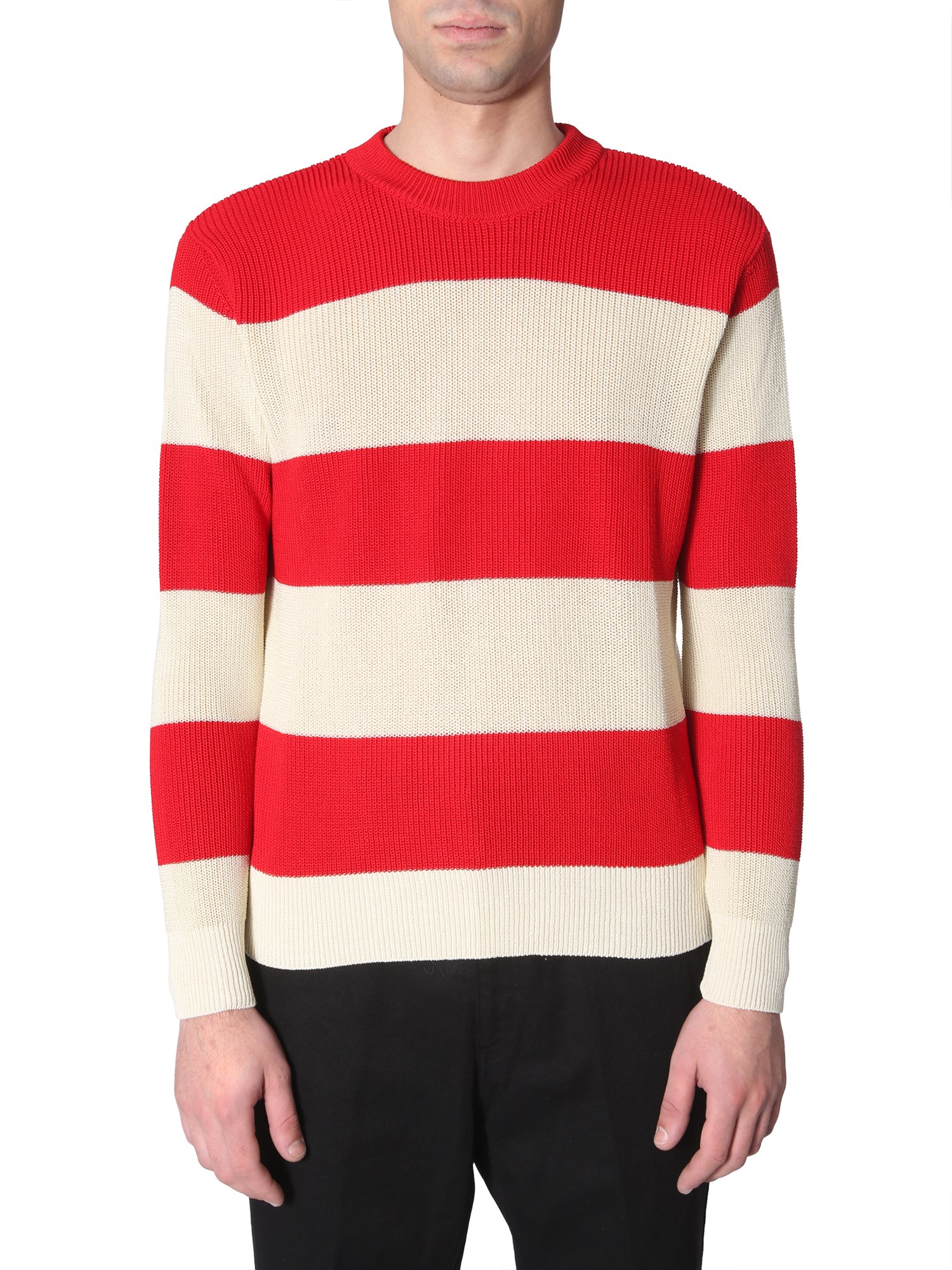Update your upscale-casual style with this striped cotton sweater from AMI. Tailored from lightweight cotton fabric, the sweater is comfortable. It features a striped pattern on the front with ribbed cuffs. You can layer a formal striped shirt under this sweater or it can be worn independently. Pair it with a black formal pant to get a complete look.