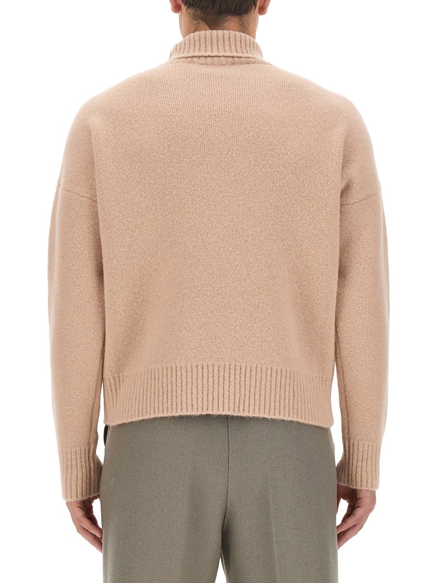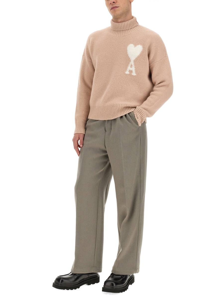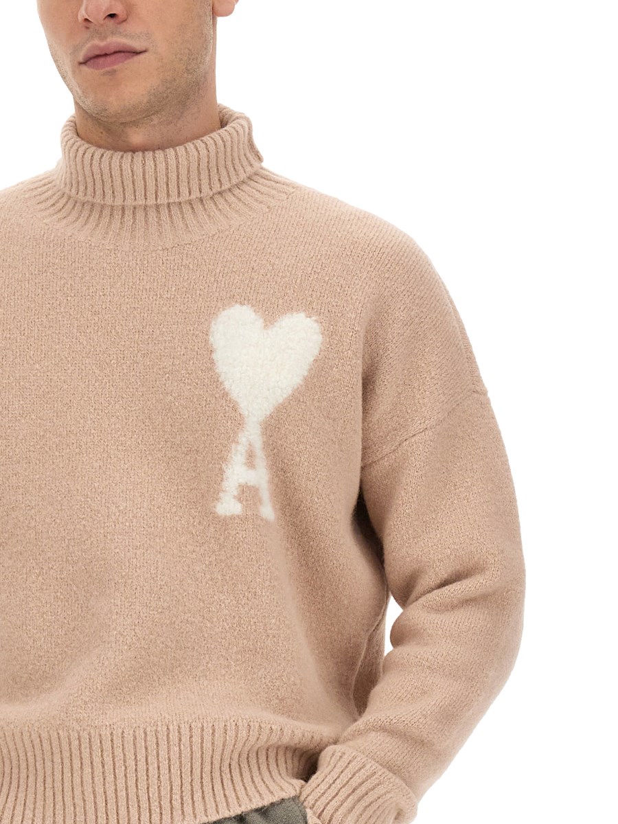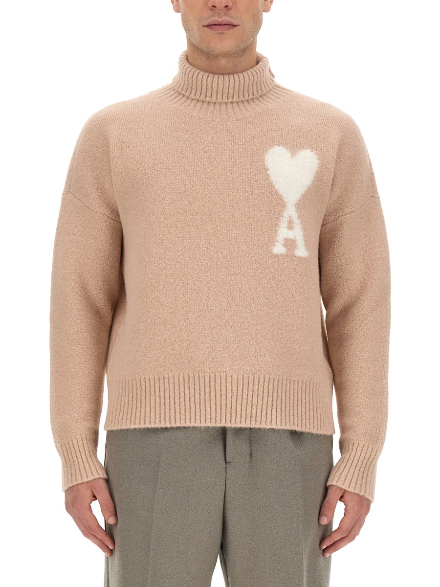 This high neck jersey sweater with logo from Ami Paris combines style and comfort effortlessly. Crafted from a blend of luxurious Alpaca wool and durable polyamide, this sweater is perfect for both casual and formal occasions. The high neck design adds an elegant touch, while the soft and cosy fabric keeps you warm during the colder months. The signature Ami Paris logo subtly enhances the sweater, adding a touch of sophistication.