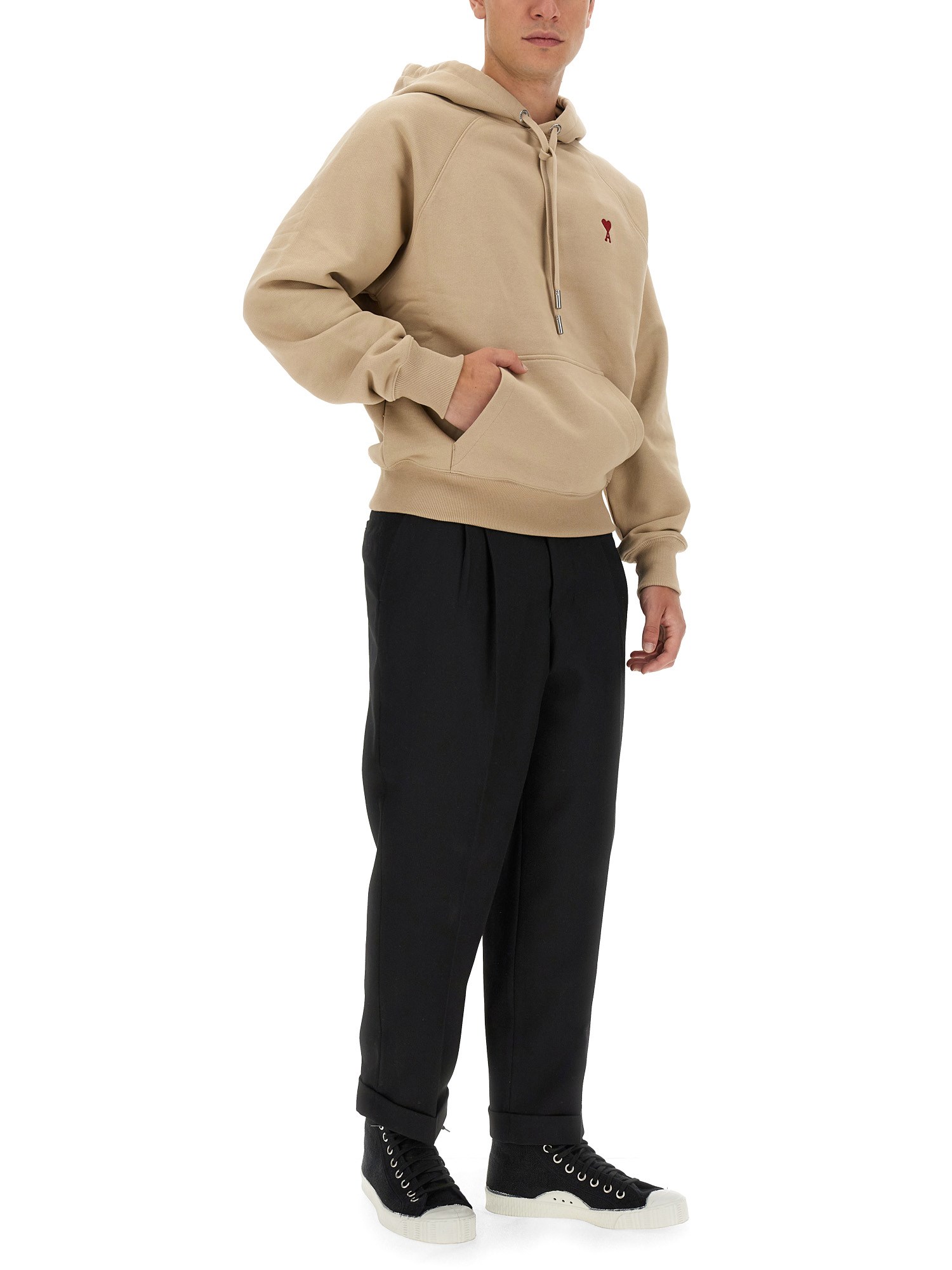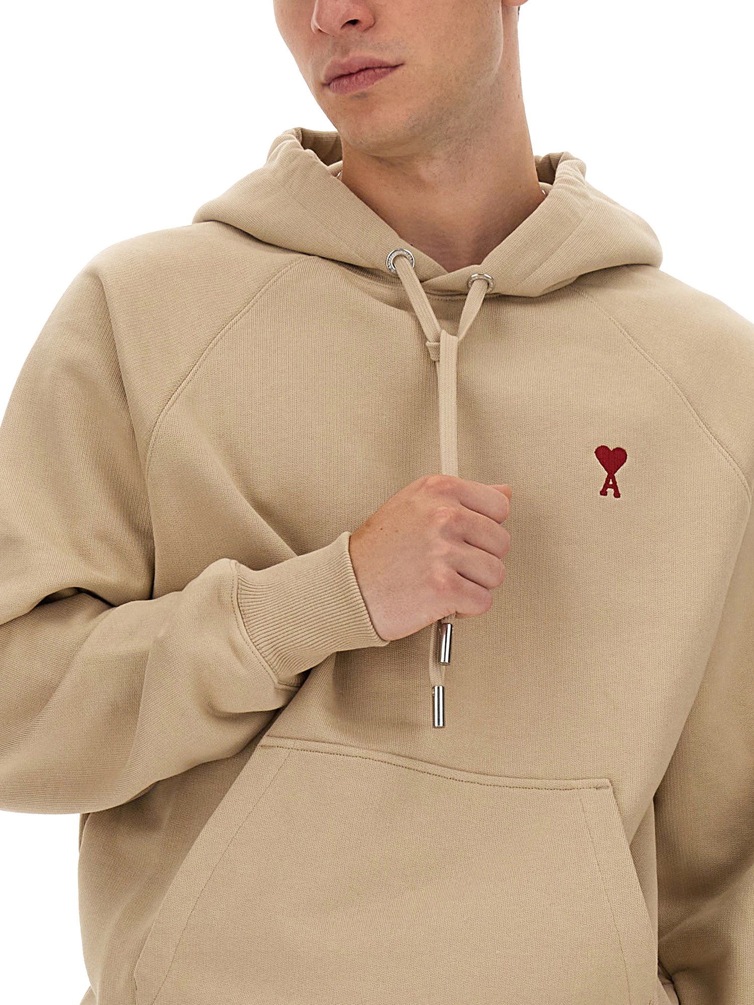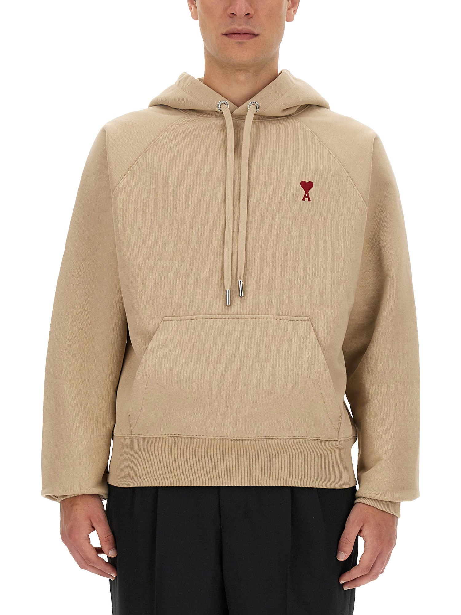 This sweatshirt from Ami paris is perfect for the season! It is made of cotton material and features drawstring hood, pouch pocket, and a beige colour. This soft, thick, and lightweight sweatshirt is the perfect piece to take on a walk in the park or for a night out. Its sweatshirt material has a relaxed and casual look that is a perfect blend of functionality and style.