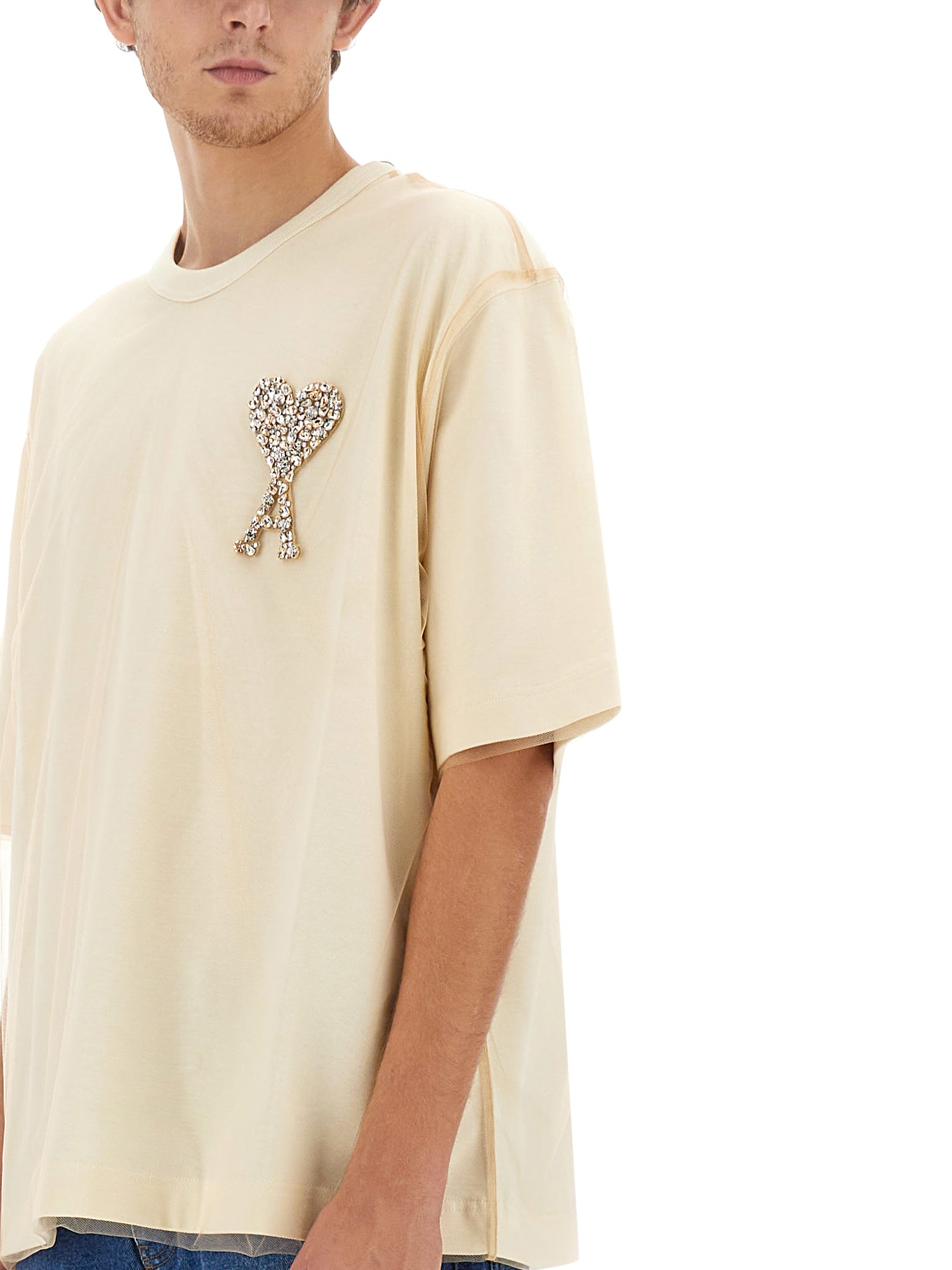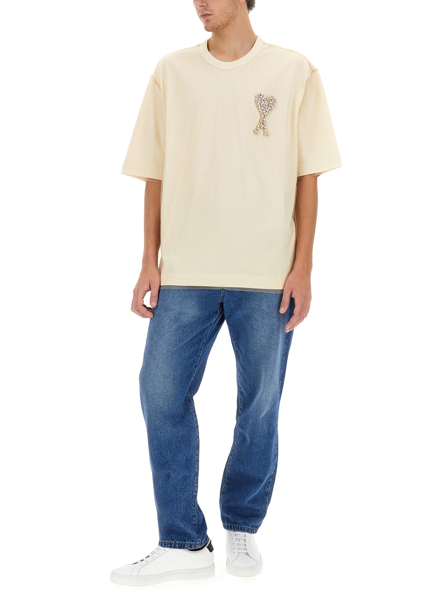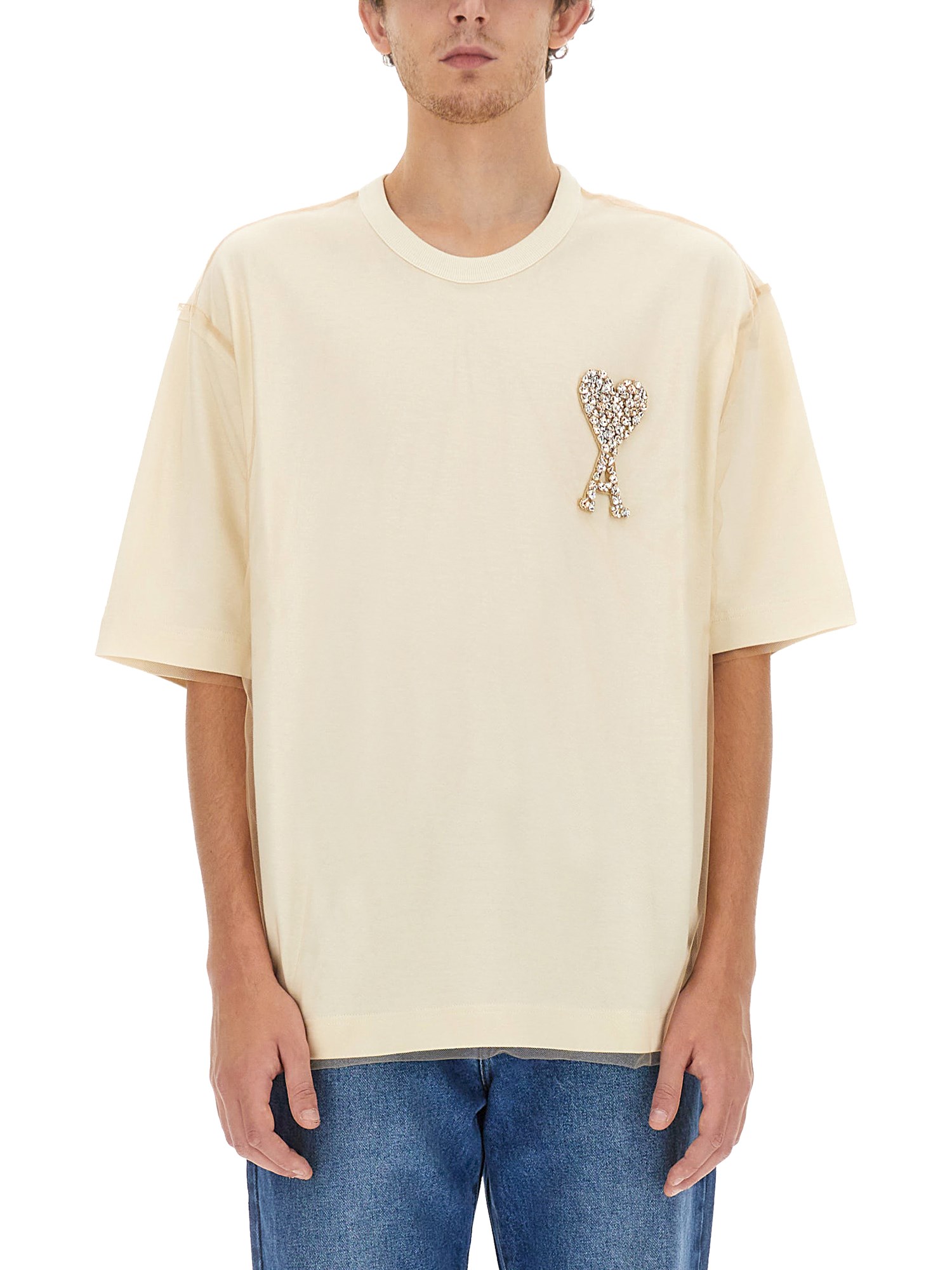 Step up your style game with the T-shirt with logo by Ami Paris. With its classic crew neckline and short sleeves, this tee exudes a timeless appeal. Its lightweight fabric ensures breathability, perfect for those warm days or intense activities. The straight hemline gives a polished touch, making it suitable for both casual and semi-formal occasions.