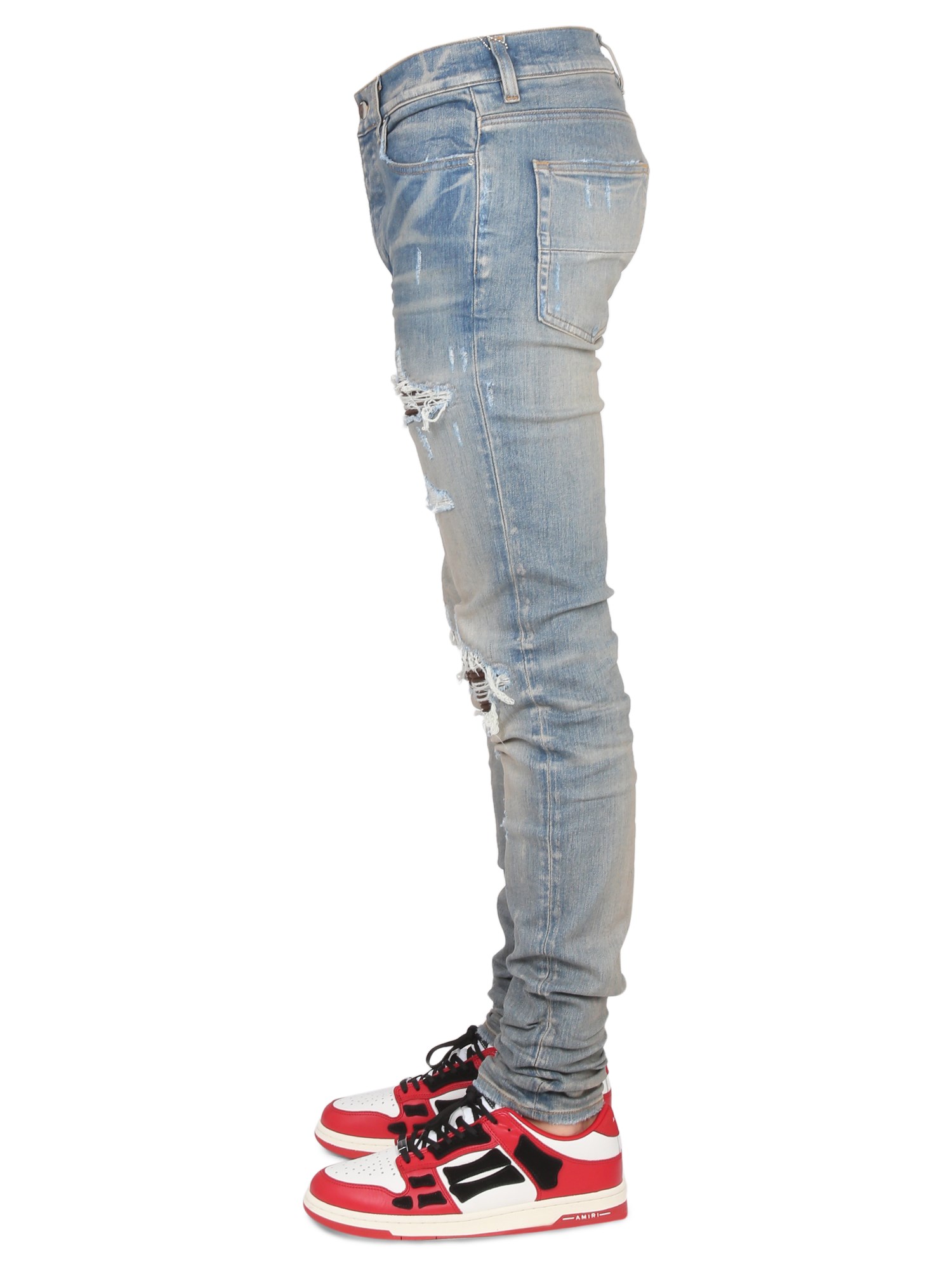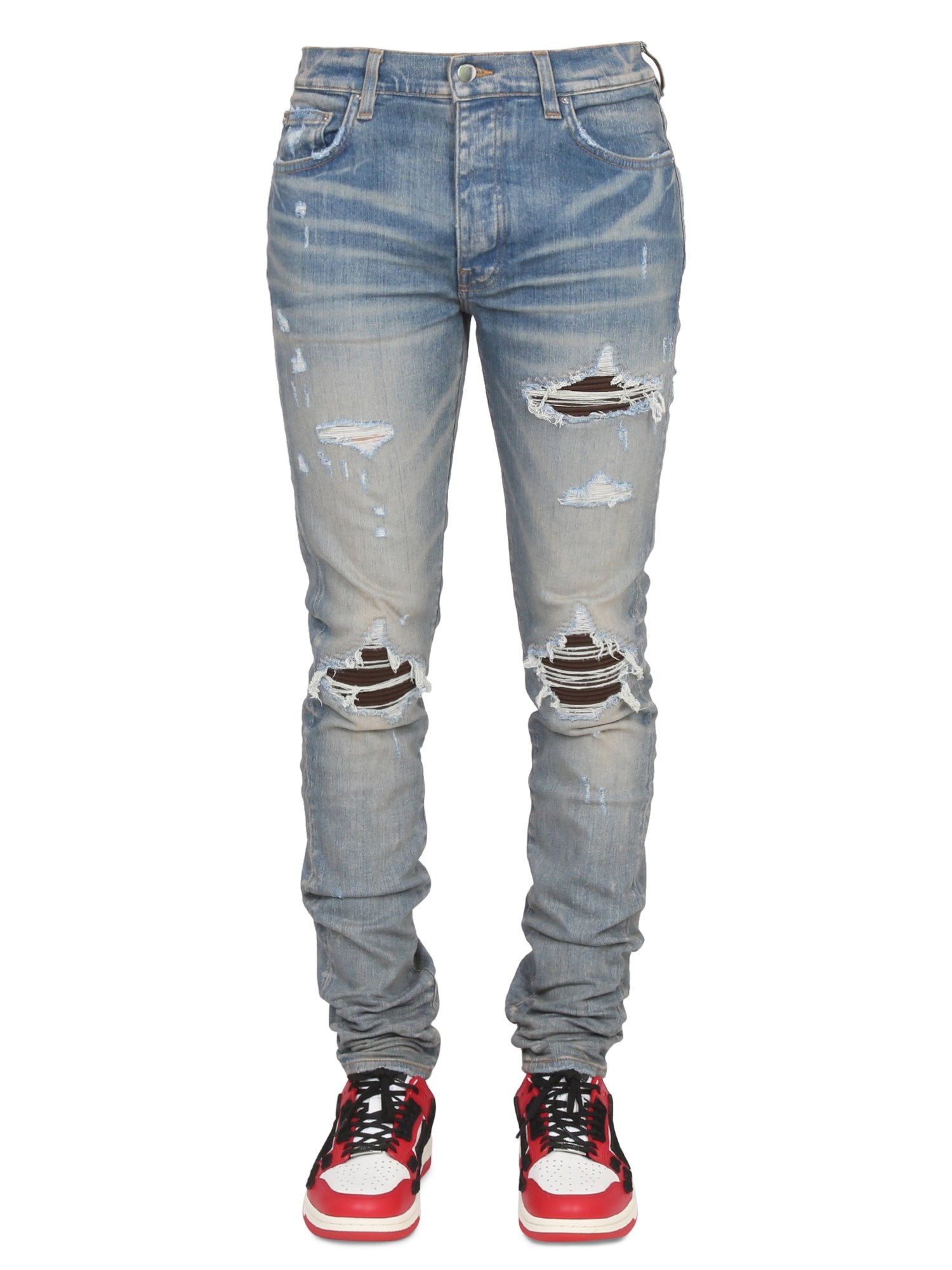 The slim-fit jeans from the house of Amiri are simple, straight-legged jeans with a mid-waist, featuring five-pocket styling and a skinny leg. It has belt loops at the waist with a button and zipper closure. It also has tears and lea5ther patches. They are a basic staple that is a must-have in every man's wardrobe.