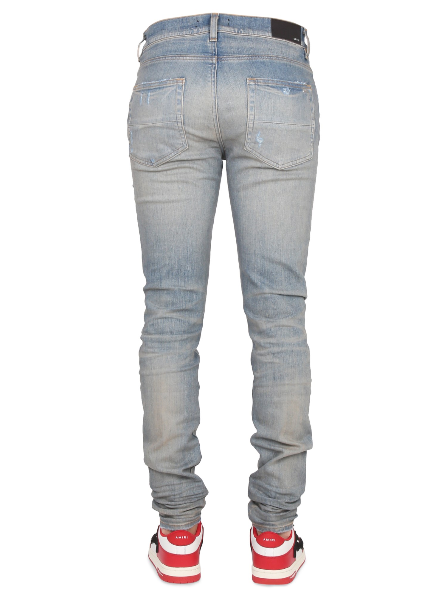 The slim-fit jeans from the house of Amiri are simple, straight-legged jeans with a mid-waist, featuring five-pocket styling and a skinny leg. It has belt loops at the waist with a button and zipper closure. It also has tears and lea5ther patches. They are a basic staple that is a must-have in every man's wardrobe.