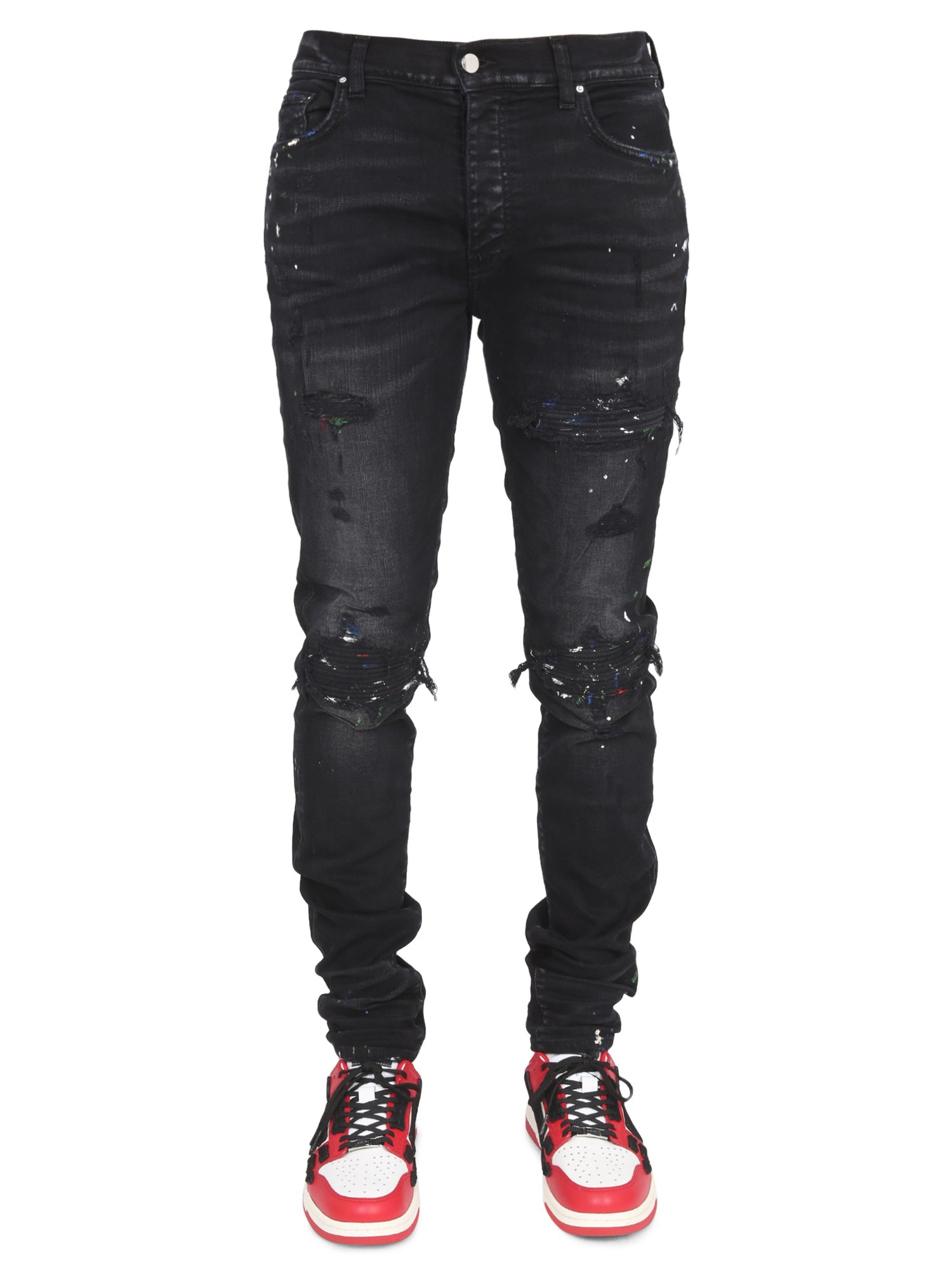 The slim-fit jeans from the house of Amiri are your classic, casual, go-to jean that has a perfect fit. It has belt loops at the waist with a button and zipper closure. The jeans have a five-pocket design and tears and patches details. It is decorated with paint splash for added style.