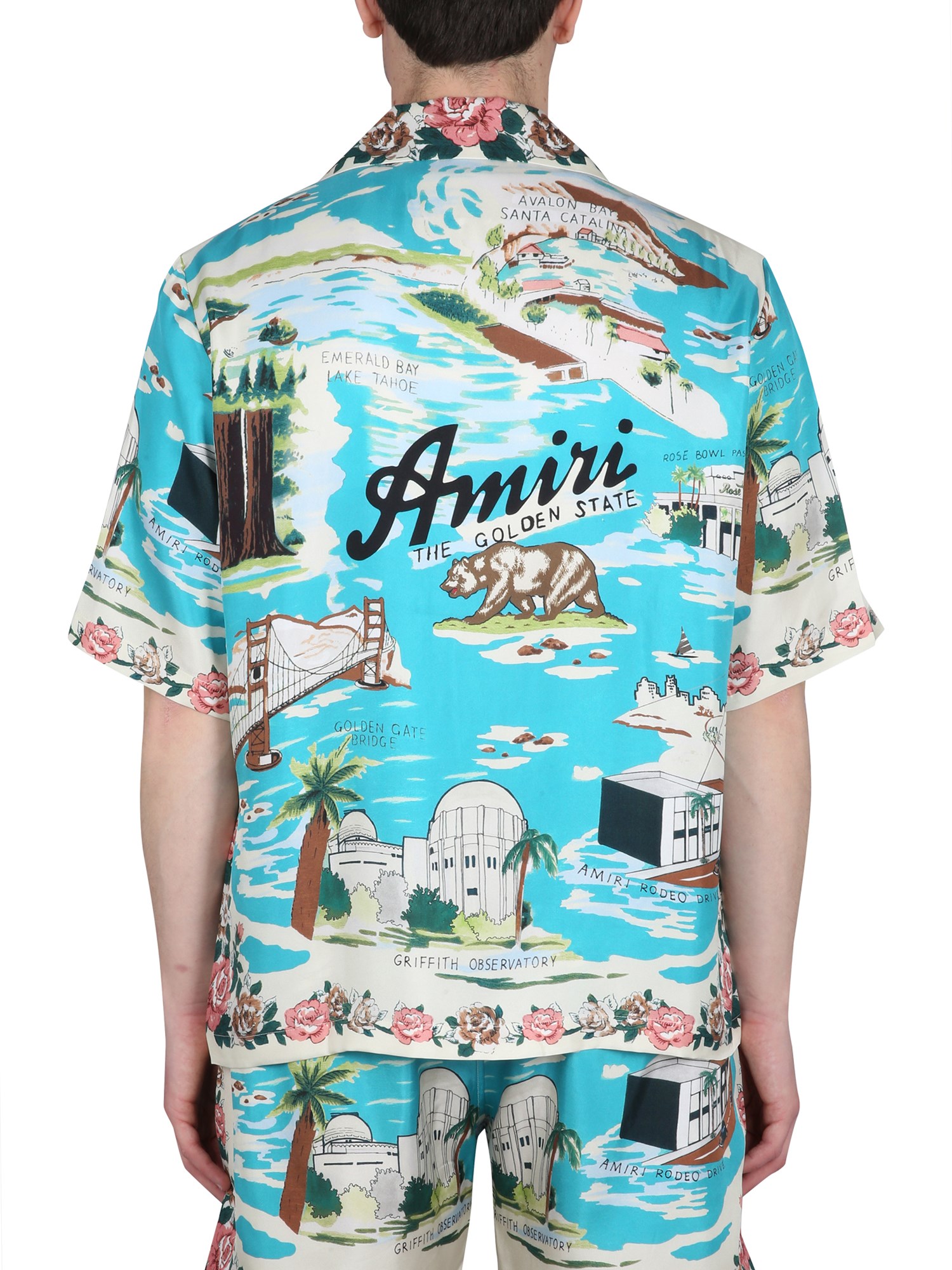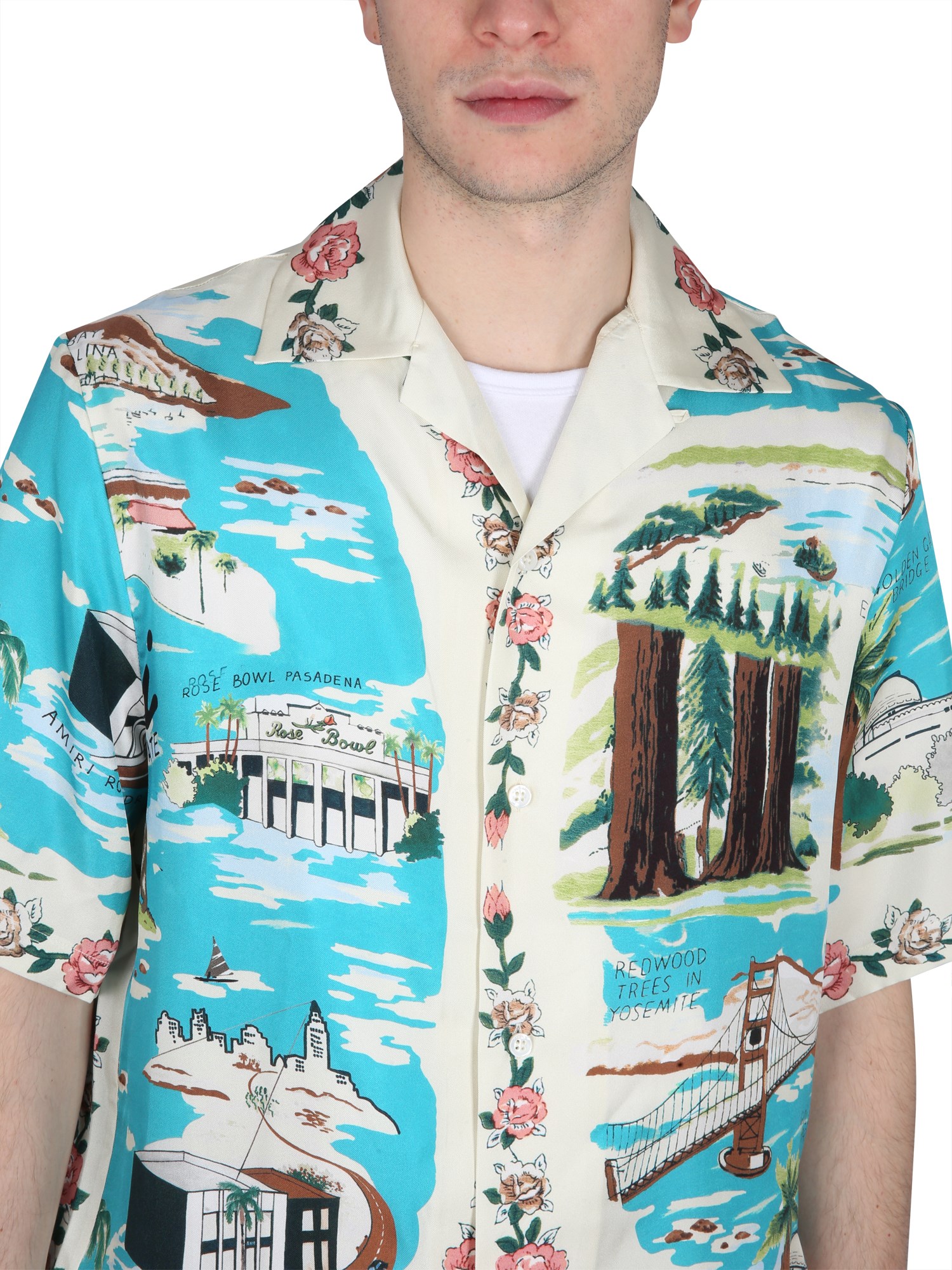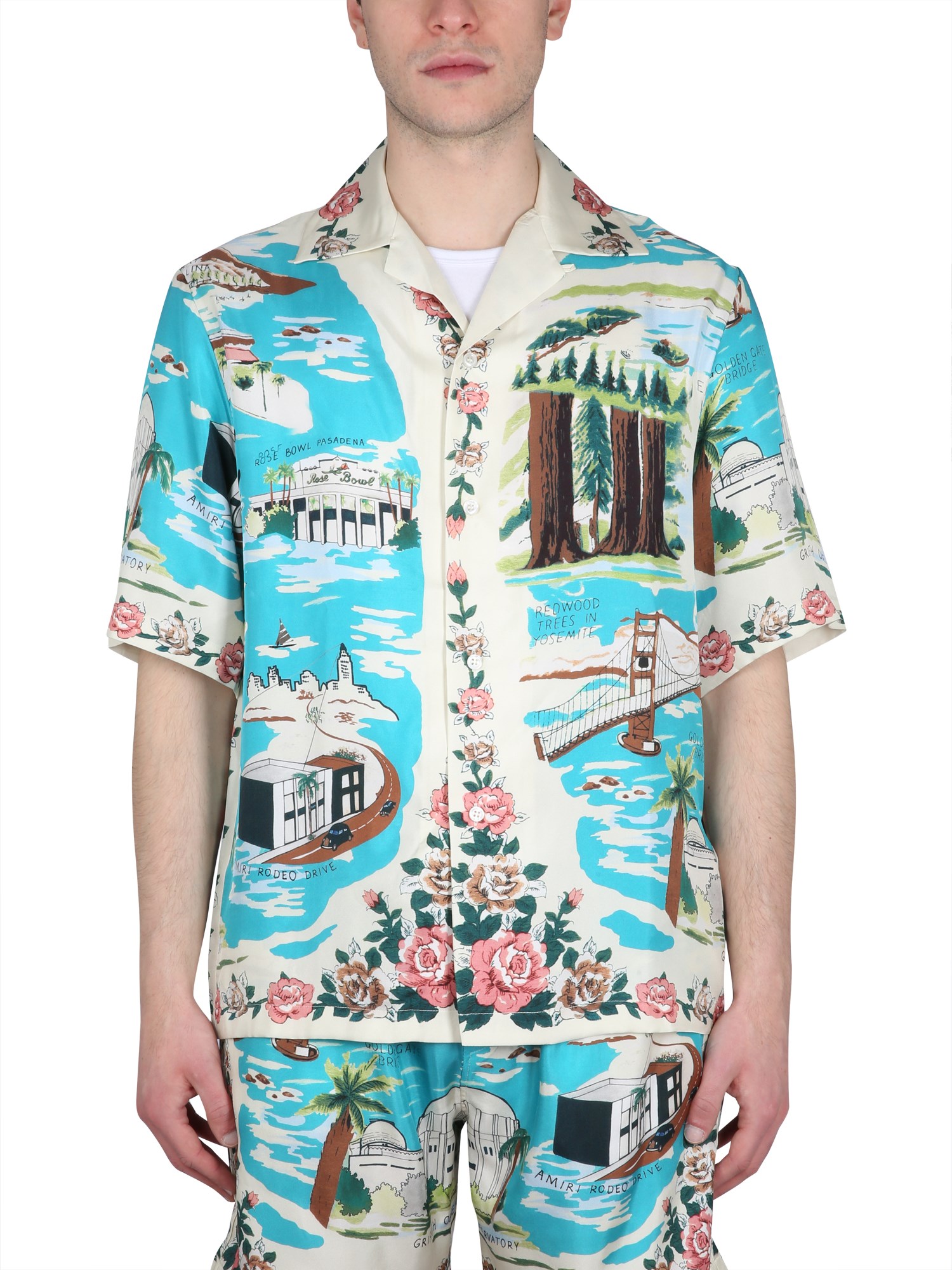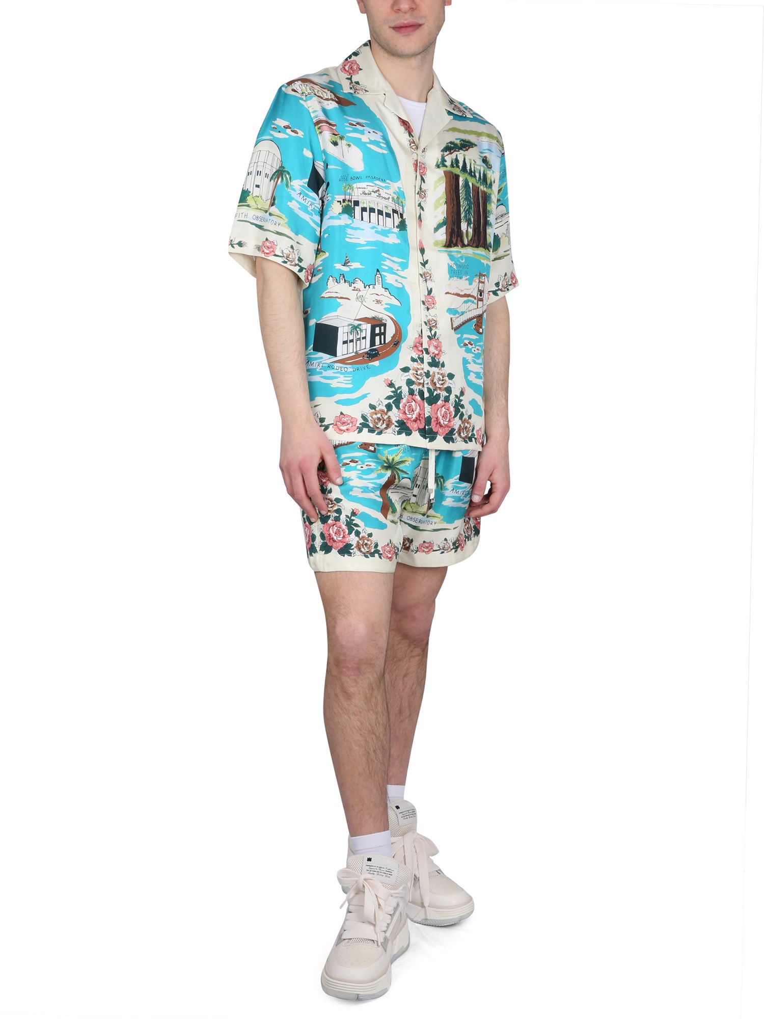 This is a relaxed fit shirt from Amiri with a silk Hawaii print. The front button closure classic collar and all-over logo print makes this shirt stylish and easy to wear. The cotton and silk fabric blend is lightweight, soft, and comfortable. This shirt is perfect for any occasion and can be worn with a pair of jeans or shorts.