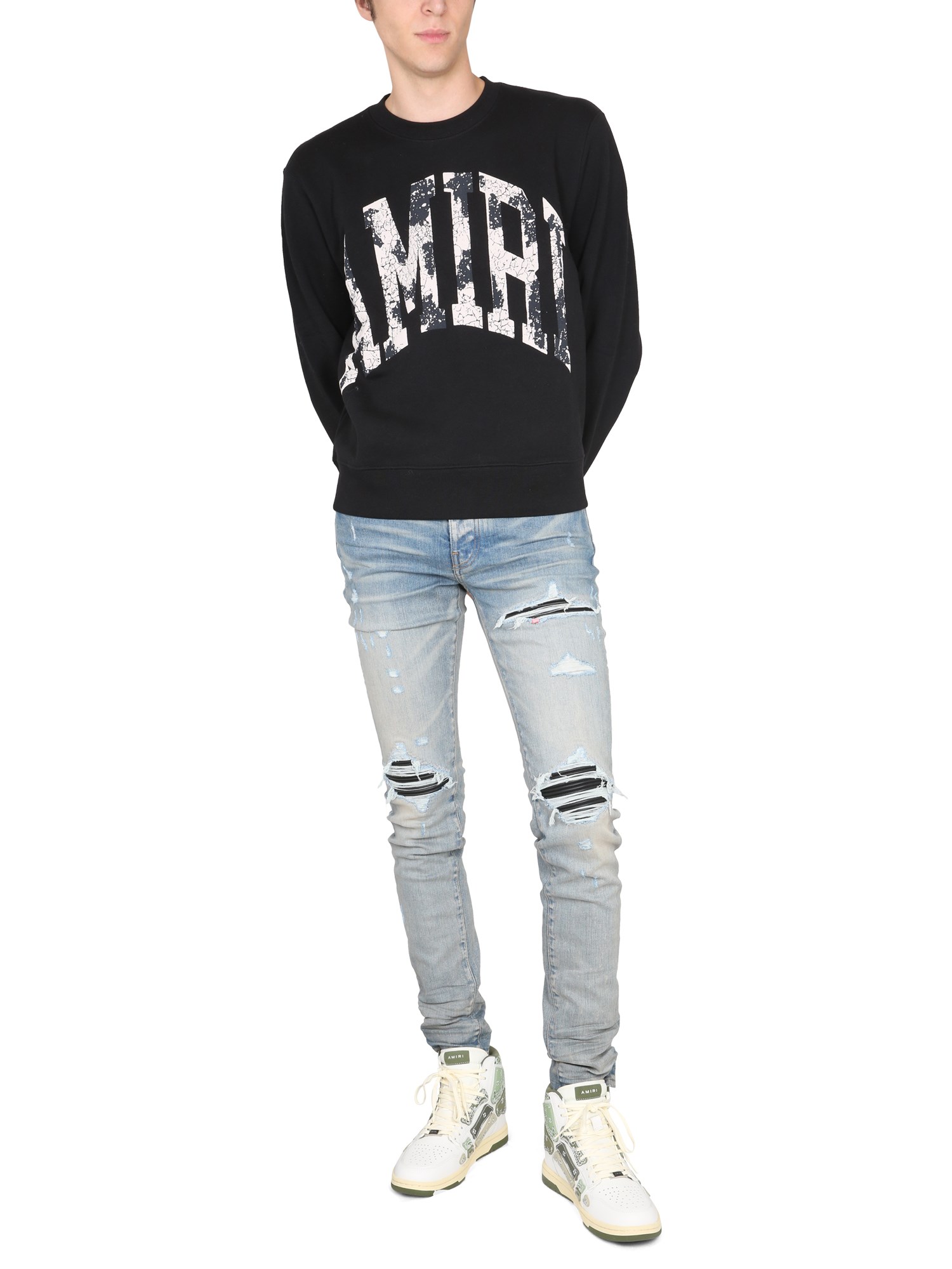 With a subtle difference, this “Collegiate” sweatshirt from Amiri is more modern than traditional. With a relaxed fit and a relaxed design, it's great for any activity. The pullover has a cotton blend fabrication and ribbed collar, cuffs, and bottom. The sweatshirt has printed detail on the front.