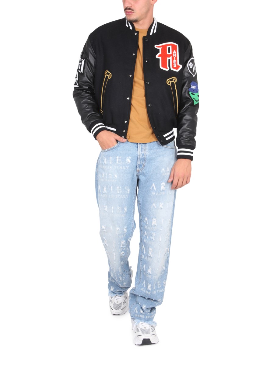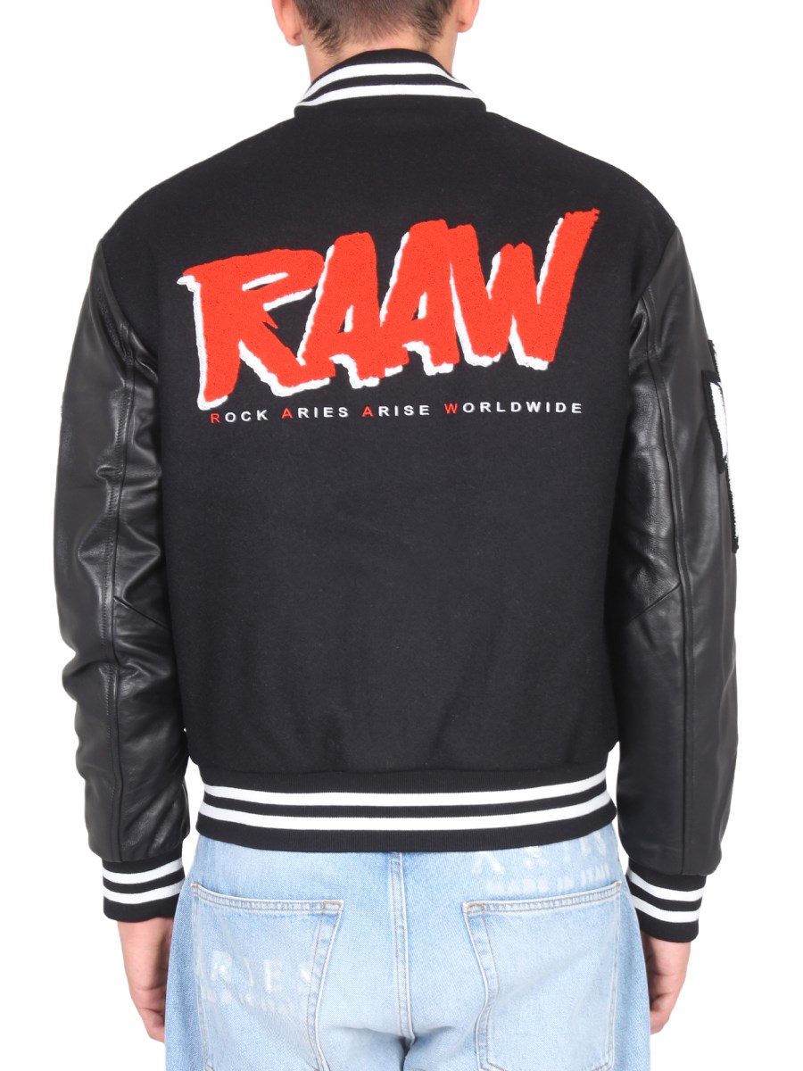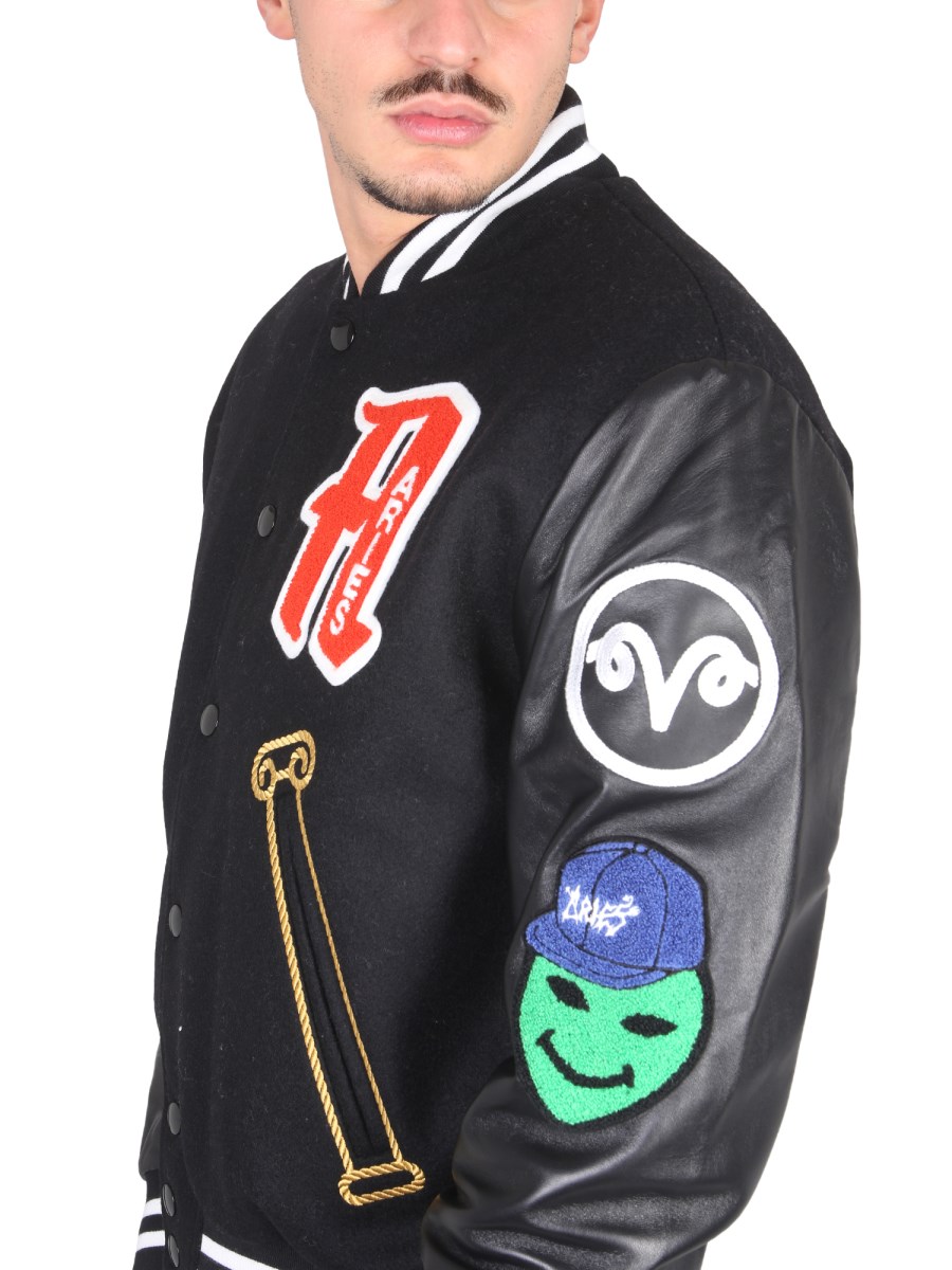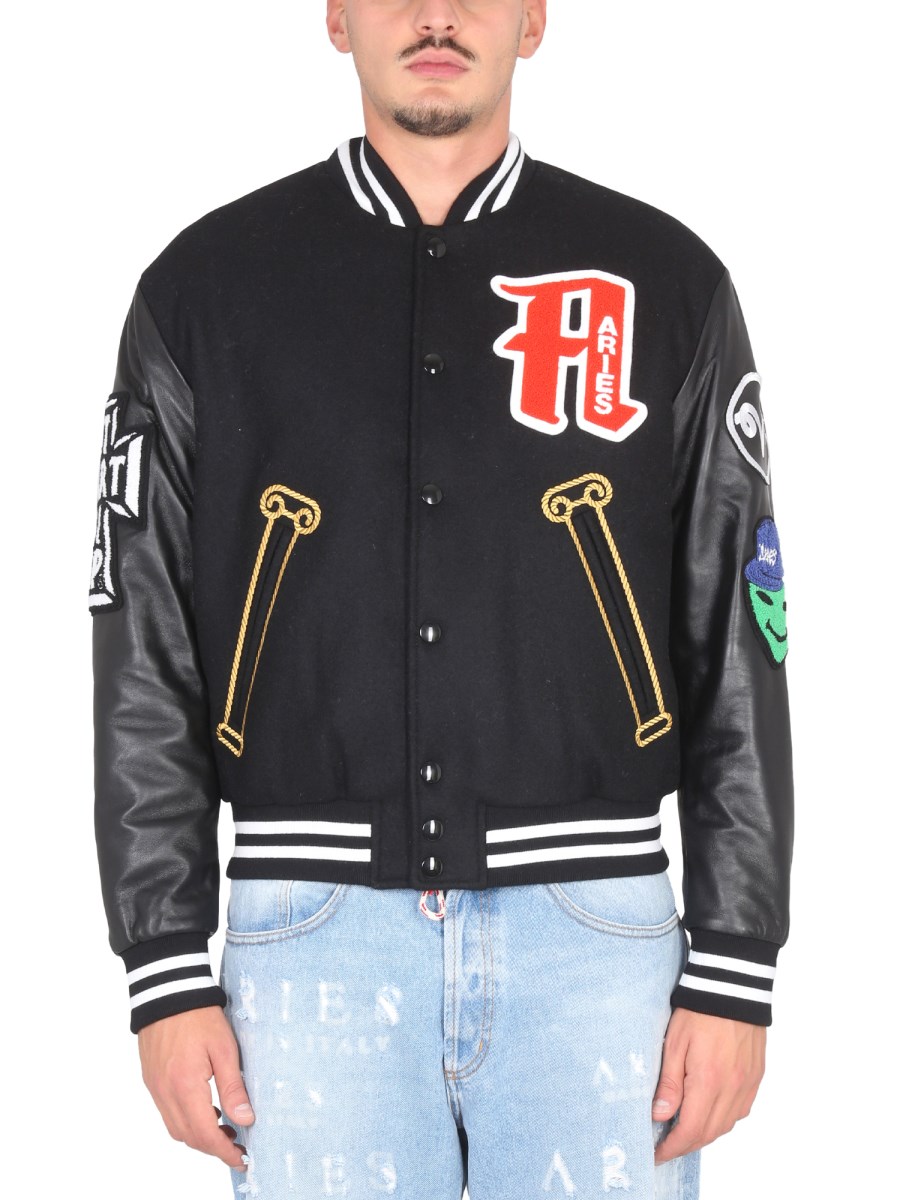 The wool varsity jacket from Aries is a classic piece of outerwear. It is made of 100% wool and has a dark black colour. It has a snap button closure in the front and two side pockets. The jacket also has a warm, wool-lined hood with a drawstring. The varsity jacket is a classic piece that can be worn with any look.
