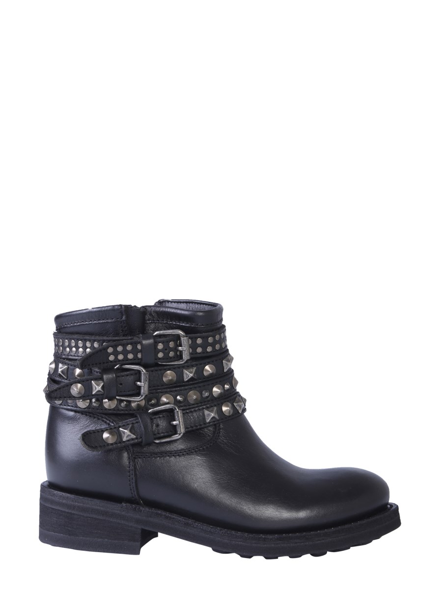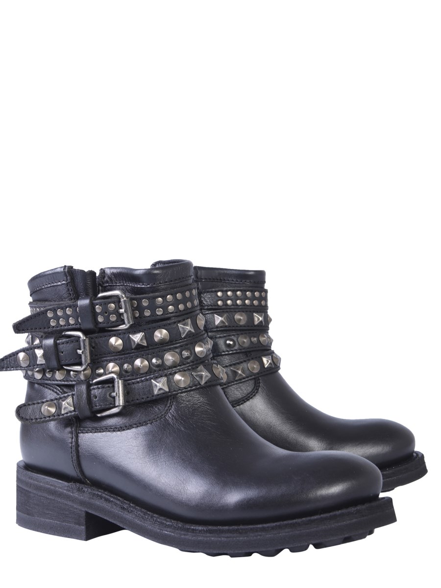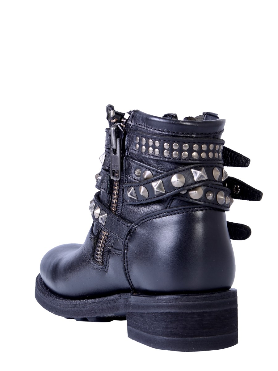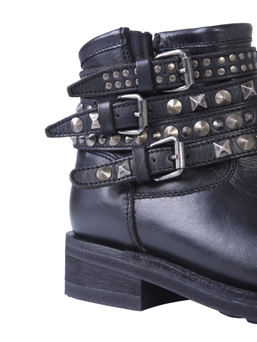 This winter season add these Camperos Tatum boots offered by the house of Ash to your footwear collection. These leather boots have a streamlined body with a side zip closure. It also showcases double adjustable studded strap with buckle on one side. Combined with a black jeans and a leather jacket, it will give you a stunning look.