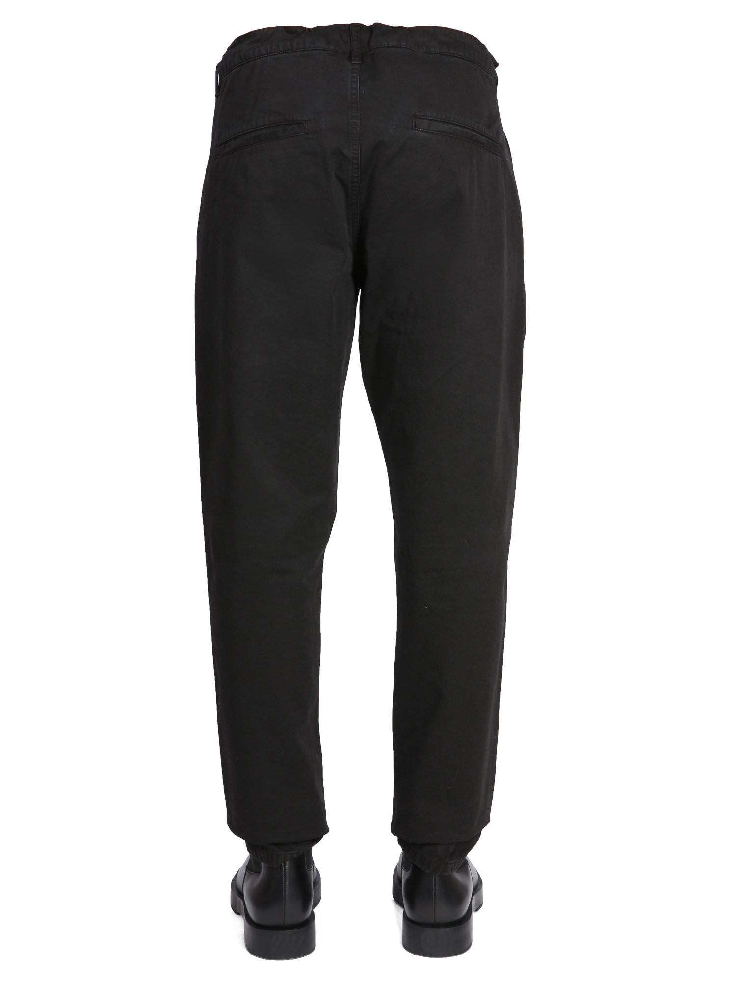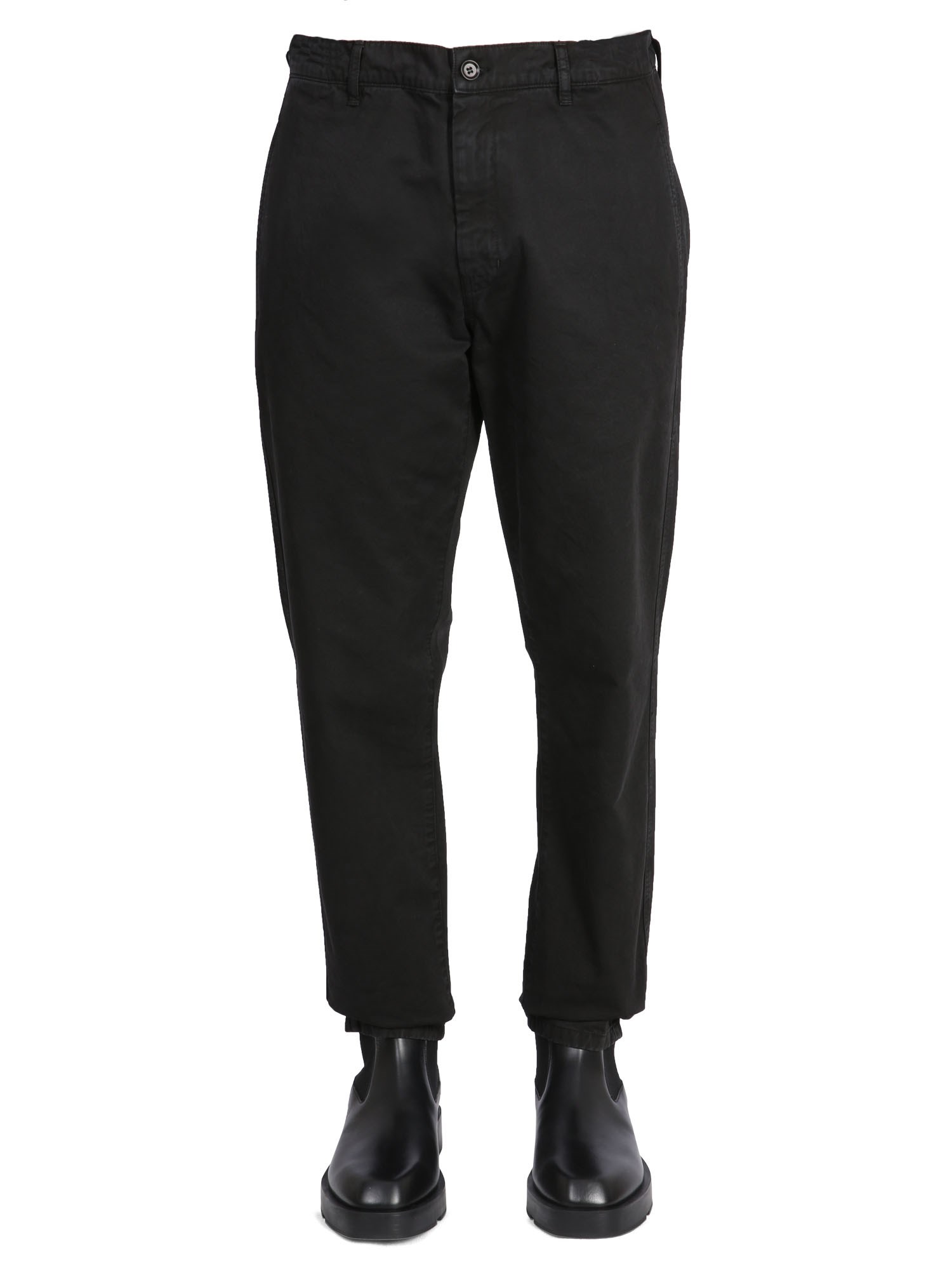 The cotton chino trousers from Aspesi are an essential item for any man's wardrobe. These trousers are made of a cotton chino fabric that is perfect for any season. It has a zipper and button closure, belt loops at the waist, two side pockets, and two back pockets. The cotton chino fabric is lightweight and has a soft, comfortable feel.