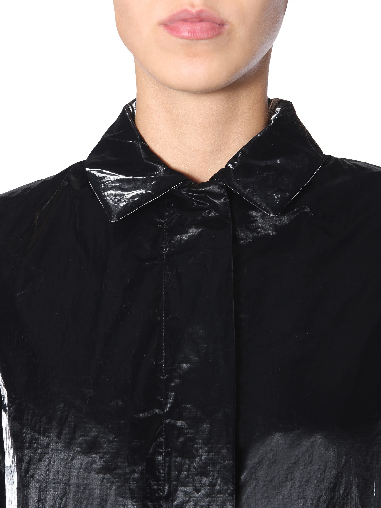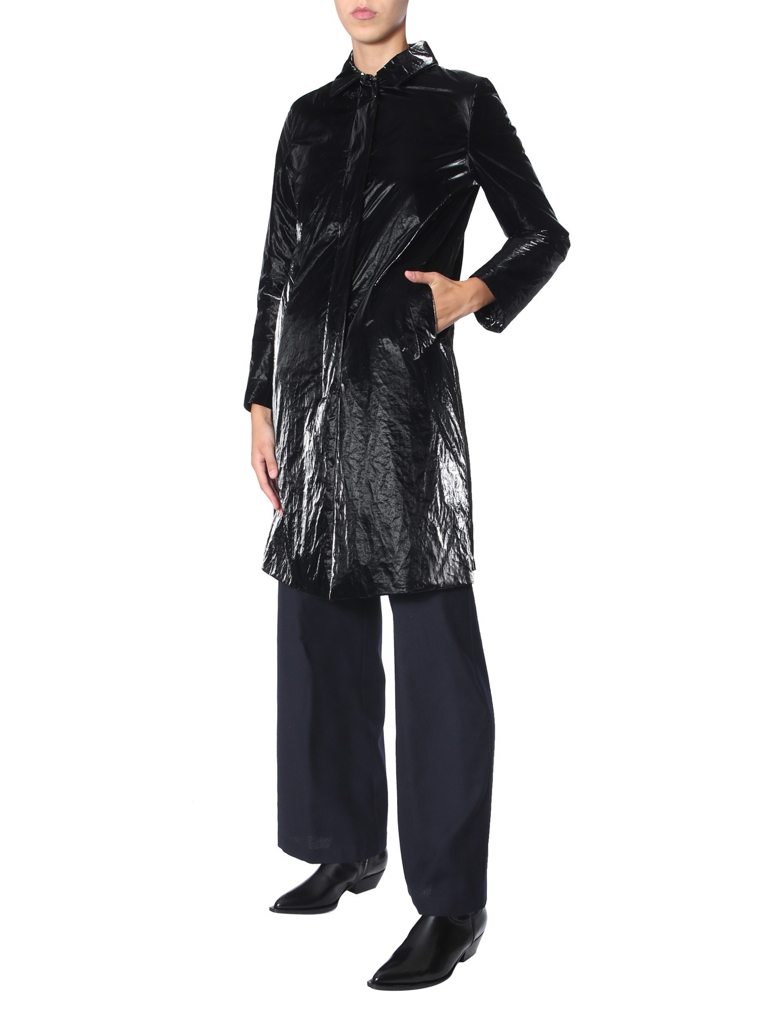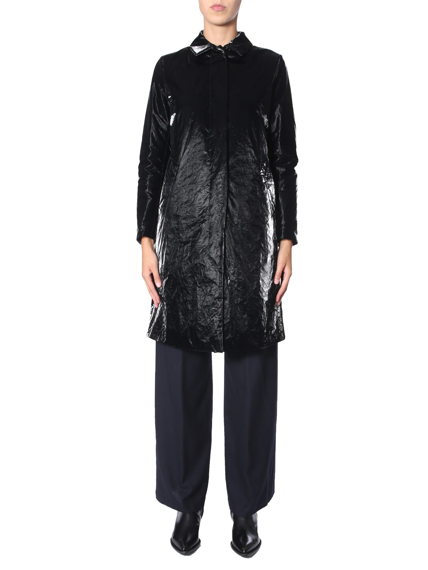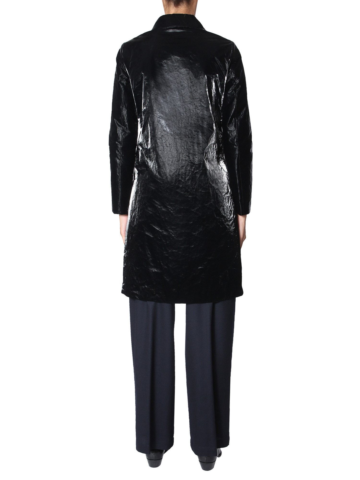 The 33 RPM velvet effect laminate coat from Aspesi adds elegance to your outfit with its soft texture. The coat is made with a blend of 65% polyester and 35% Tyvek for breathability, water-resistance, and durability. Its waterproof property makes the coat ideal for monsoon season. It includes an inner and two side pockets for functionality.