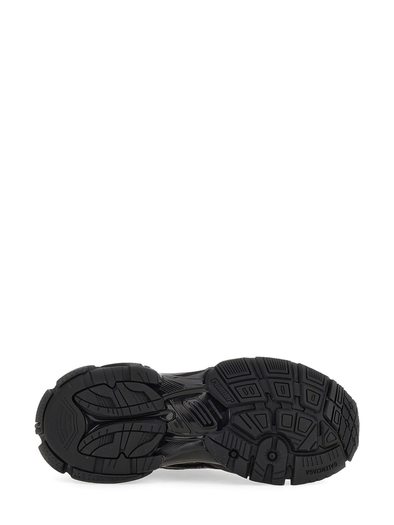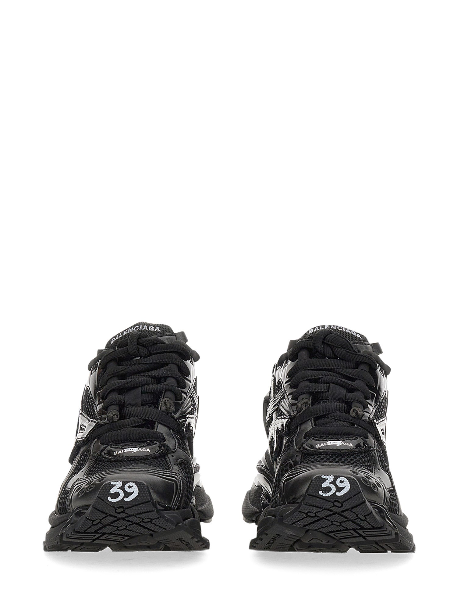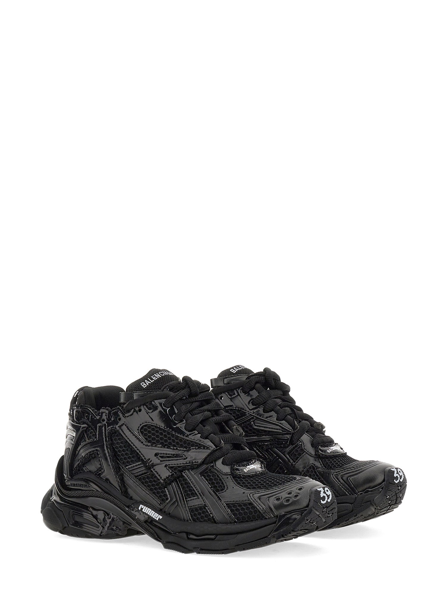 The "Runner" sneaker from the house Balenciaga is a performance sneaker that's designed for running but is equally comfortable for everyday wear. It has a mesh and nylon upper, rubber sole, and an embroidered logo on the tongue and printed on the back. The sneakers have a pull-on back loop and size imprinted on the toe and back.
